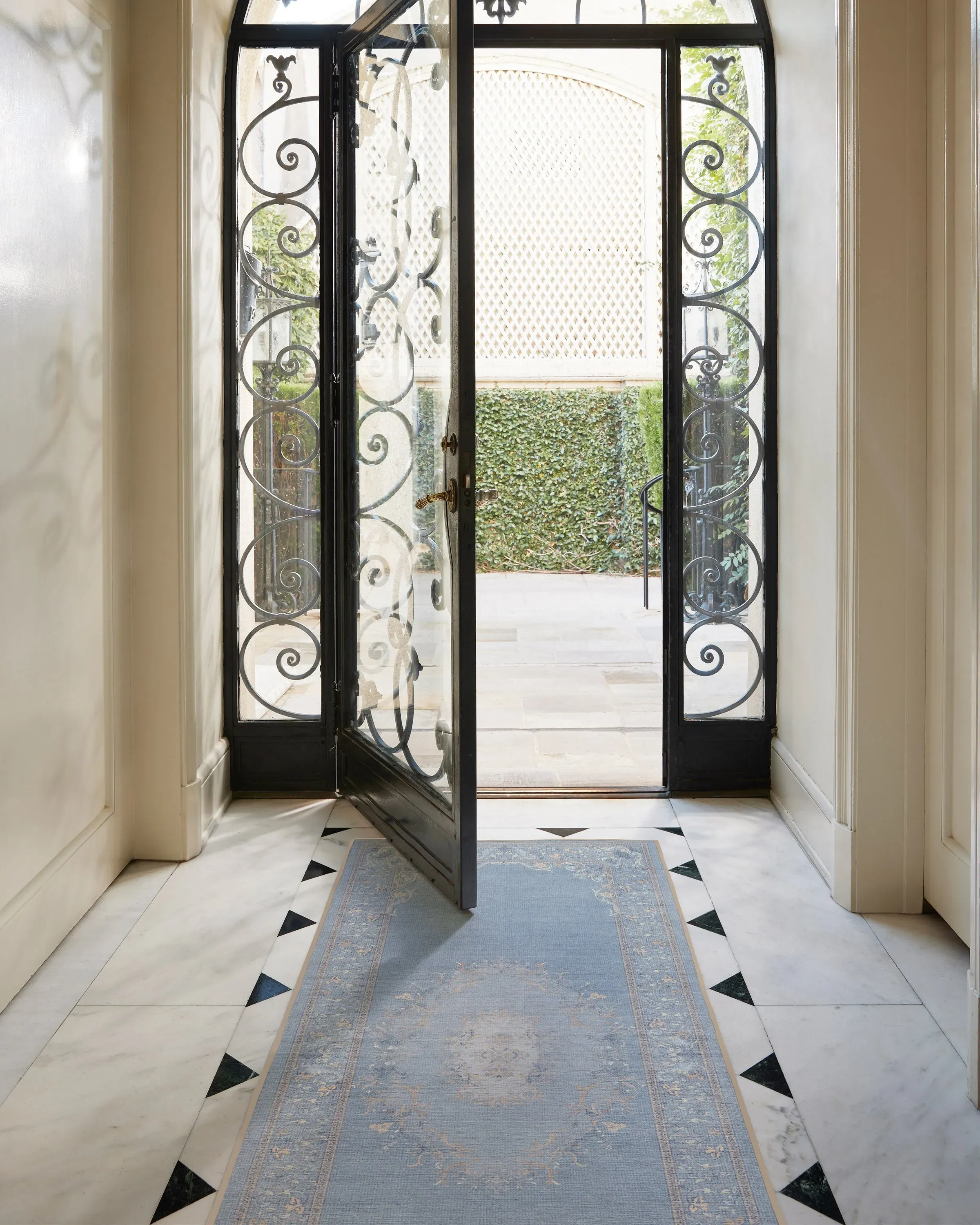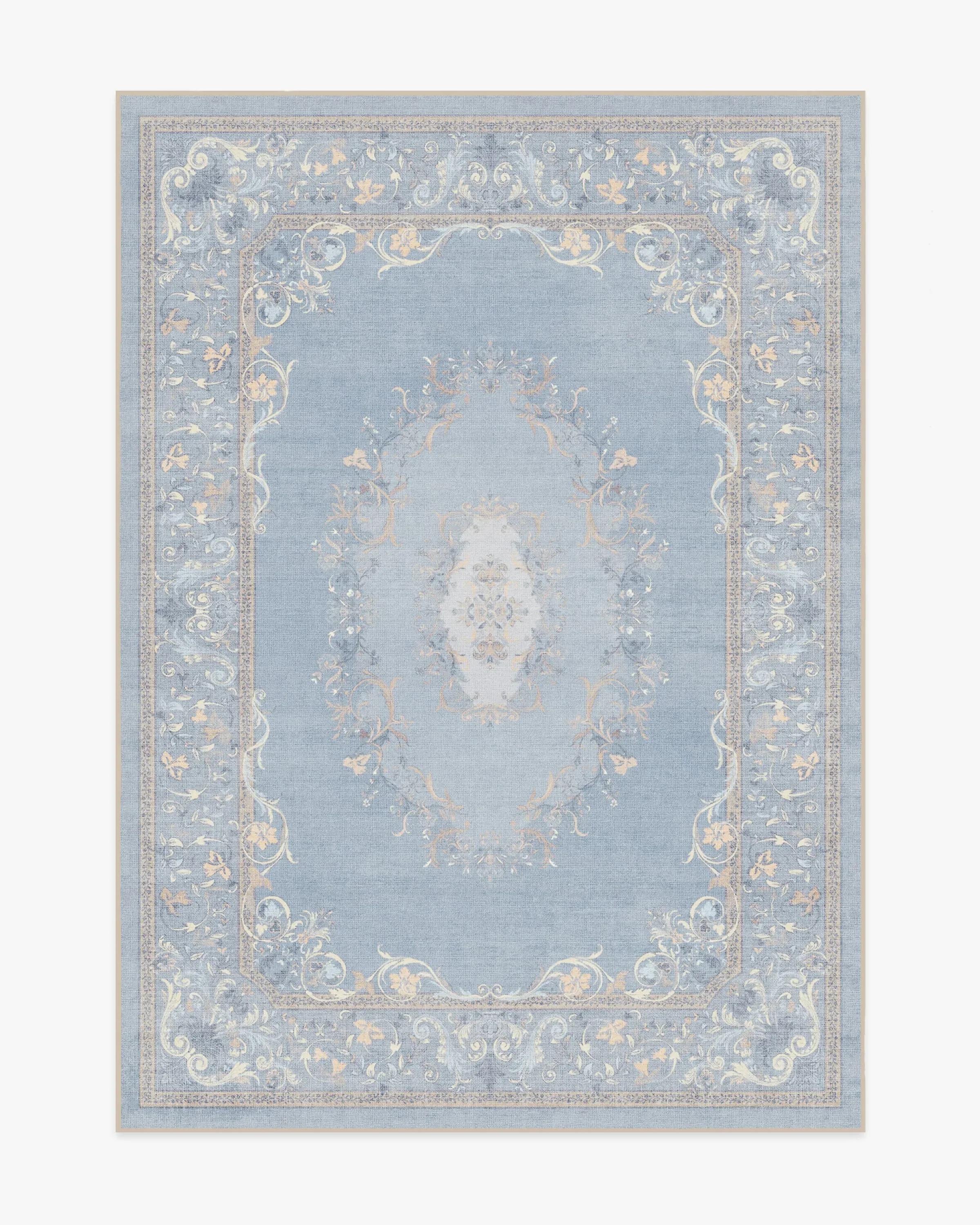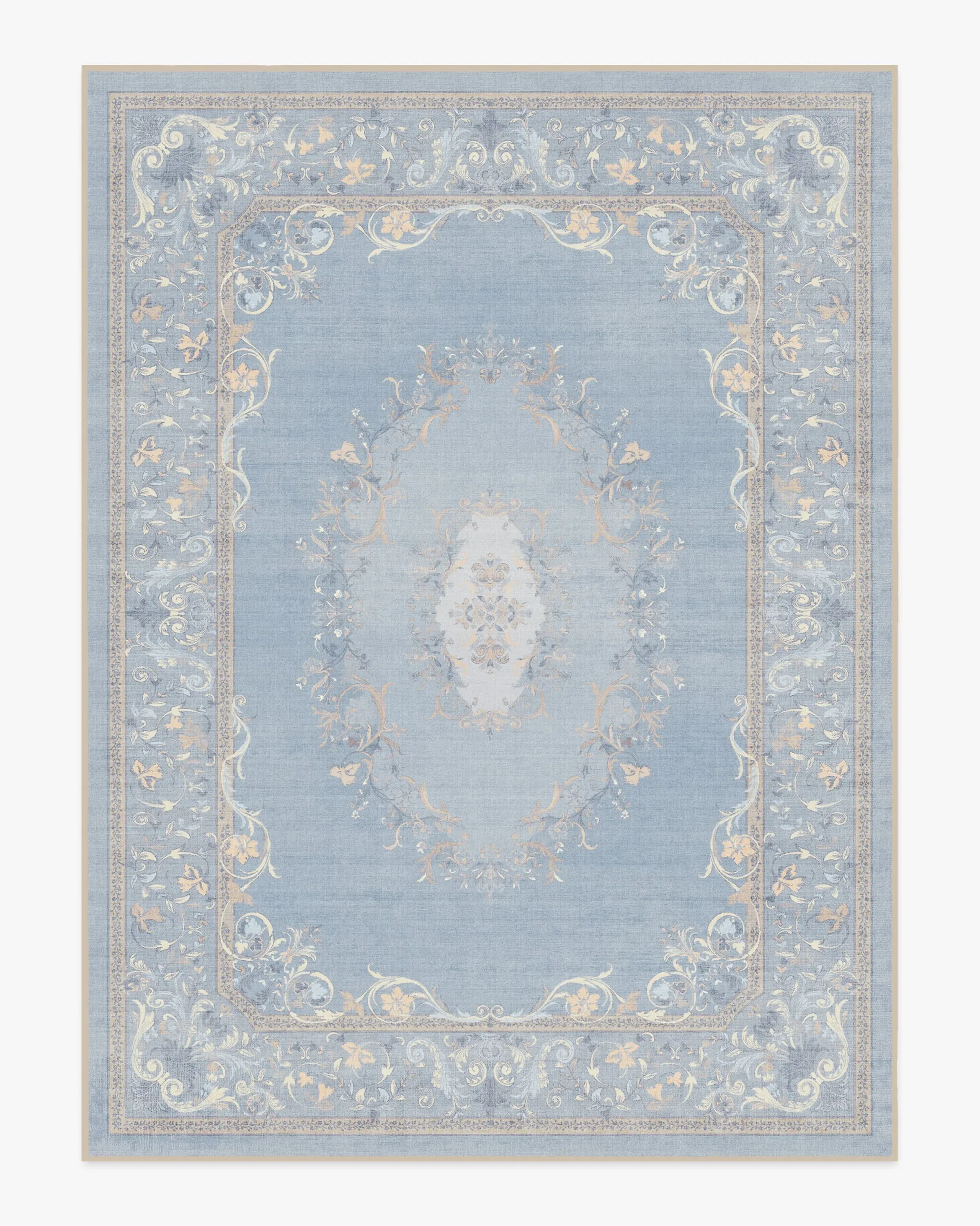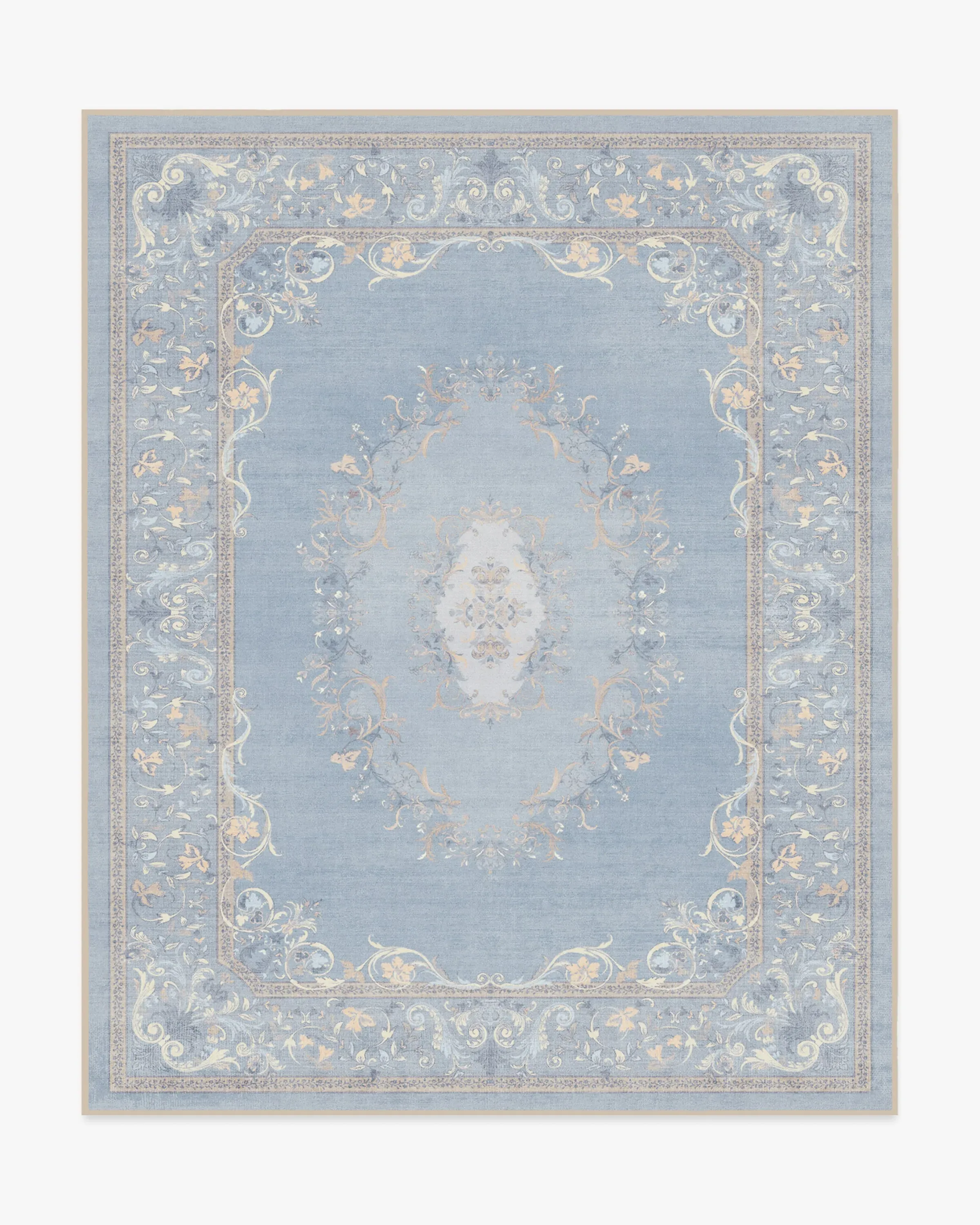 Bring home Regency-inspired charm with our Bridgerton Lady Whistledown Soft Blue Rug. This highly embellished design features subtle, ornate crowns and romantic floral motifs. It embodies the look and feel of a heavily distressed vintage rug, with a soft blue background serving as the canvas for warm cream, purple, and dusty blue flowers. Water-resistant, stain-resistant, and machine-washable. Rug colours may vary slightly according to your device and the lighting in your space. 60x90 | Machine Washable Area Rug | Kid & Pet Friendly | Indoor Rugs | Lady Whistledown Soft Blue Flatwoven Rug by Bridgerton | Ruggable