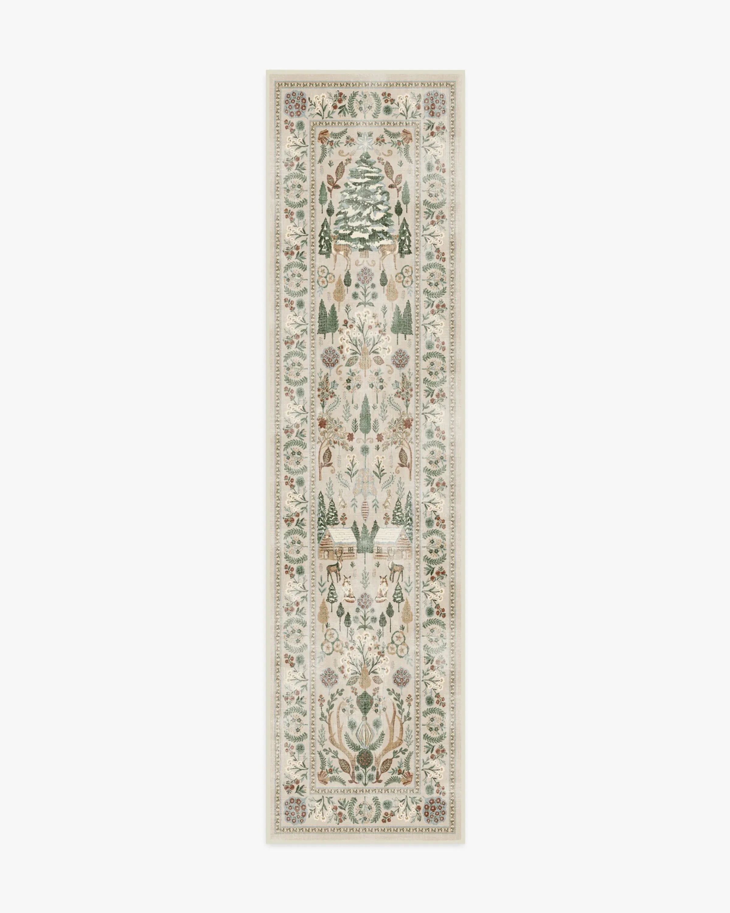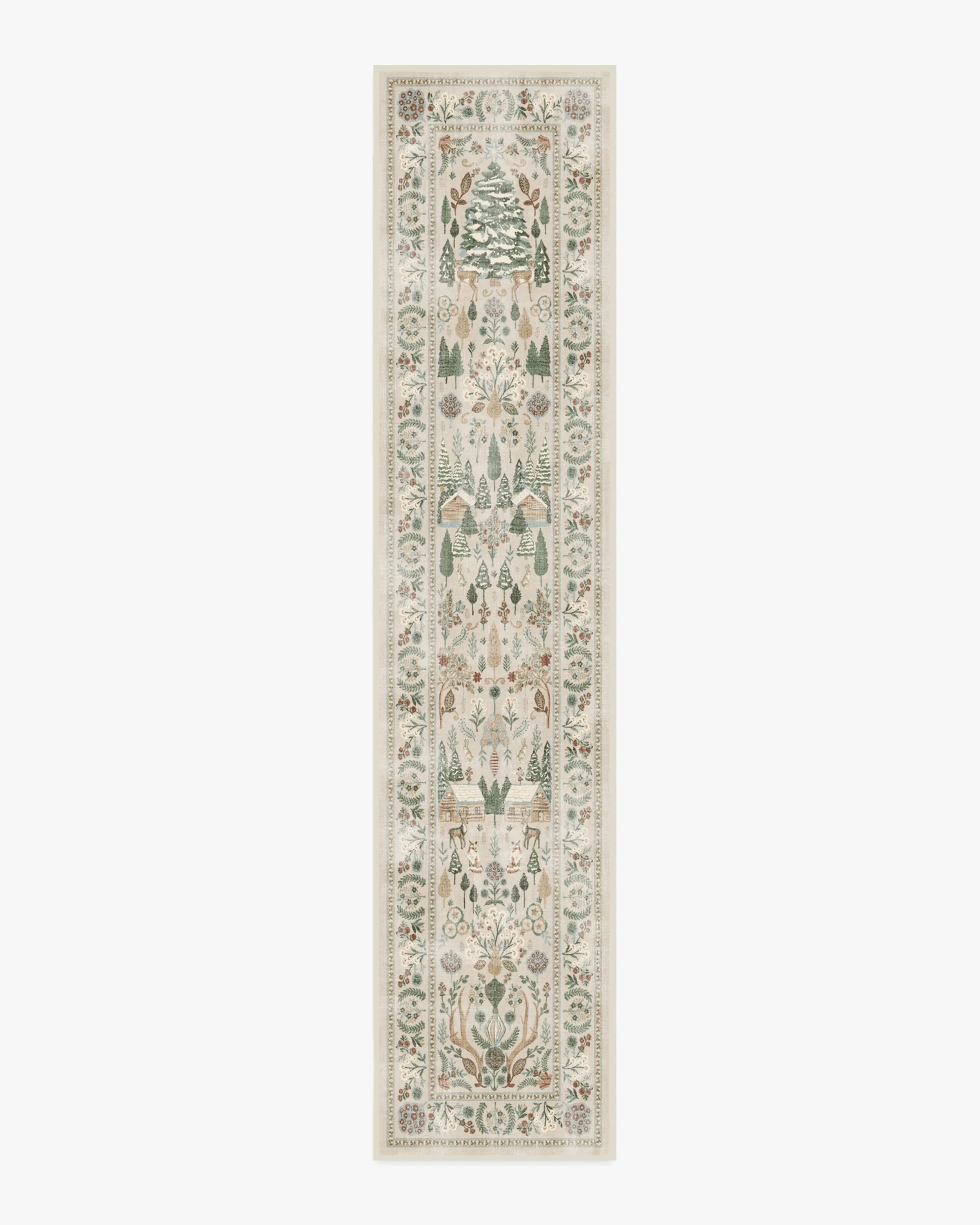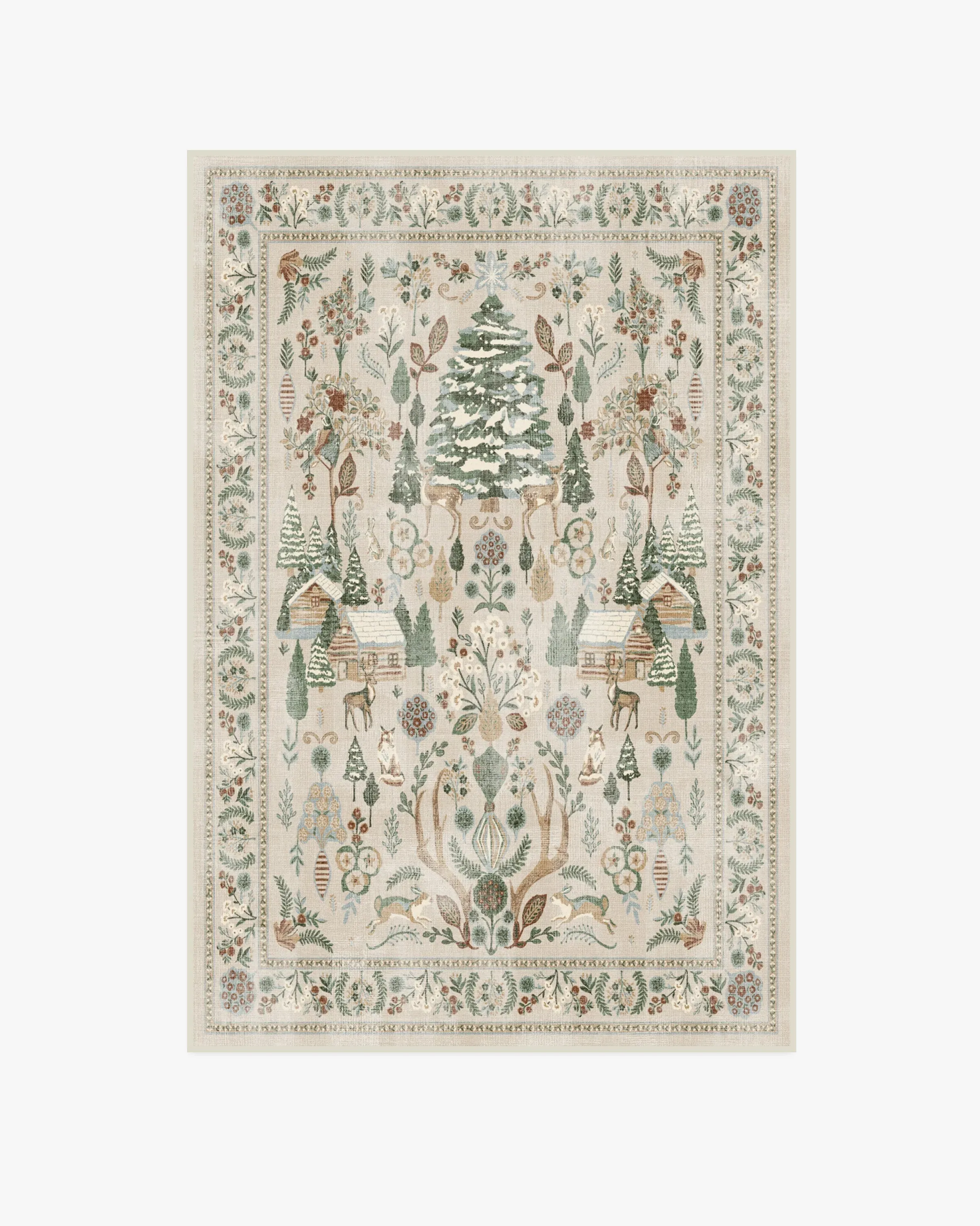 Step into a whimsical wonderland with our Juniper Neutral Multicolour Rug. This cottagecore-inspired tapestry design features pine trees, winter animals, log cabins, and pretty foliage. The warm neutral background is adorned with soft, vintage greens and reds, accented by pops of cream and gold. Water-resistant, stain-resistant, and machine-washable. Rug colours may vary slightly according to your device and the lighting in your space. 60x90 | Machine Washable Area Rug | Kid & Pet Friendly | Indoor Rugs | Juniper Neutral Rug | Ruggable