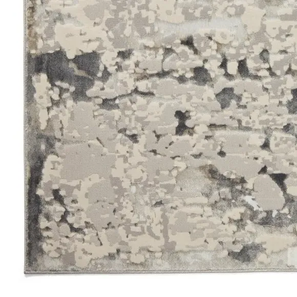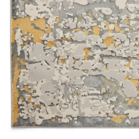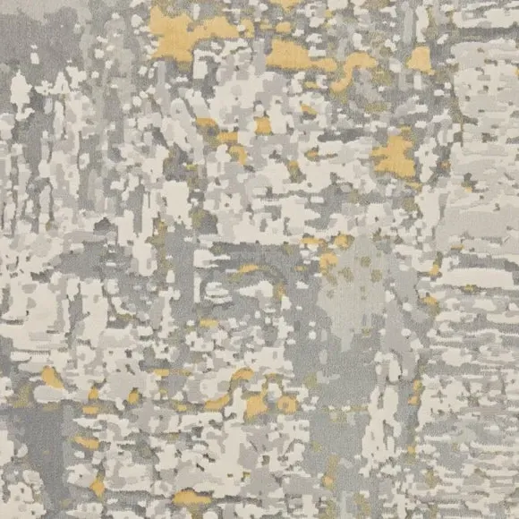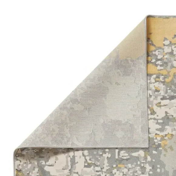 The rug combines modern abstract design with metallic effect yarn, creating visual depth through its multi-textured pile. Its polyester construction provides stain-resistant properties, while the machine-made craftsmanship ensures consistent quality and durability. The textured surface adds tactile interest, and the robust material withstands daily use in busy areas.