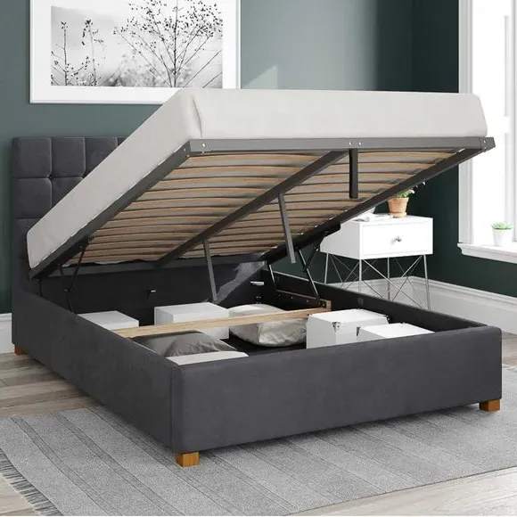 The Ottoman Bed combines luxurious comfort with practical storage, featuring a square buttoned headboard with deep padding. Its gas lift mechanism provides hands-free access to the large storage compartment, while the fabric dust protection sheet keeps belongings clean. The spring slat system offers enhanced support for restful sleep, and the solid hardwood feet ensure stability and durability.