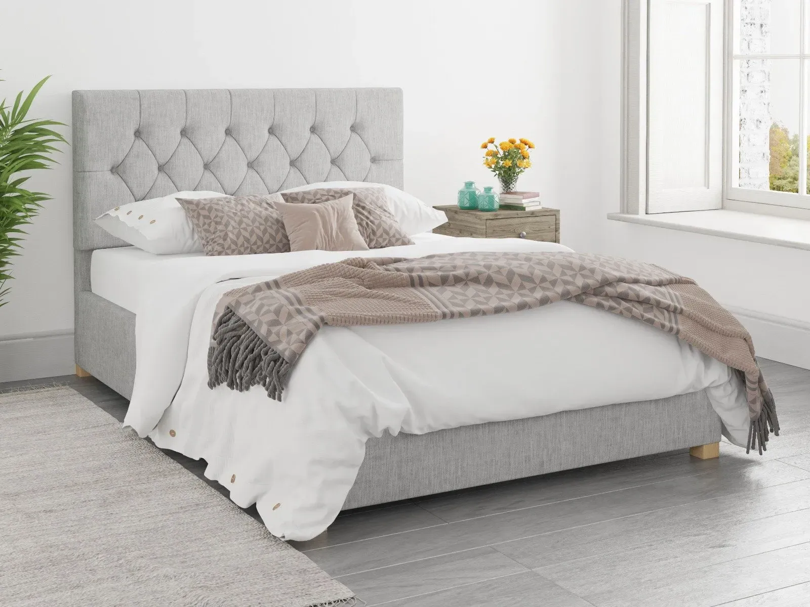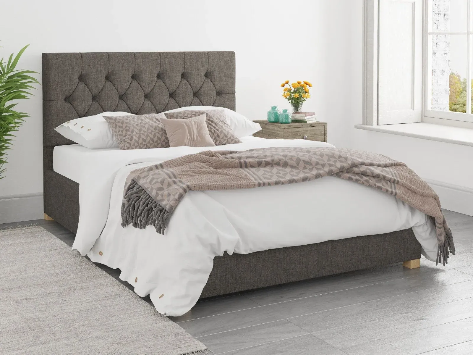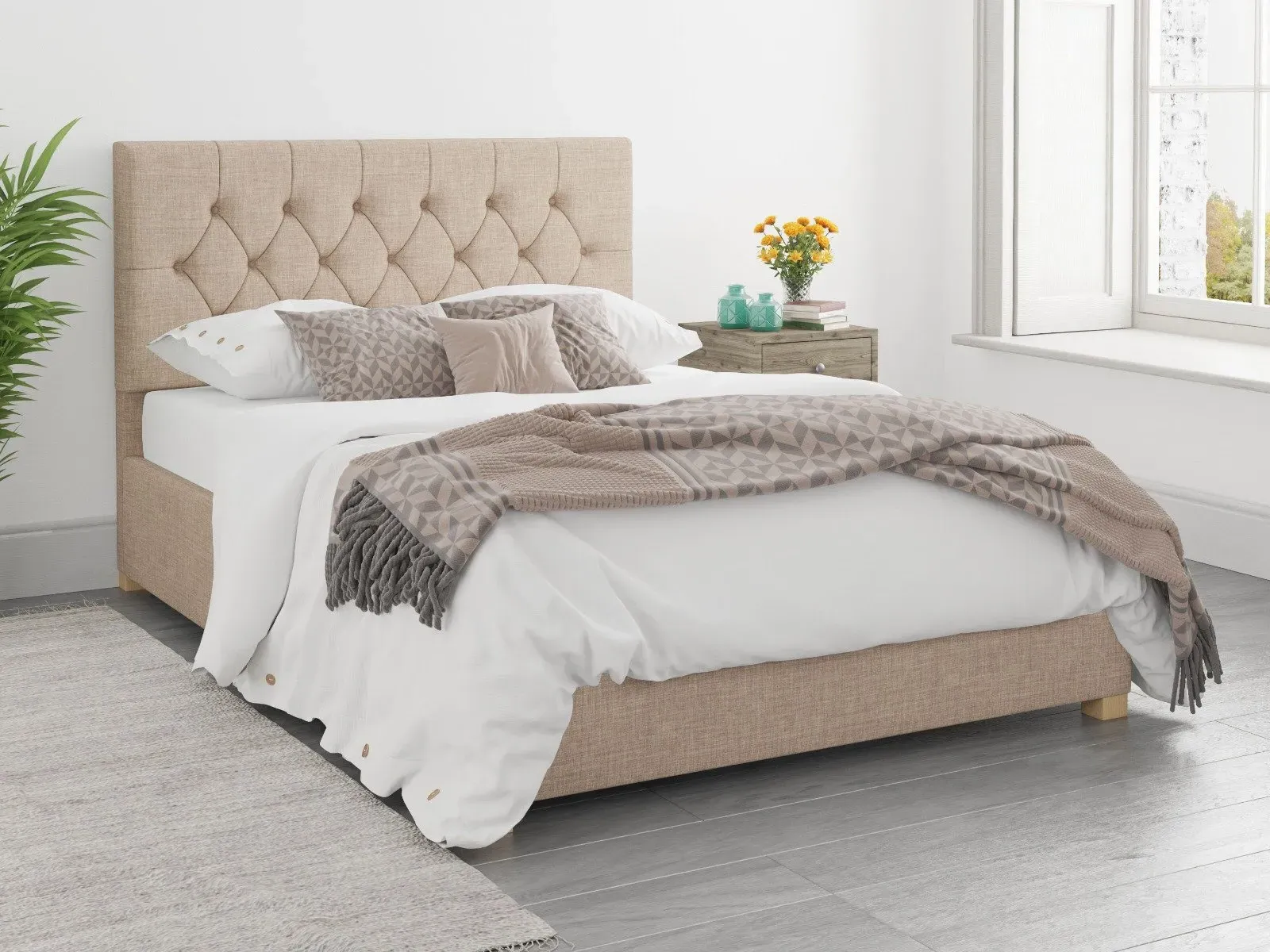 The Ottoman Bed combines generous storage with a deep foam padded headboard, featuring chunky upholstered panels and hand carved wooden feet. Its gas piston mechanism provides effortless lifting access to the large storage compartment, while quality sprung slats with multi-layer construction enhance comfort and mattress durability. The chesterfield-inspired headboard offers deep padding for comfortable reading, and the hand varnished hardwood feet add lasting stability. W91 x D209 x H106.5 cm.