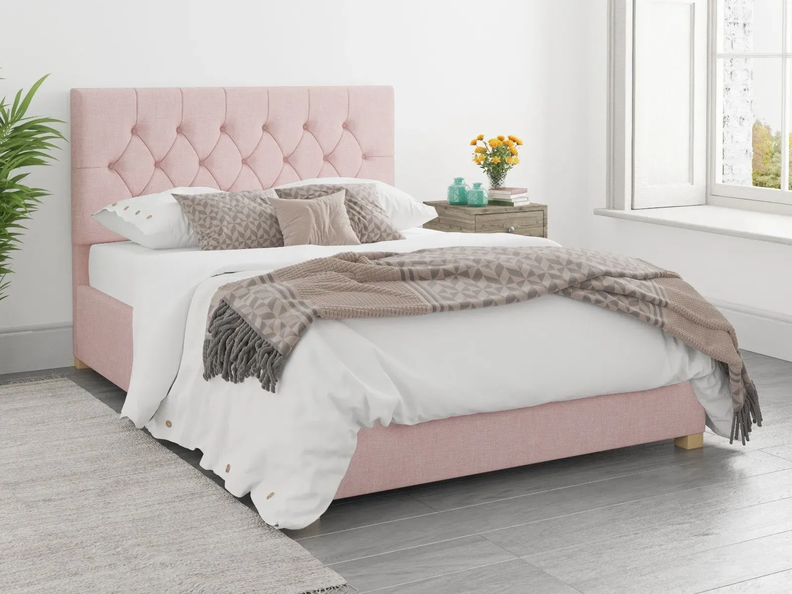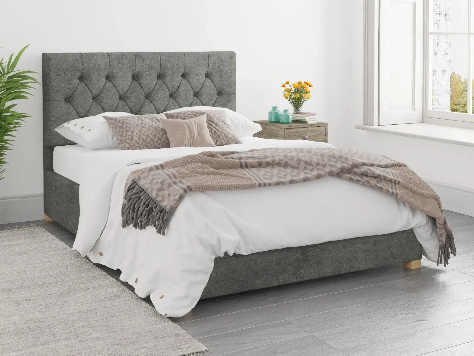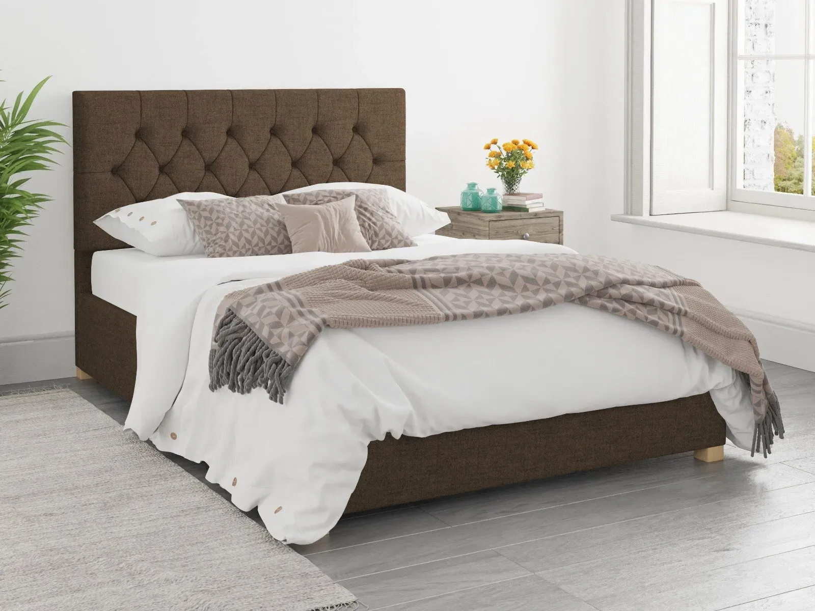 The Ottoman Bed combines generous storage with a deep foam padded headboard, featuring chunky upholstered panels and hand carved wooden feet. Its gas piston mechanism provides effortless lifting access to the large storage compartment, while quality sprung slats with multi-layer construction enhance comfort and mattress durability. The chesterfield-inspired headboard offers deep padding for comfortable reading, and the hand varnished hardwood feet add lasting stability. W91 x D209 x H106.5 cm.