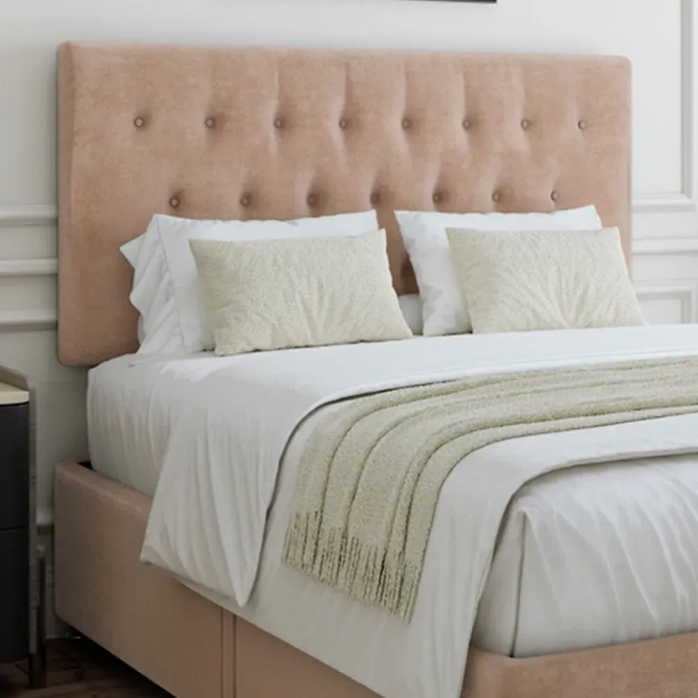 The divan base offers solid platform support with its firm foundation design, featuring a matching Lona headboard. Its universal construction allows flexible headboard placement on any side, while the chrome fittings and gliders add durability and smooth operation. The Naples linen upholstery provides comfort and style, and the platform top ensures reliable mattress support.