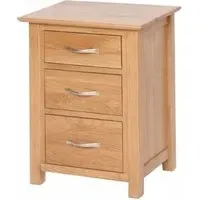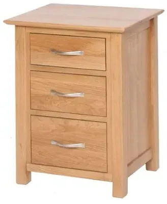 The Appleby Oak 3 Drawer Bedside Cabinet features North American White Oak with a light lacquer finish that highlights the natural wood grain. Its compact design suits smaller spaces while providing three drawers for organized storage of bedside essentials. The smooth-gliding drawers ensure easy access, and the sturdy oak construction guarantees long-lasting use. W 45cm x D 38cm x H 60cm.