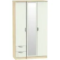 The Camden wardrobe provides flexible storage solutions with its three-door layout and right-positioned drawer configuration, enhanced by an integrated mirror. Its high gloss cashmere front delivers a refined appearance, while the scratch-resistant vinyl surface maintains its quality over time. The two right-hand drawers include linen-effect interiors and smooth-running hardware for effortless access.