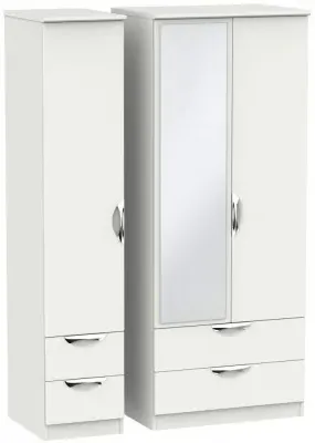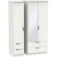 The Camden wardrobe combines practical storage with its three-door design, featuring a mirror door and two right-hand drawers. Its scratch-resistant vinyl finish provides durability, while the MDF construction ensures long-lasting quality. The wardrobe includes linen-effect drawer interiors and high-quality runners for smooth operation. Manufactured in Wales and delivered ready assembled for immediate use.