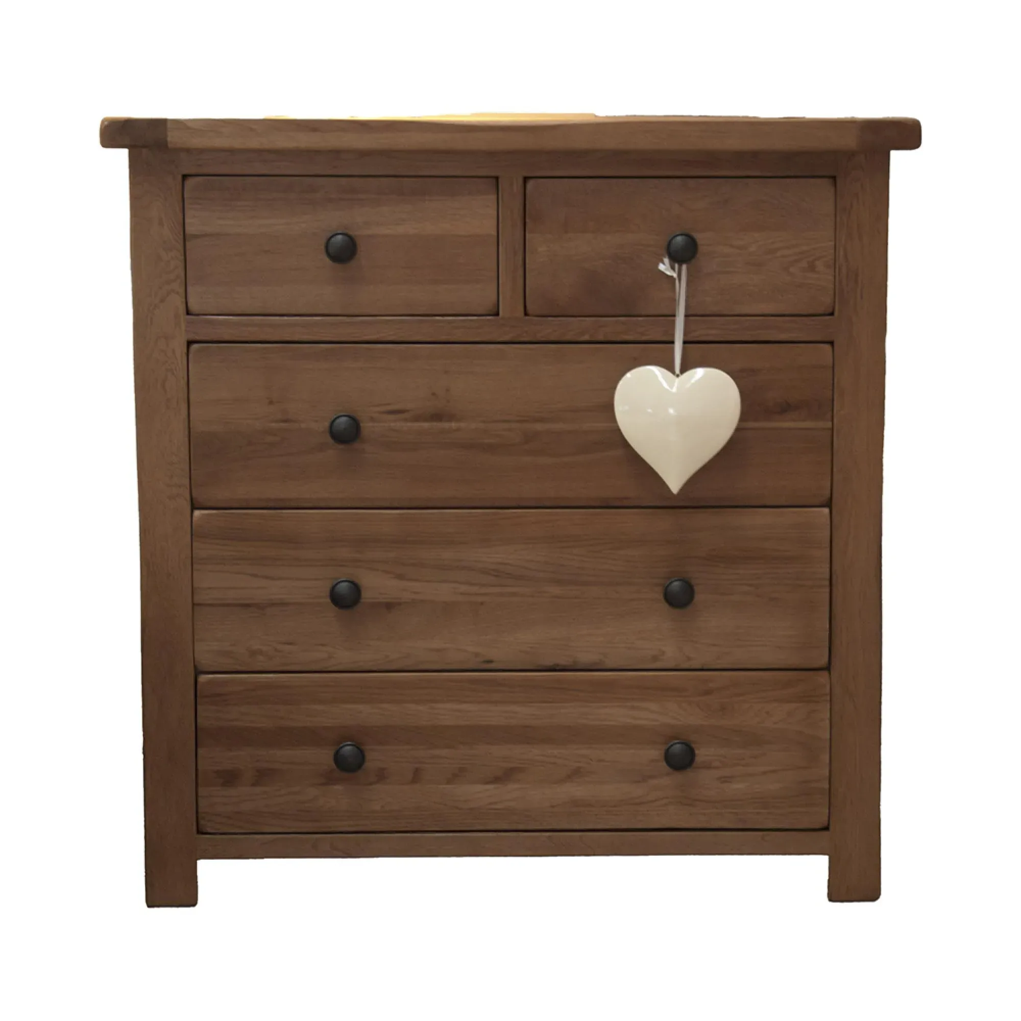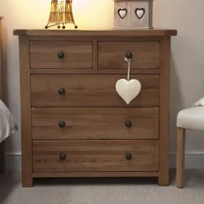 The Kingscote Oak 3+2 Drawer Chest combines natural oak construction with soft cotton painted accents for a distinctive two-tone finish. Its five-drawer configuration provides ample storage with three smaller drawers above and two larger drawers below. The solid oak construction ensures durability, while the painted elements add visual contrast and character to any space.