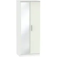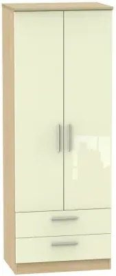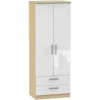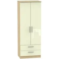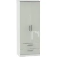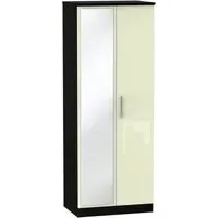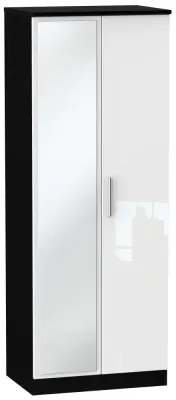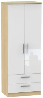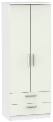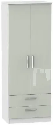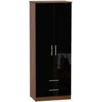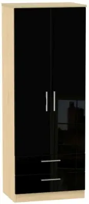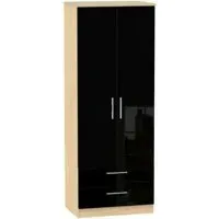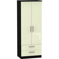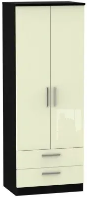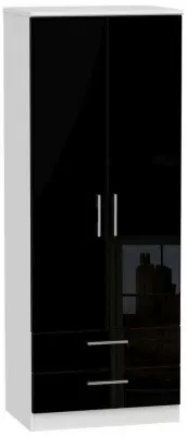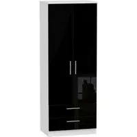 The Knightsbridge wardrobe offers versatile storage with its 2-door and 2-drawer design, finished in high gloss black. Its durable scratch-resistant vinyl surface withstands daily use, while the linen-effect drawer interiors provide an elegant detail. The tall configuration optimizes storage capacity, and the long-lasting runners ensure smooth drawer operation.