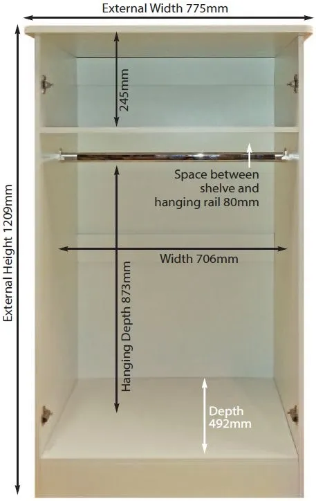The Knightsbridge wardrobe features high gloss cream fronts paired with a matt cream carcase for a warm, sophisticated look. Its 2-door configuration offers generous storage capacity, while the scratch-resistant vinyl finish maintains its appearance over time. Built from premium MDF in Wales, this midi wardrobe comes ready assembled for convenience.