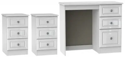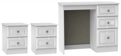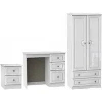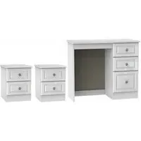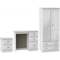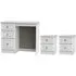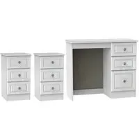 The Pembroke 3 Piece Bedroom Set offers practical storage solutions with its spacious dressing table and convenient 2-drawer bedside cabinet. Crafted from durable particle wood with a crisp white finish, the set provides both longevity and brightness to any room. The dressing table features ample surface space for grooming essentials, while the bedside cabinet keeps nighttime necessities within easy reach through its two drawers. Dressing table: W92.8 x D40 x H78.8 cm, Bedside cabinet: W39.5 x D40 x H49.8 cm.