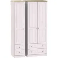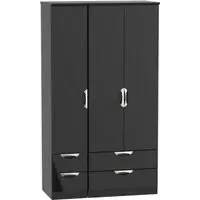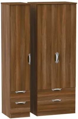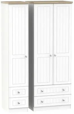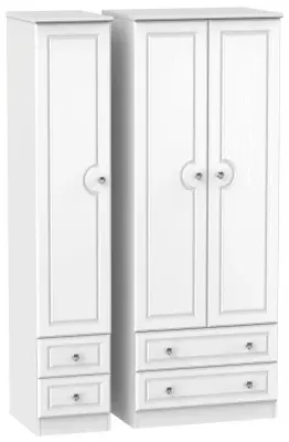 The Sherwood wardrobe provides comprehensive storage with its three doors and four drawers, delivered fully assembled from UK manufacturing. Its scratch-resistant vinyl finish ensures durability, while the linen-effect drawer interiors add an elegant touch. The quality-tested construction guarantees reliable performance, and the high-quality runners provide smooth drawer operation for everyday use.