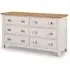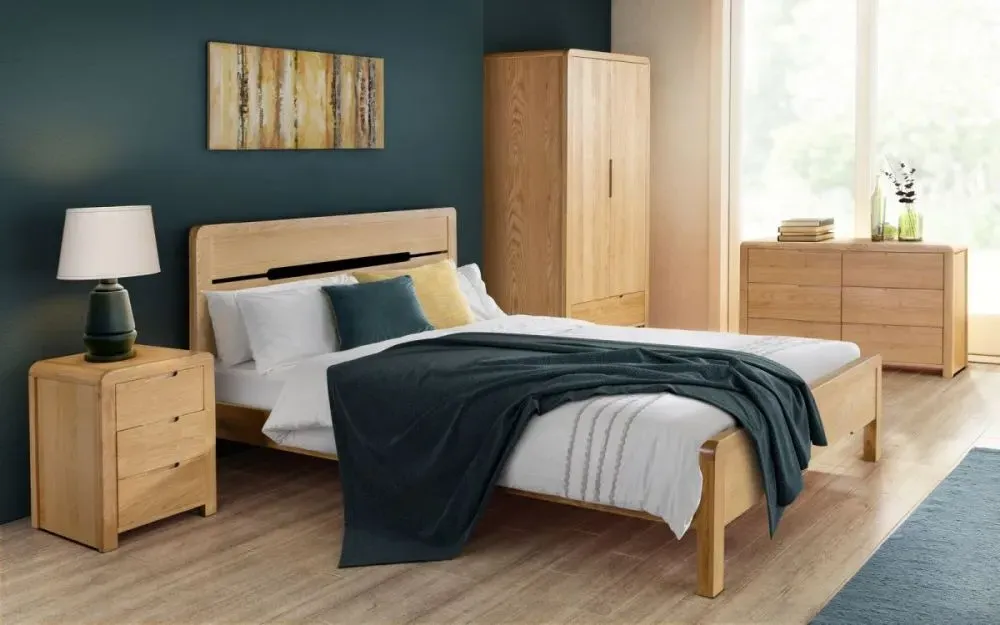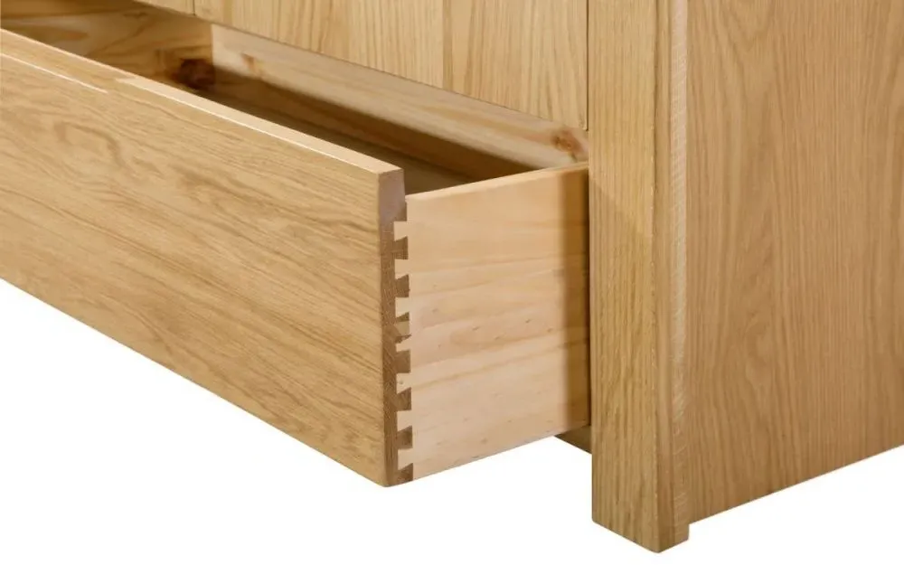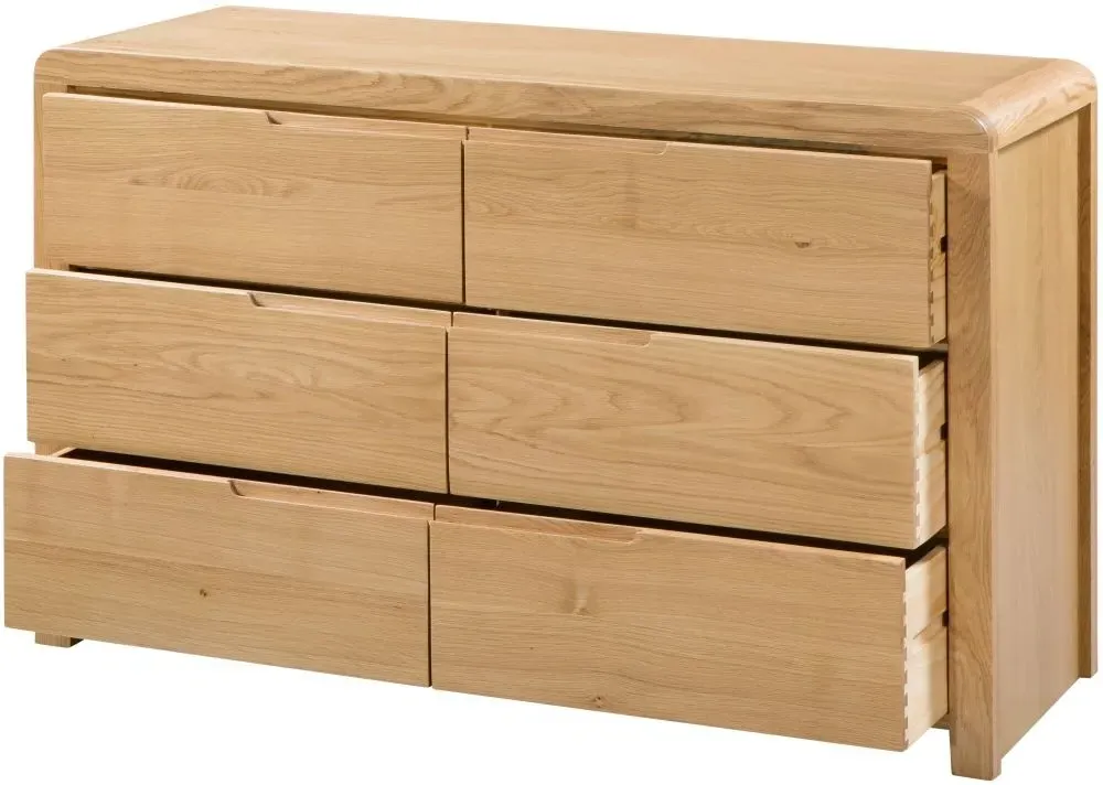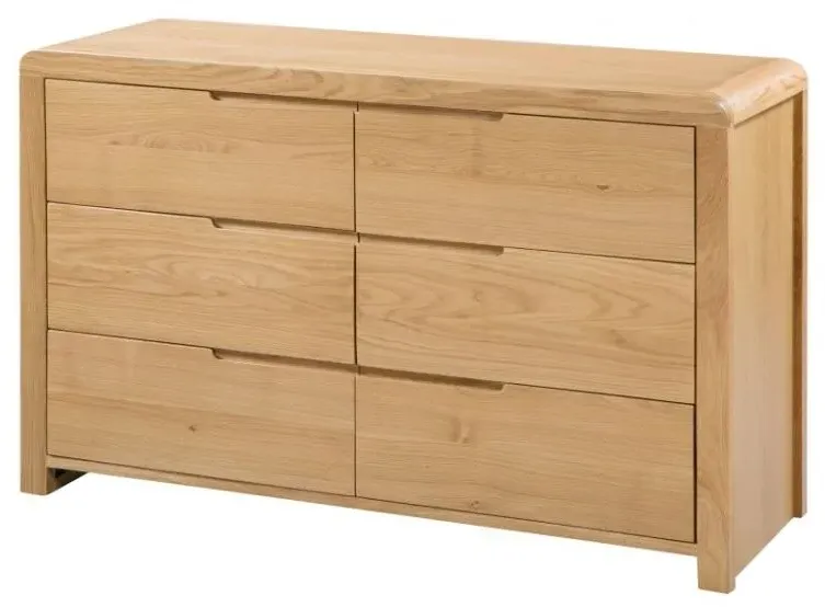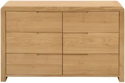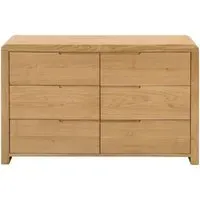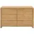 The Sia chest features distinctive ribbed oak detailing that creates visual texture and depth across its six spacious drawers. Its wide configuration offers extensive storage capacity, while the ribbed surface treatment adds tactile interest and contemporary style. The solid construction ensures reliable performance and the oak finish brings natural beauty to the design.