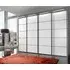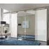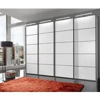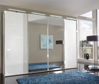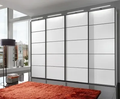 The Westside wardrobe offers synchronized opening through its centre-opening 4-door design, finished in clean white. Its soft-closing doors provide quiet operation, while the grey and white striped interior adds organized storage space. The sliding mechanism suits space-saving needs, and the white finish complements various decor styles.
