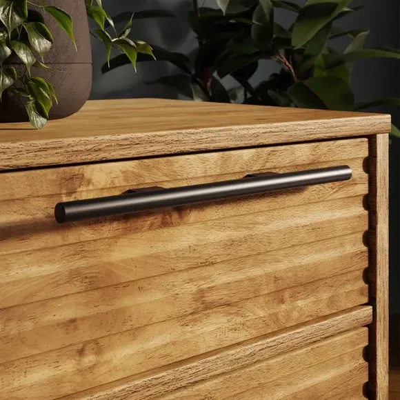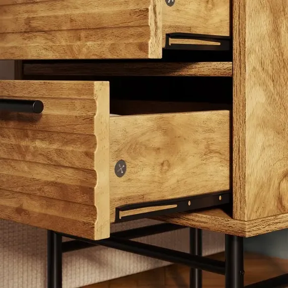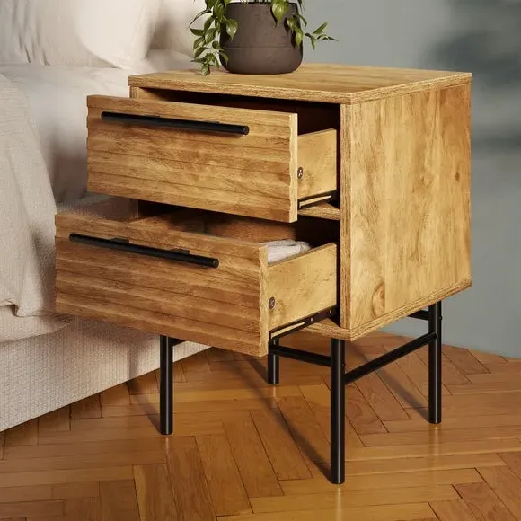 Dunelm Exclusive - Designed and Developed by Dunelm* Mango wood effect* 2 drawers with ribbed front detail* Black metal handle* Metal legs Add some fun and style to your home with this gorgeous Bryant 2 Drawer Bedside! Featuring a ribbed drawer front detail and a single shelf, this stunning bedside also has black metal handles and sleek metal legs. Ideal for any living room or bedroom, it's the perfect addition to add extra storage while creating an eye-catching focal point in your home.