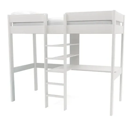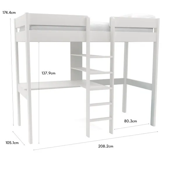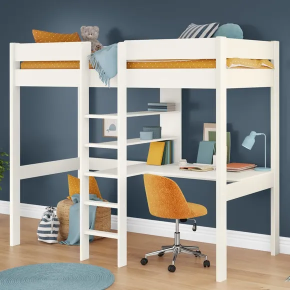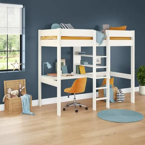 * Painted wooden frame* High foot end* Slatted base* Space saving* Assembled on delivery* Can only be delivered to mainland UK This high sleeper elevates the sleeping area, creating a unique and cosy retreat above while maximising floor space below for play, study, or storage. The secure guardrails provide added safety, ensuring peace of mind as your child enjoys their elevated sleeping area. The space underneath offers endless possibilities; whether it’s a fun play area, a dedicated study nook, or simply extra storage, this high sleeper encourages creativity and organization.*Select the relevant options to purchase mattresses to fit this bed. You can choose between foam or pocket sprung mattresses.