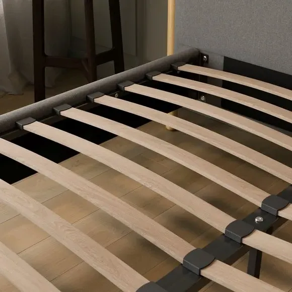 The bed frame combines modern design with luxurious comfort through its soft velvet upholstery and wooden accent details. Its sprung slatted base provides optimal support and breathability, while the sturdy construction ensures long-lasting durability. The high-quality velvet fabric adds a sophisticated texture that complements contemporary interiors.