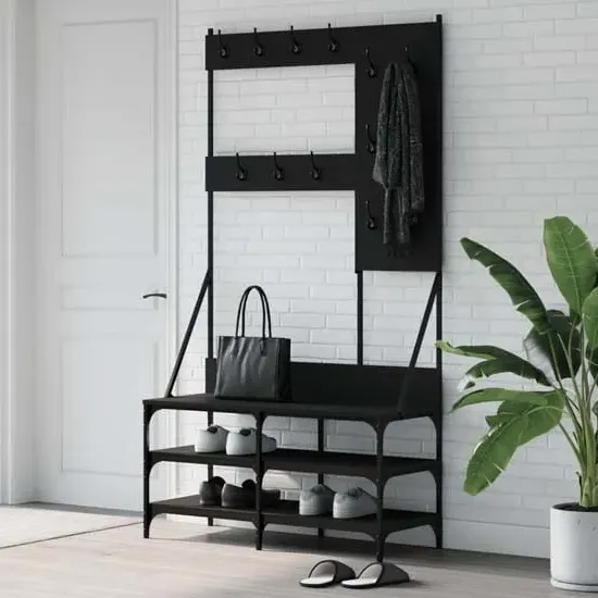Ironton Wooden Clothes Rack with Shoe Storage in Black, a versatile and stylish storage solution offered by Furniture in Fashion. Crafted from high-quality wood, this sleek rack boasts a contemporary design that effortlessly complements any home decor. With ample hanging space for coats, jackets, and clothing items, as well as a convenient shoe storage compartment, the Ironton rack helps keep your entryway or bedroom organized and clutter-free. Its black finish adds a touch of elegance to any room while maximizing storage efficiency. Elevate your home organization with the Ironton Wooden Clothes Rack with Shoe Storage in Black, the perfect blend of fashion and functionality for modern living spaces. FEATURES : Material : Engineered Wood Finish : Black Clean up your closet and easily pick out your outfit with this clothes rack! The engineered wood is of exceptional quality with a smooth surface and features strength, stability and resistance to moisture The coat stand offers ample storage space for keeping your clothes and bags well organised The lower shelves are perfect for shoes The clean lines and minimalist design make the free standing coat rack blend into your room perfectly and is also perfect for small space due to its compact size Screws and plugs for inside the wall are not included We advise to find and use screws and plugs suitable specifically for your walls If you're not sure, you can consult with a professional Please read and follow each step of the instructions Available at an affordable price Images shown are for illustration purpose only DIMENSIONS : Height : 184cm Width : 80cm Depth : 40cm