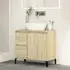 The Prague Vanity Unit offers practical storage with its spacious tabletop and two smooth-opening drawers for organizing essentials. Its engineered wood construction features moisture resistance and exceptional quality, while the solid eucalyptus wood legs provide natural warmth and stability. The unit includes versatile installation options with reversible door and drawer configuration. The sleek black finish paired with natural oak legs creates a striking contrast that adds depth to any space.