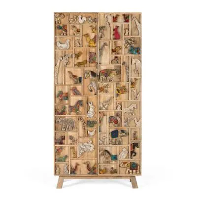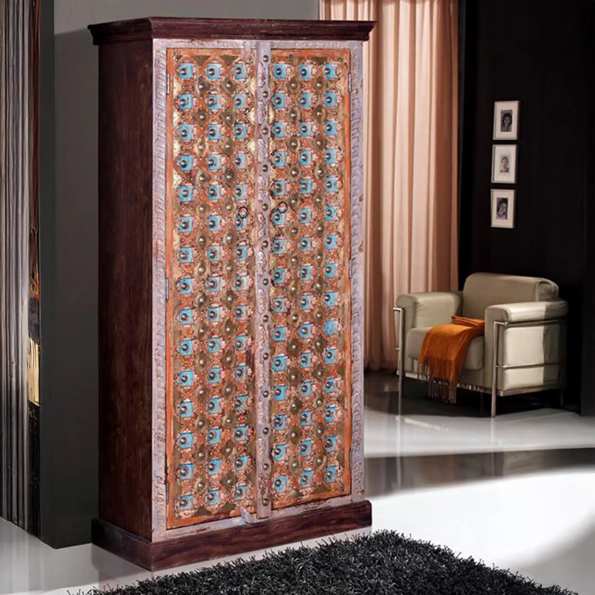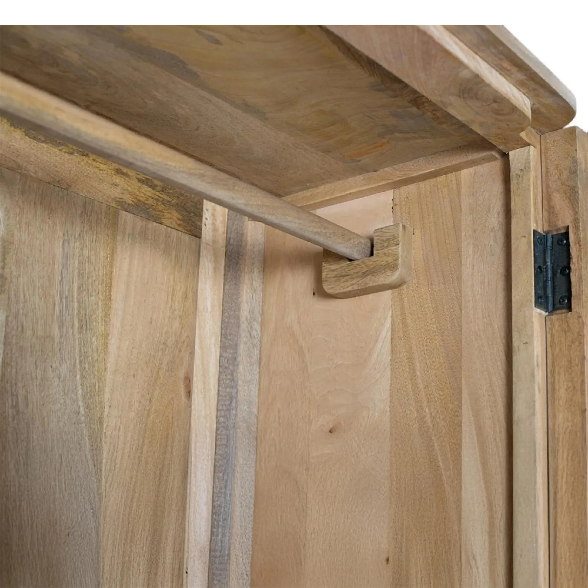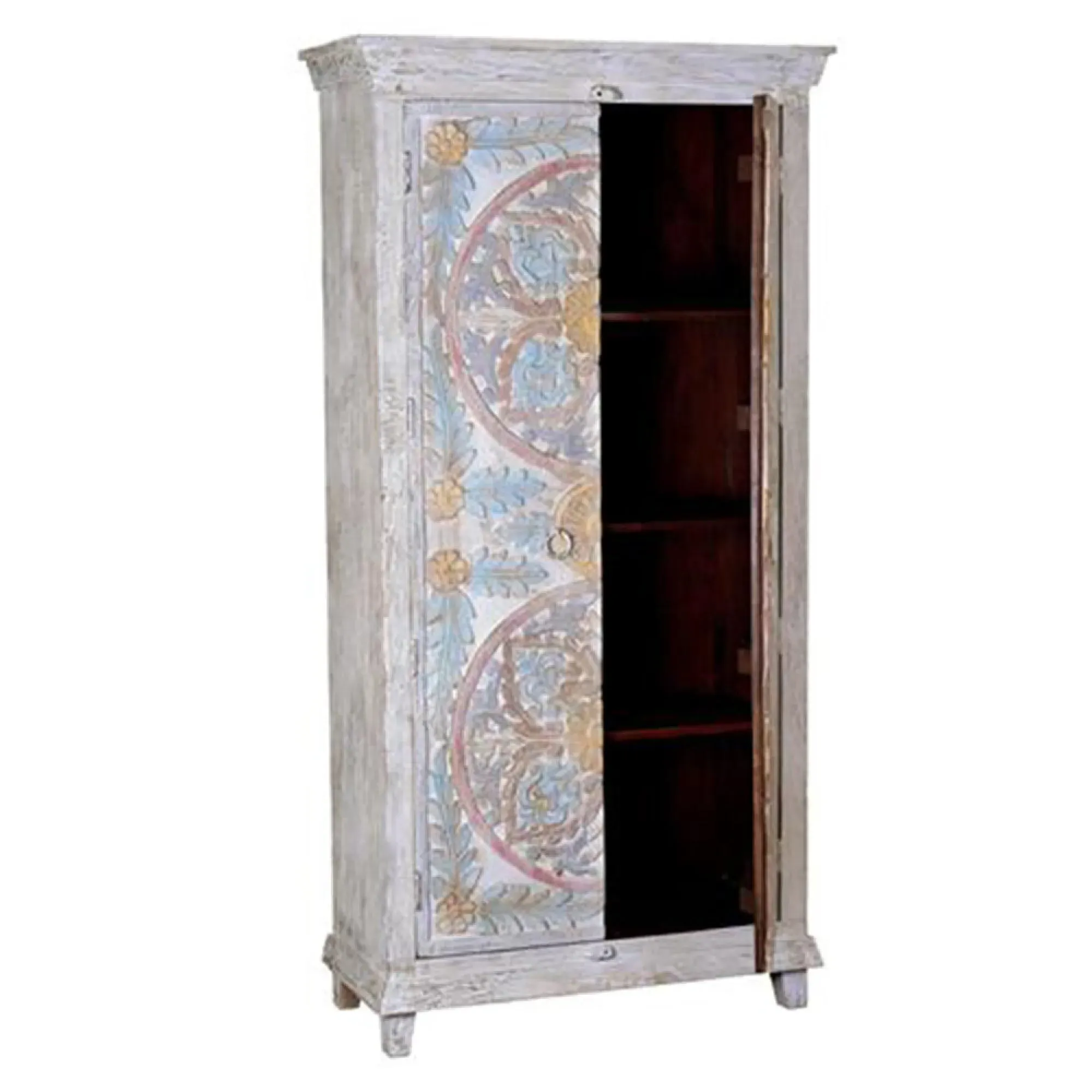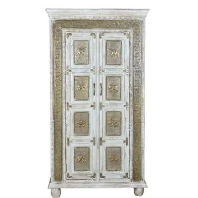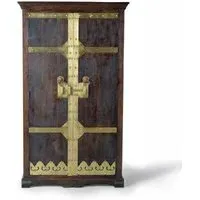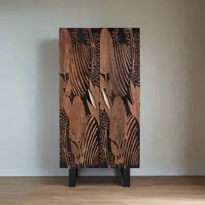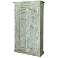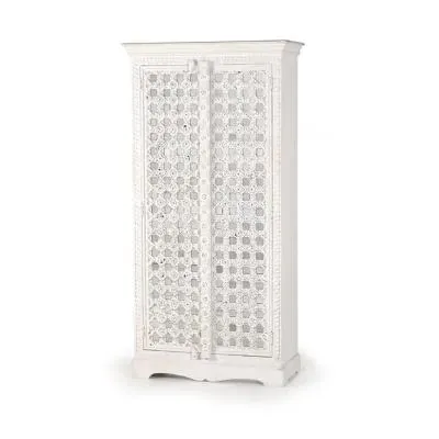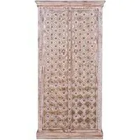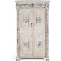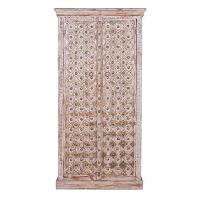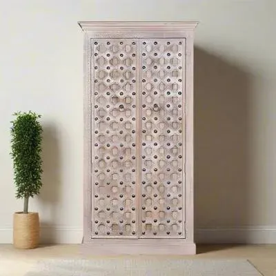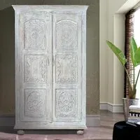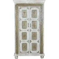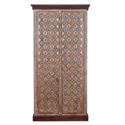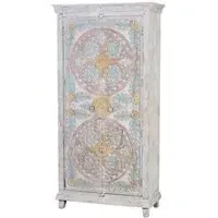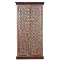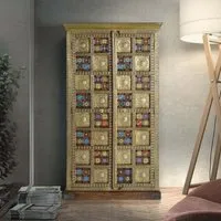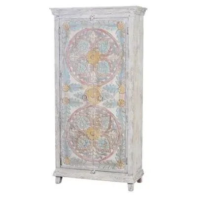 The Madelynn wardrobe features hand-painted mango wood construction with vibrant multicoloured detailing that adds artistic flair. Its two-door design offers practical storage solutions, while the painted finish provides protection and visual interest. The solid wood frame delivers dependable support, and the colourful accents bring character to any space.