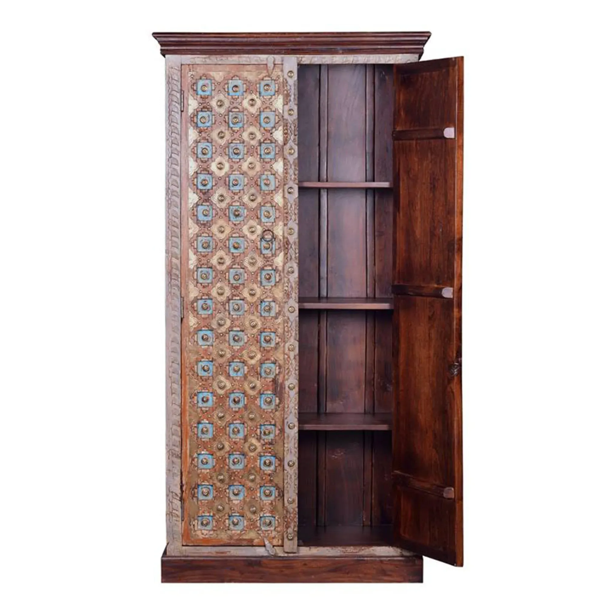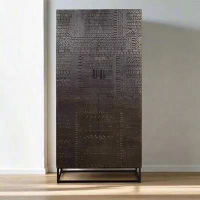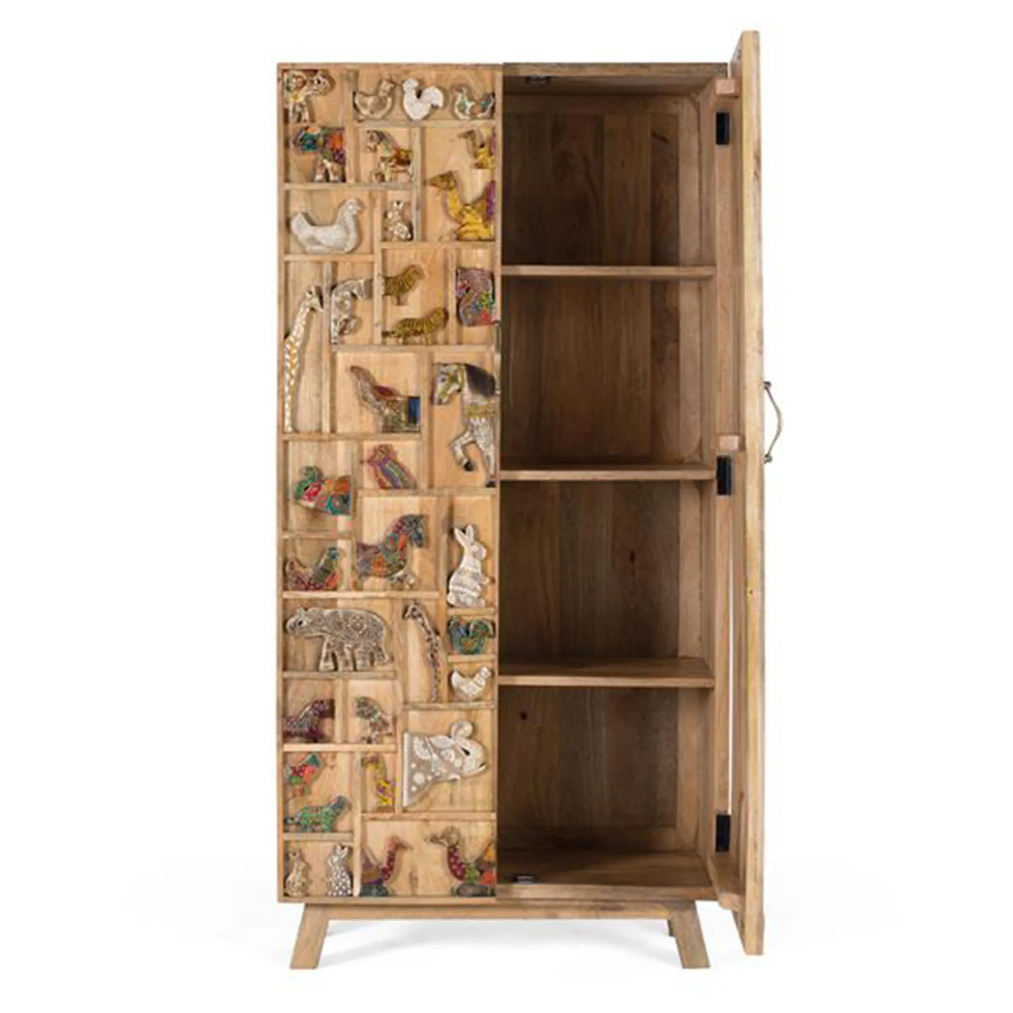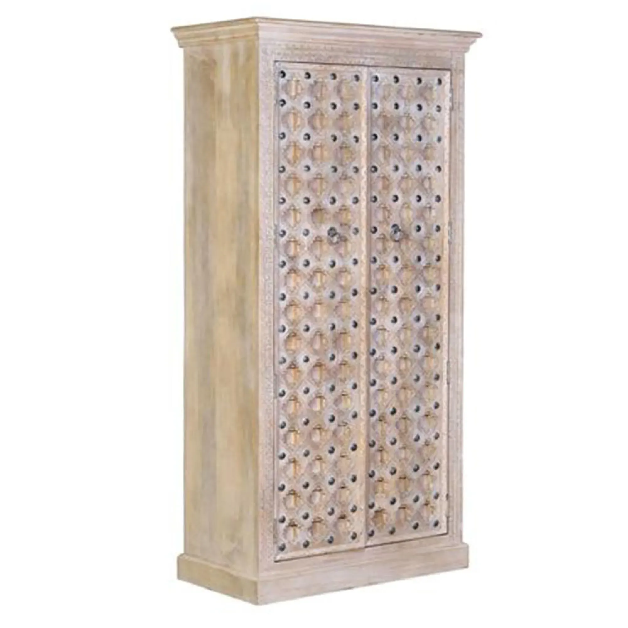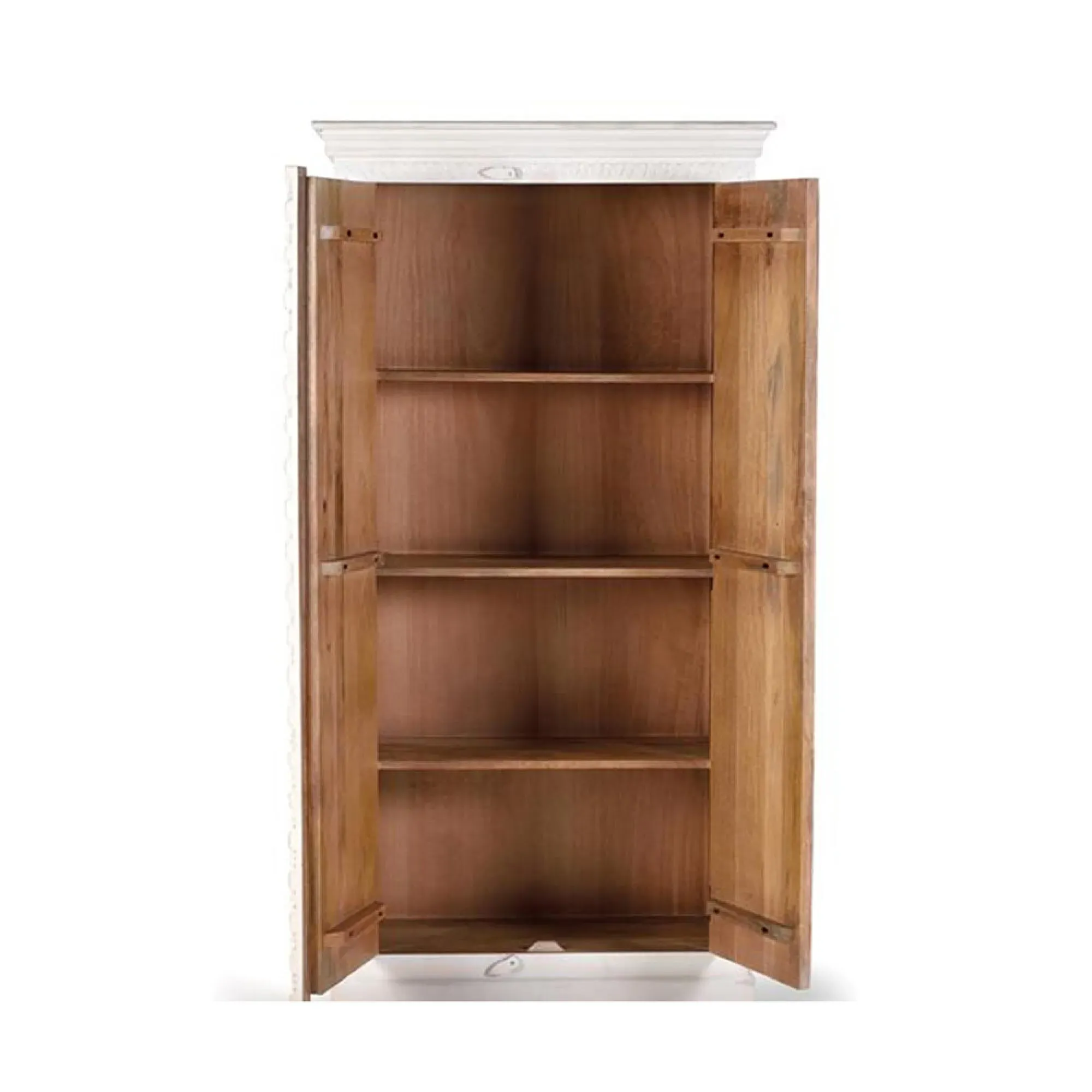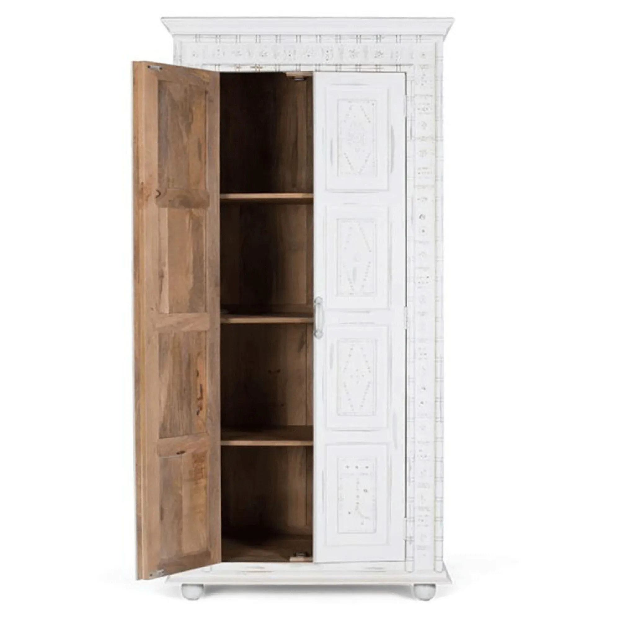 The Madelynn wardrobe features hand-painted mango wood construction with vibrant multicoloured detailing that adds artistic flair. Its two-door design offers practical storage solutions, while the painted finish provides protection and visual interest. The solid wood frame delivers dependable support, and the colourful accents bring character to any space.