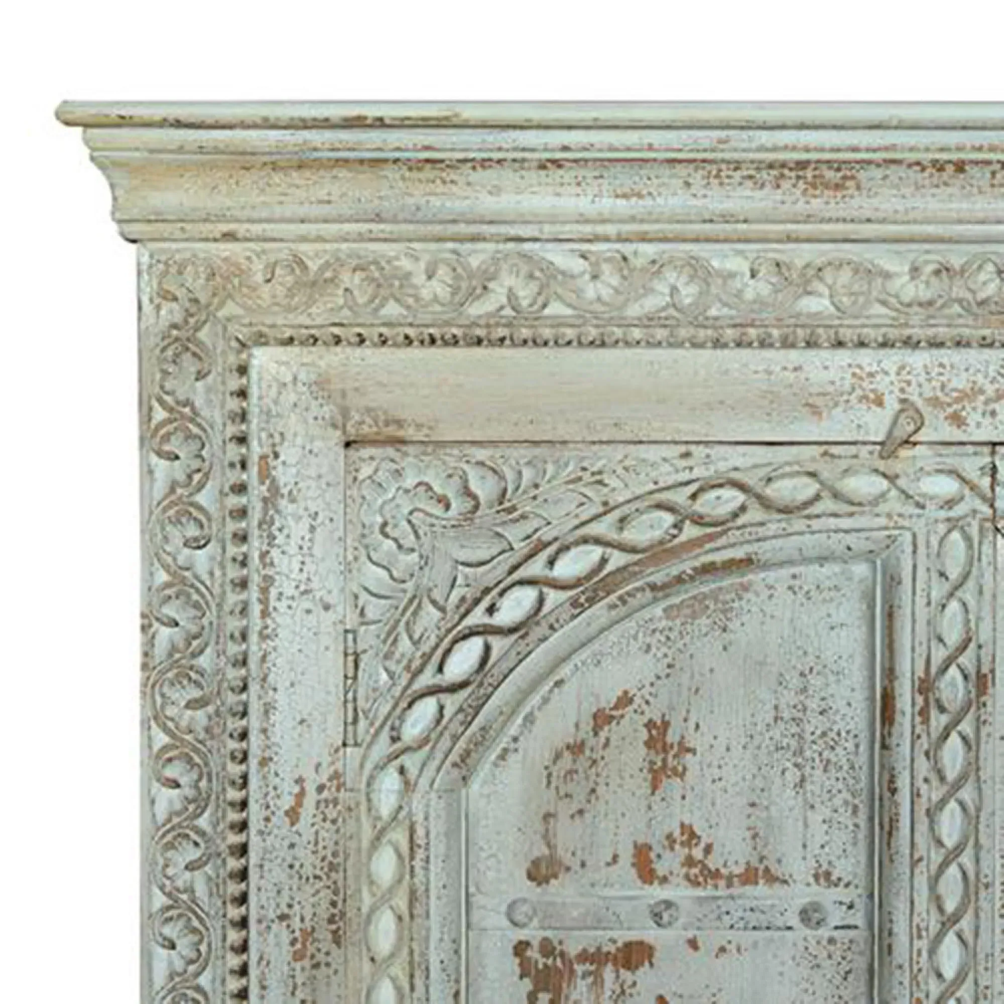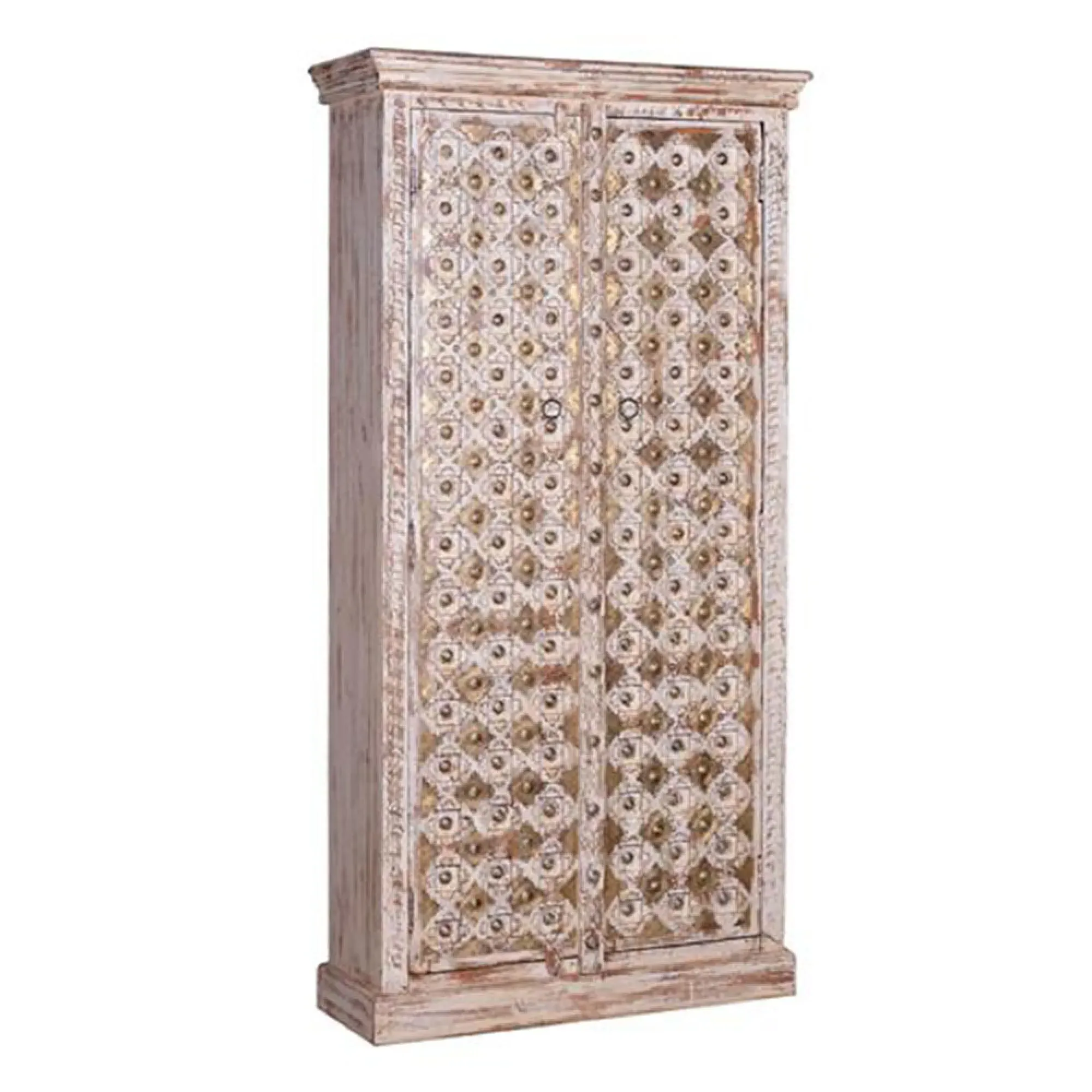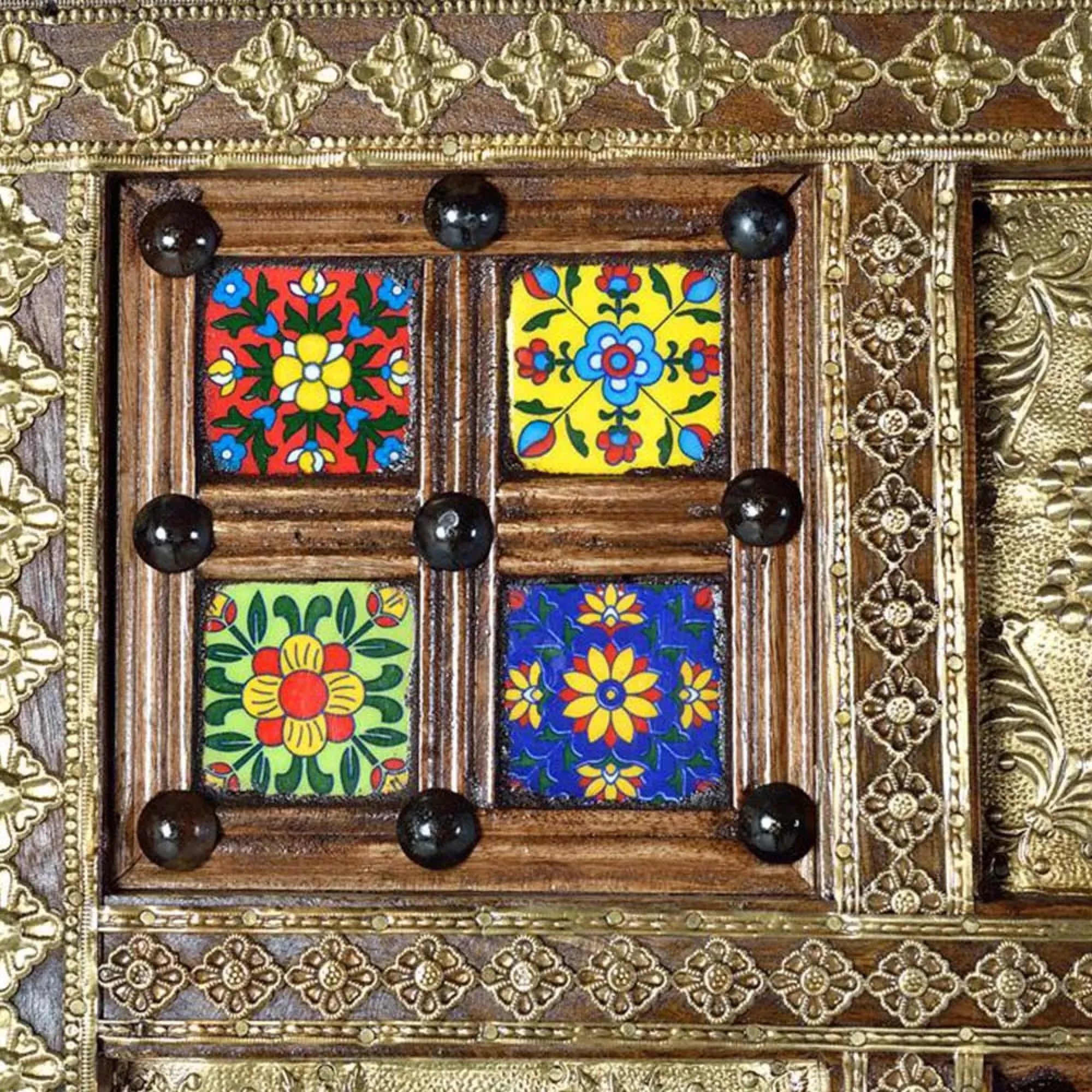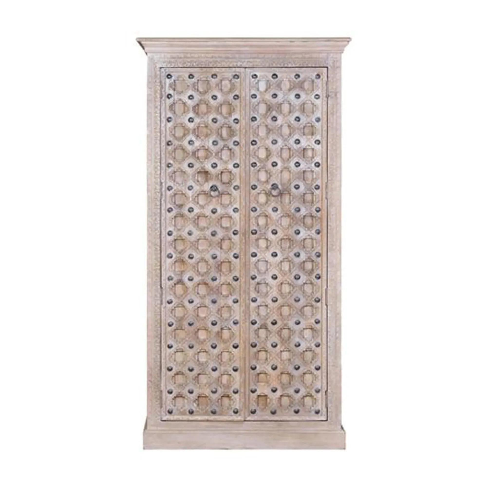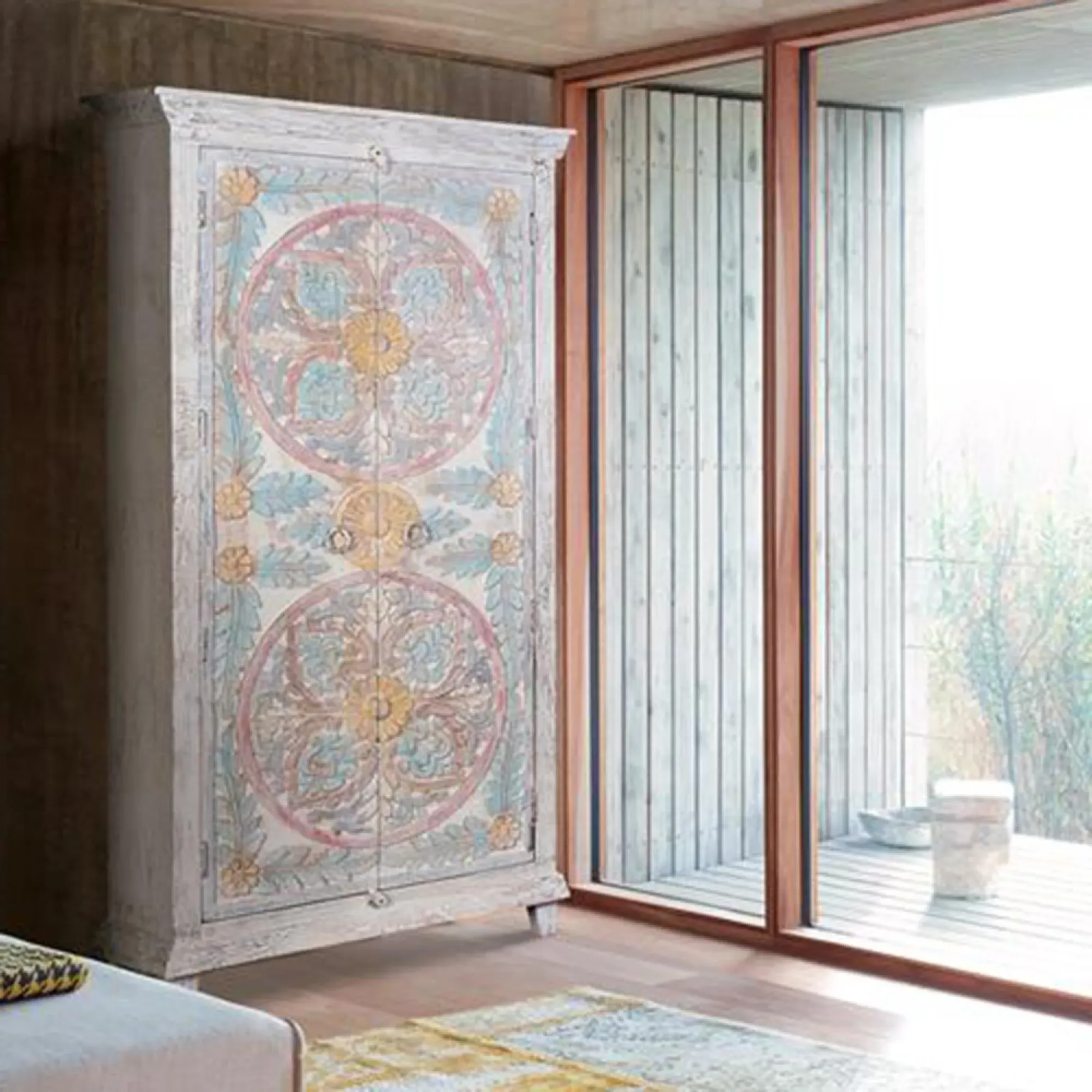The Madelynn wardrobe features hand-painted mango wood construction with vibrant multicoloured detailing that adds artistic flair. Its two-door design offers practical storage solutions, while the painted finish provides protection and visual interest. The solid wood frame delivers dependable support, and the colourful accents bring character to any space.