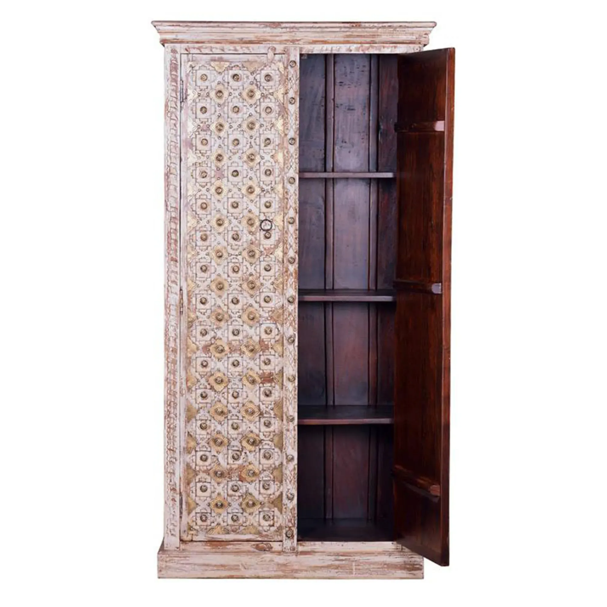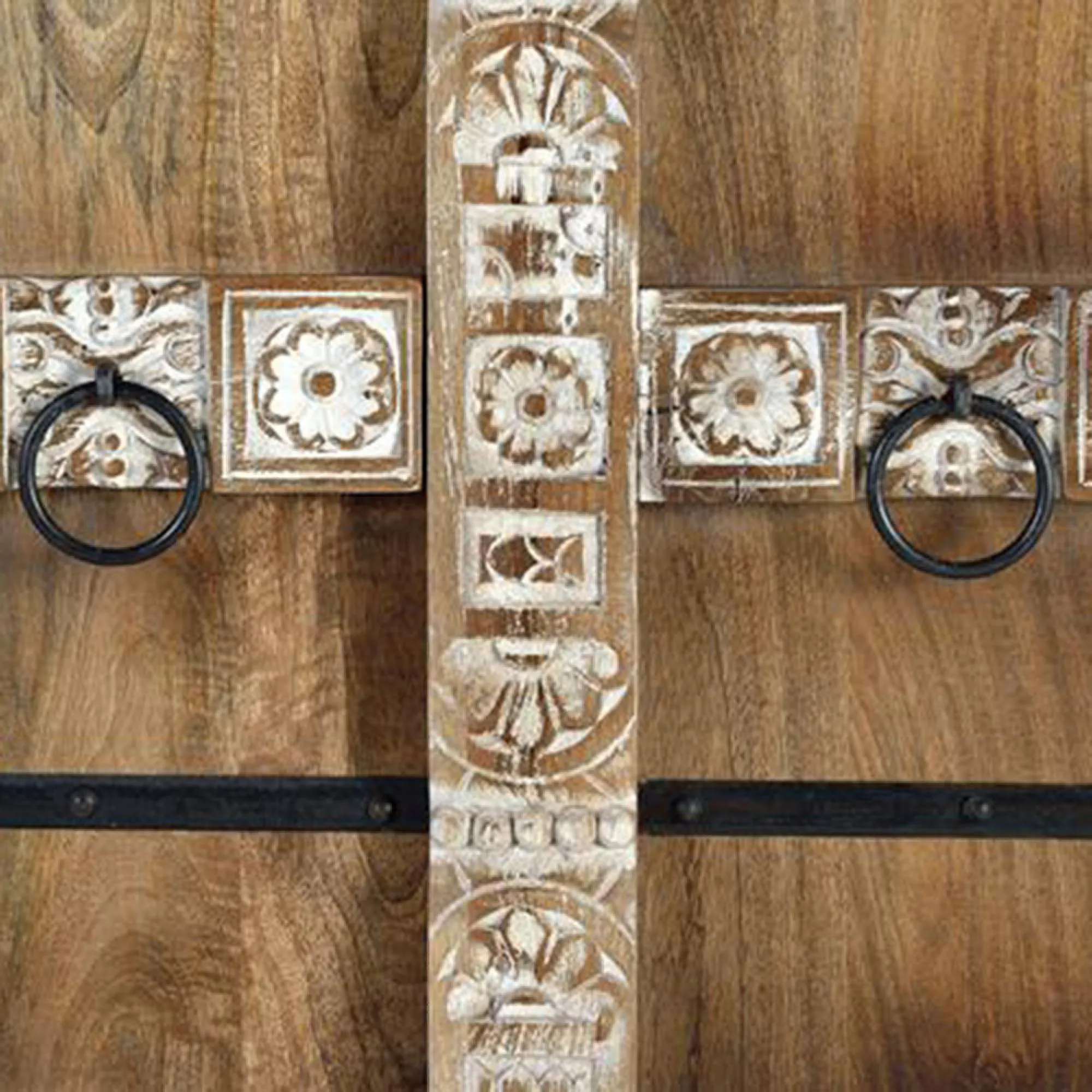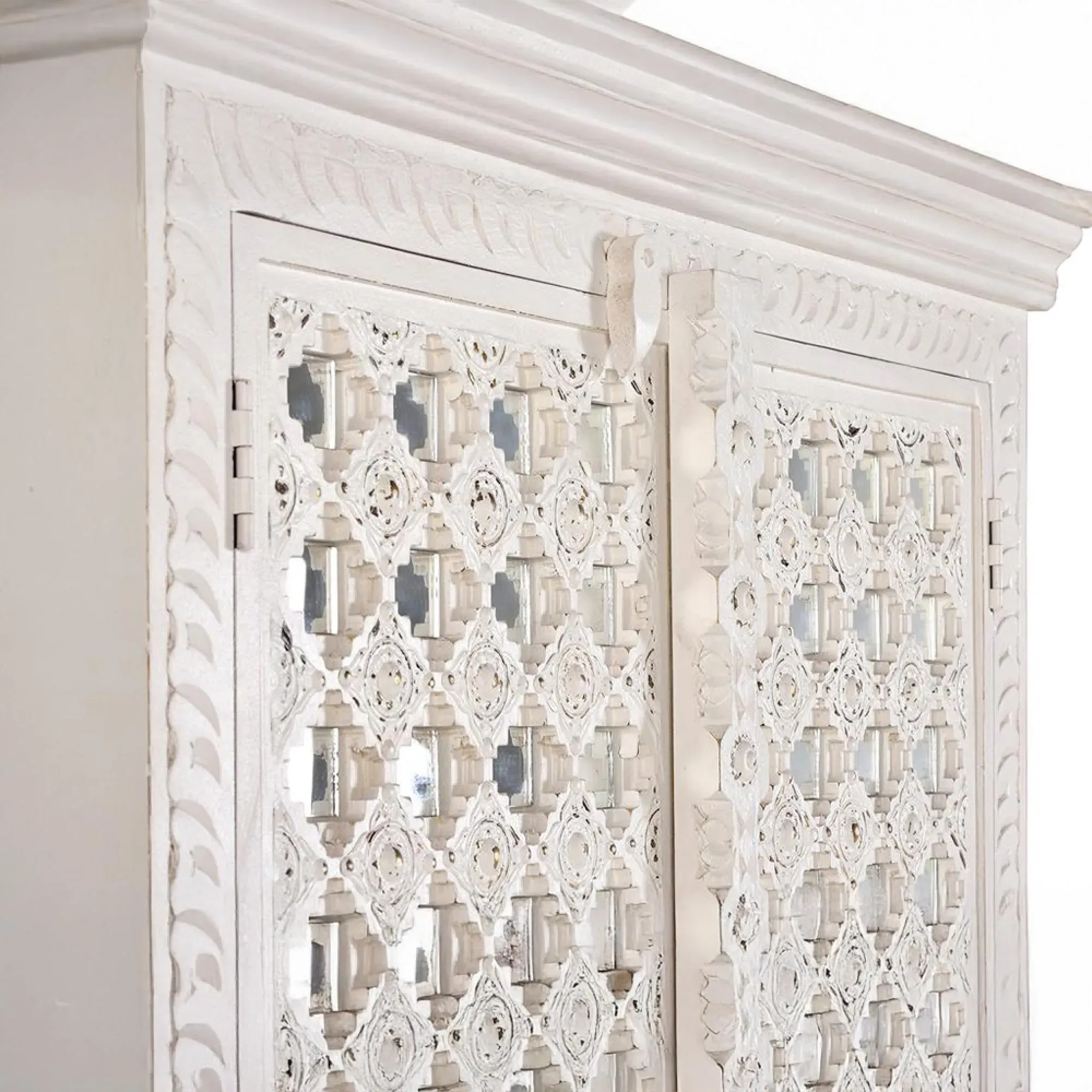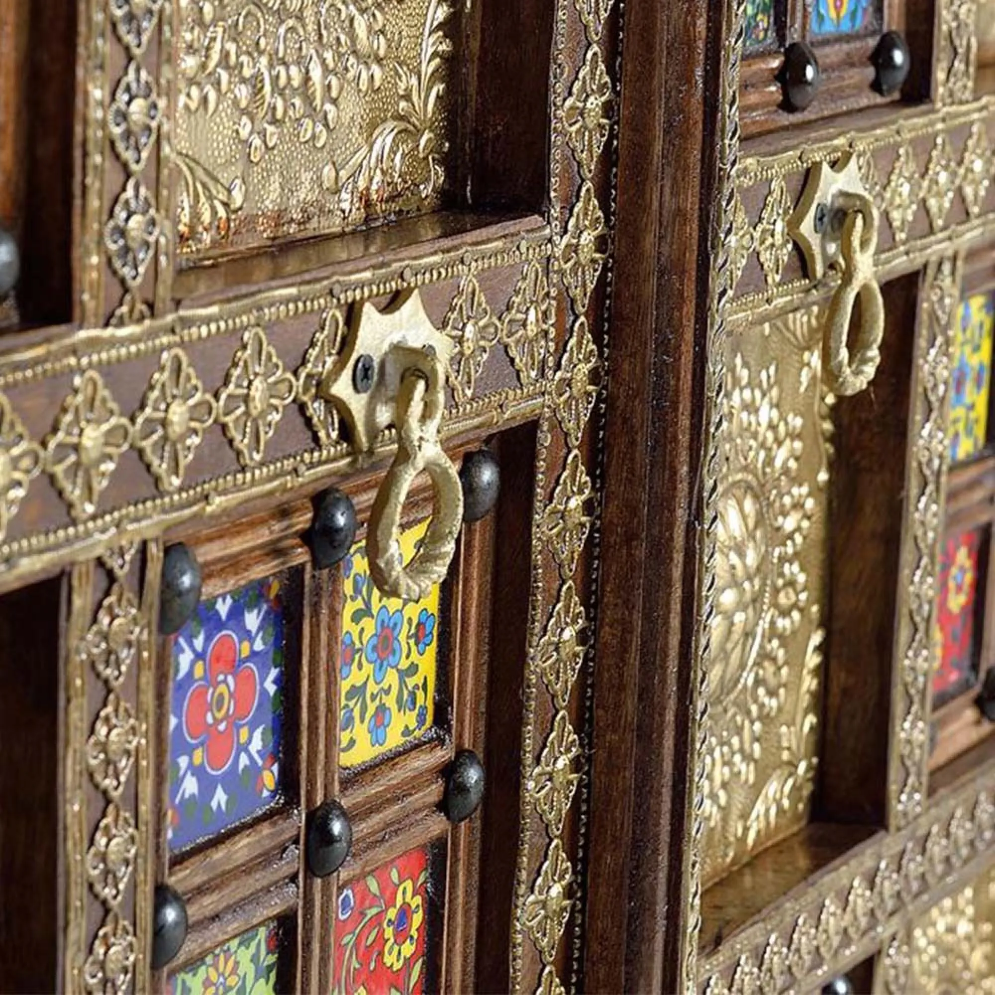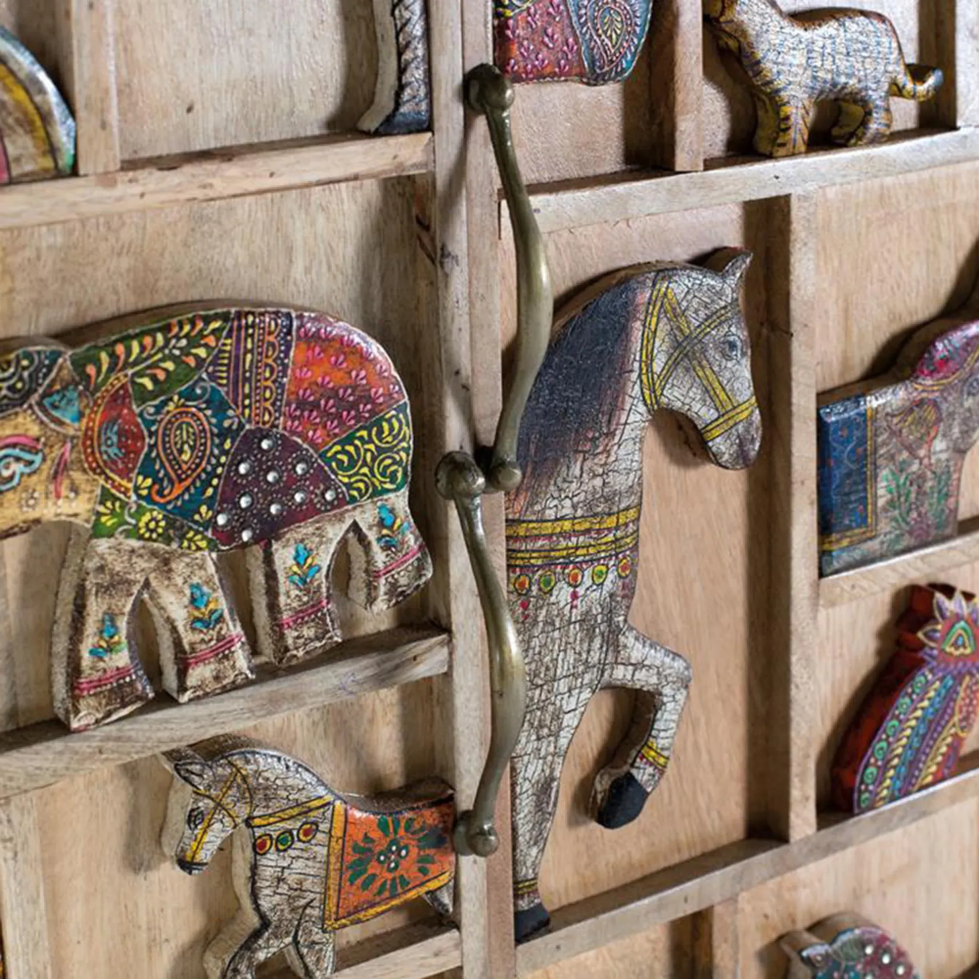 The Madelynn wardrobe features hand-painted mango wood construction with vibrant multicoloured detailing that adds artistic flair. Its two-door design offers practical storage solutions, while the painted finish provides protection and visual interest. The solid wood frame delivers dependable support, and the colourful accents bring character to any space.