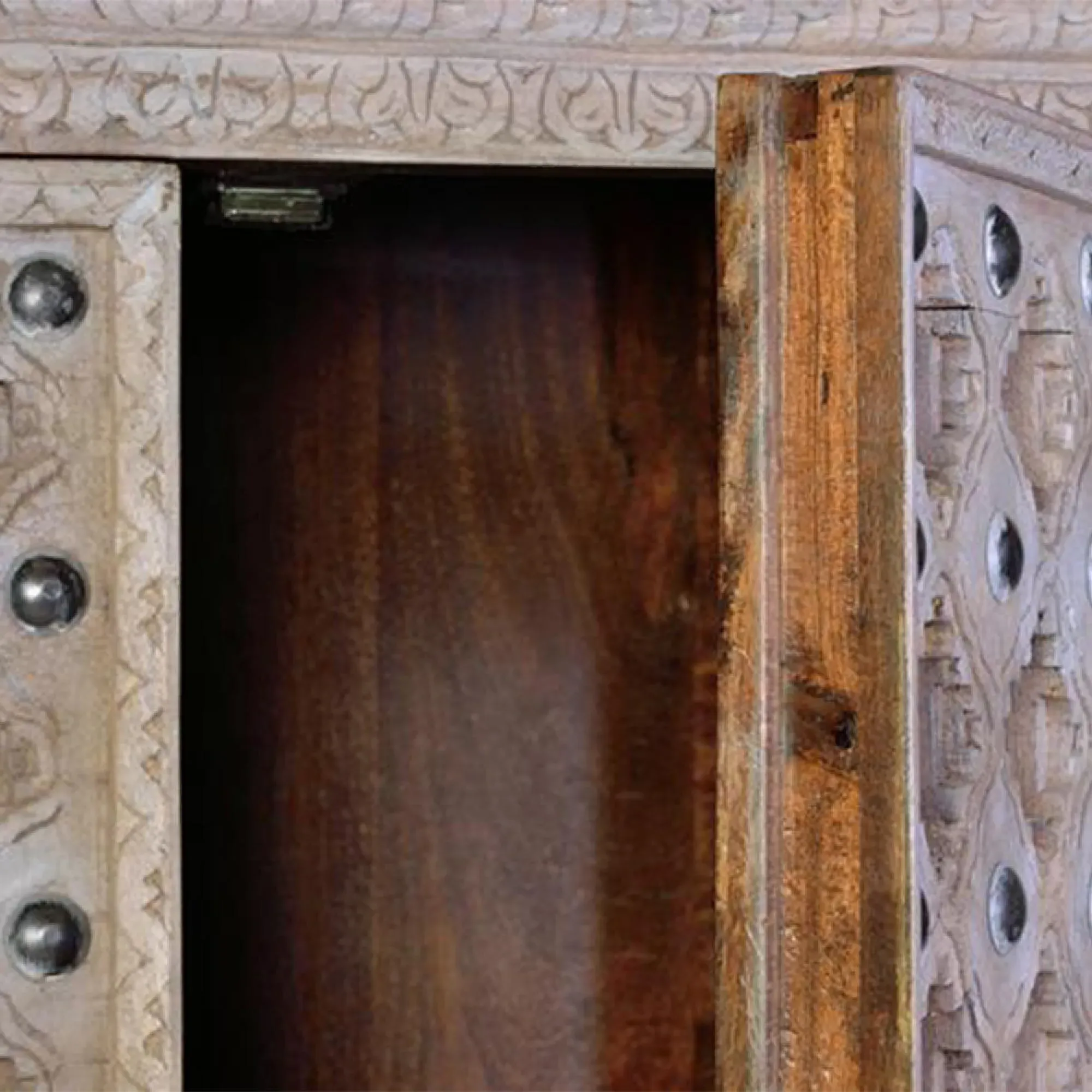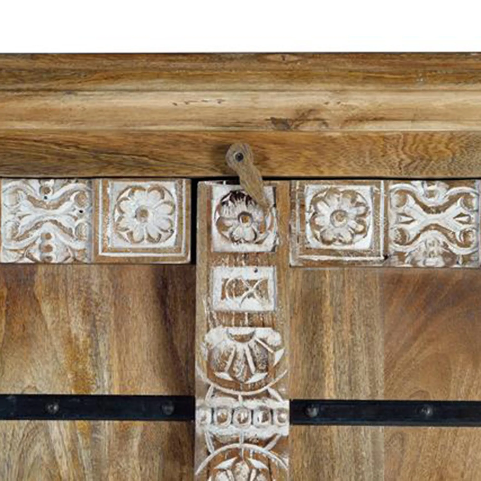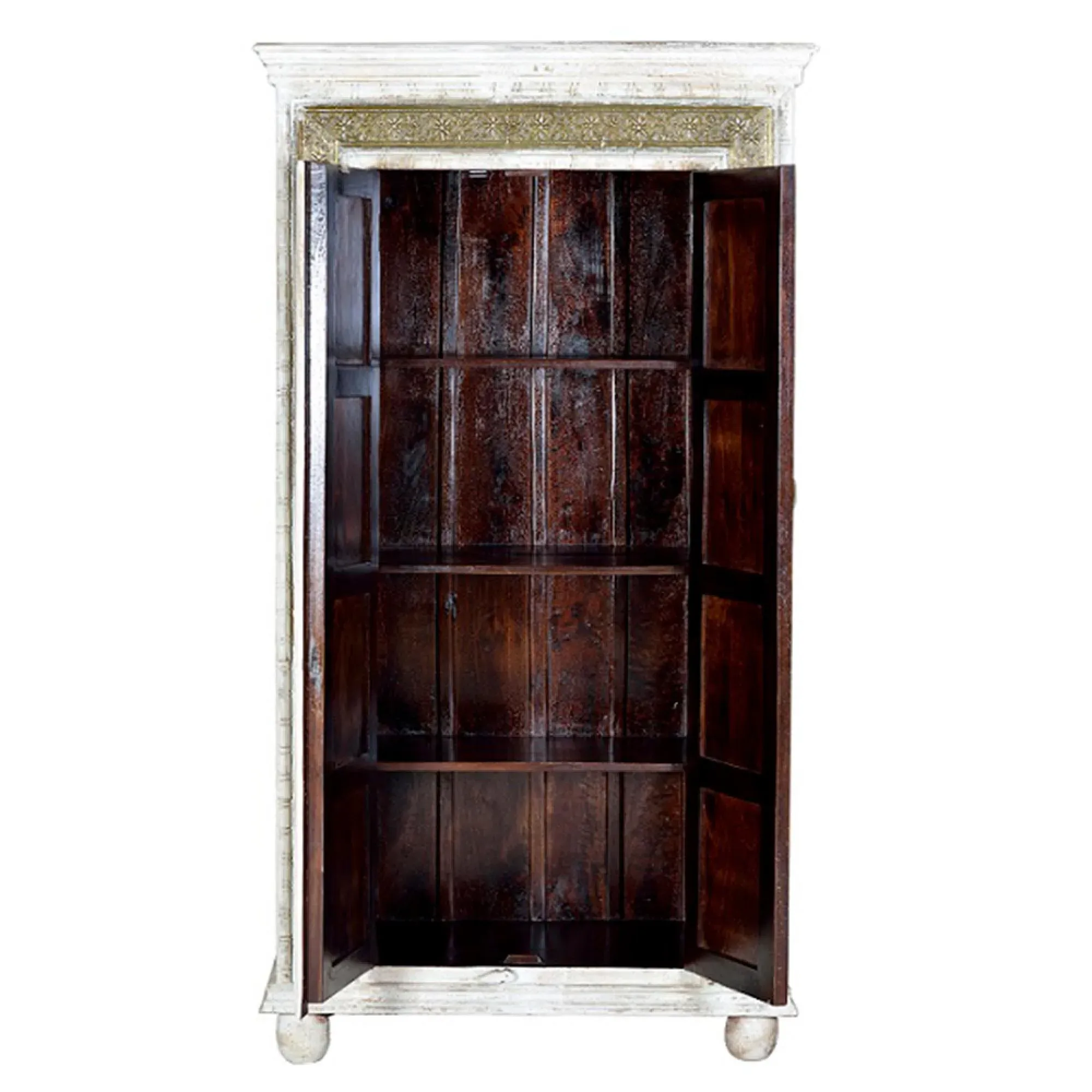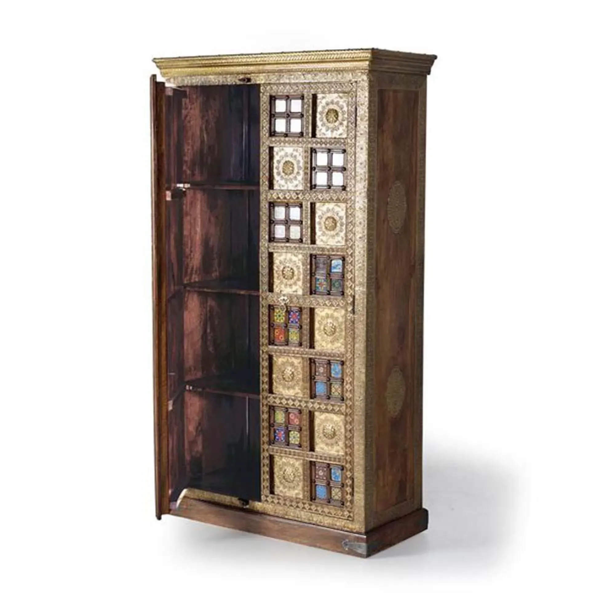 The Madelynn wardrobe features hand-painted mango wood construction with vibrant multicoloured detailing that adds artistic flair. Its two-door design offers practical storage solutions, while the painted finish provides protection and visual interest. The solid wood frame delivers dependable support, and the colourful accents bring character to any space.