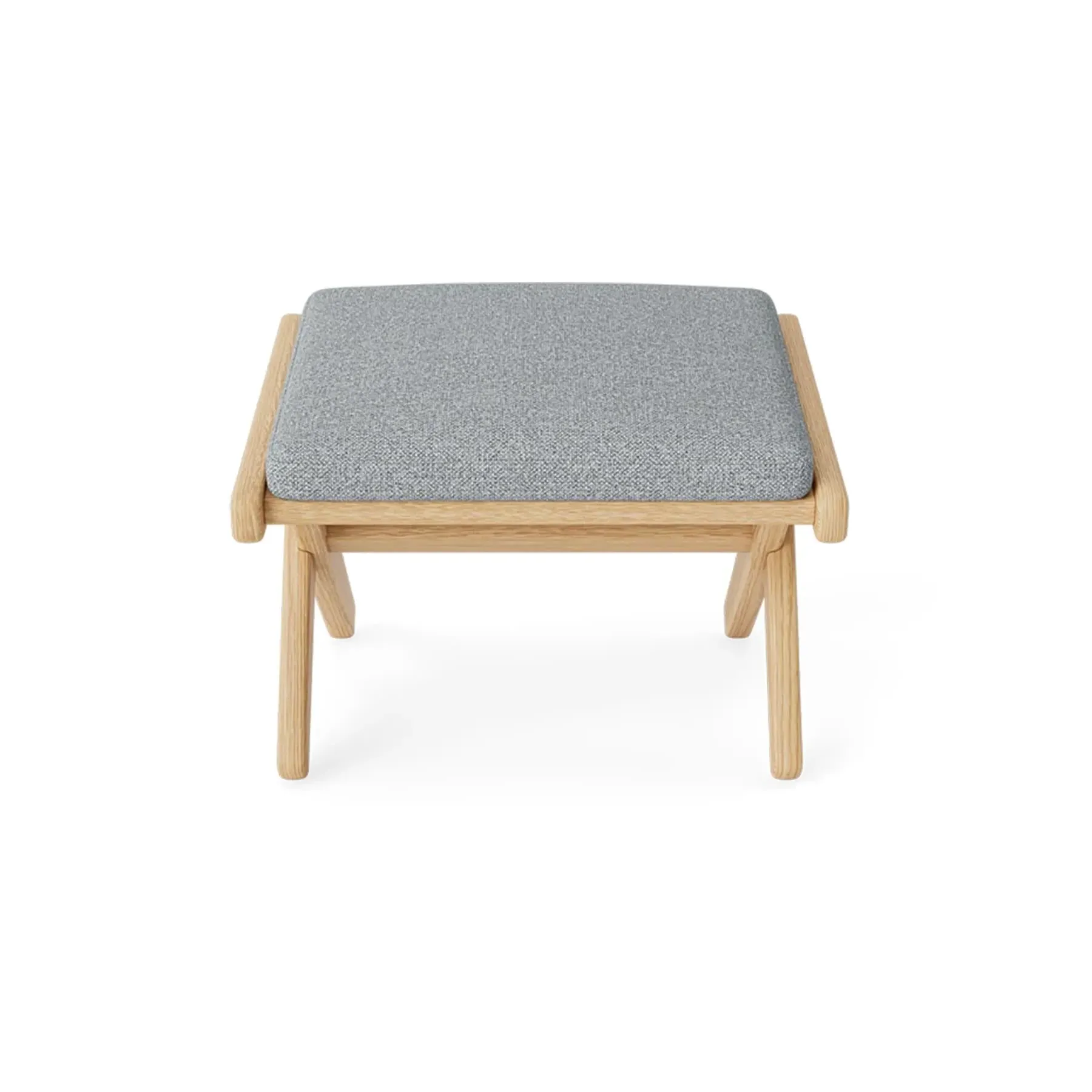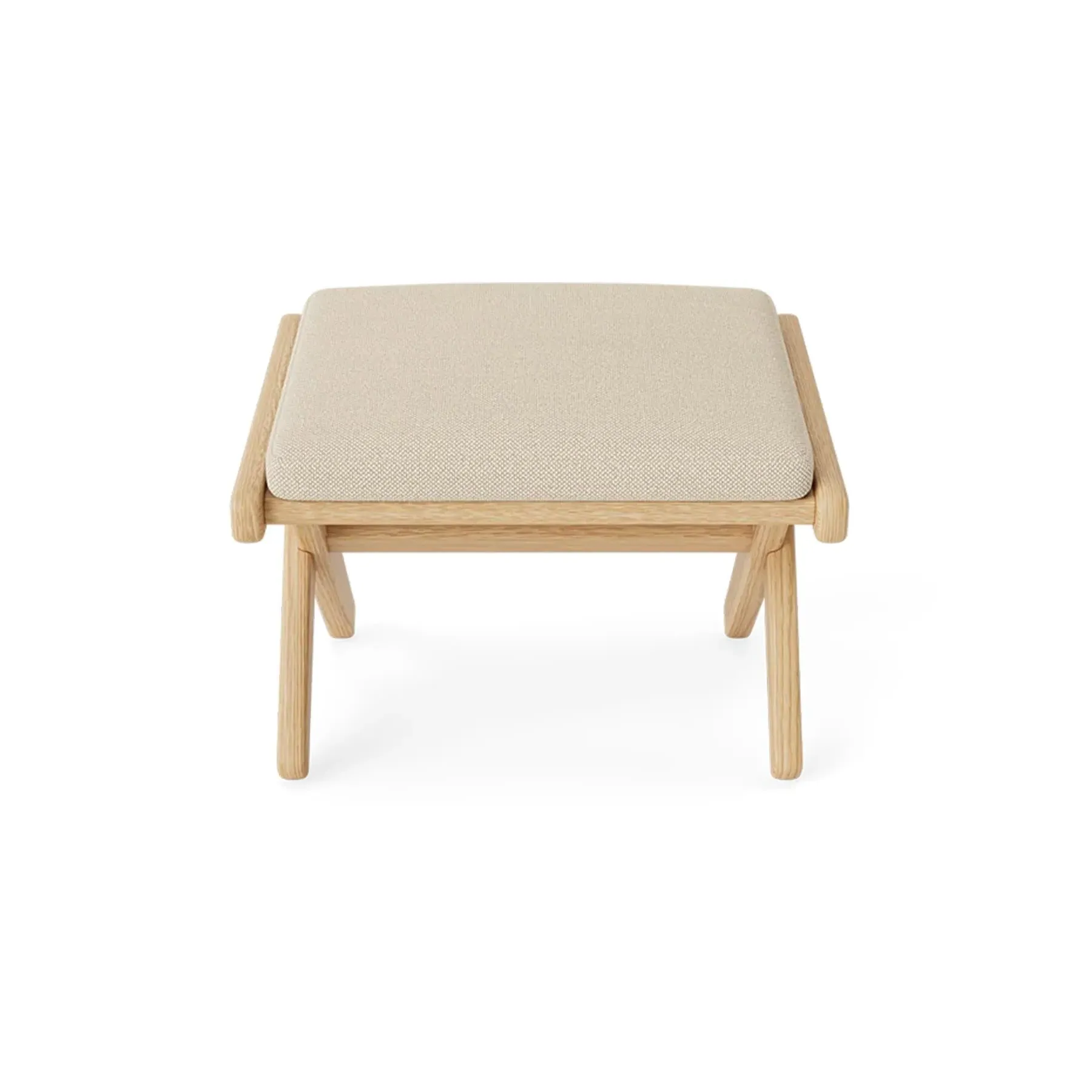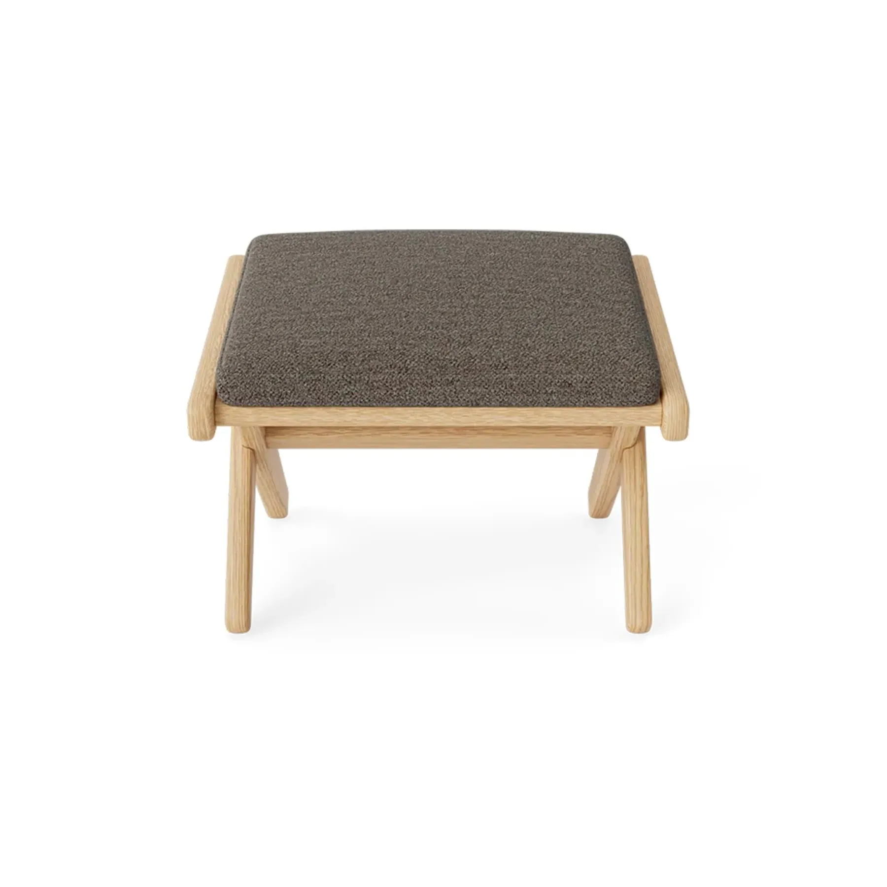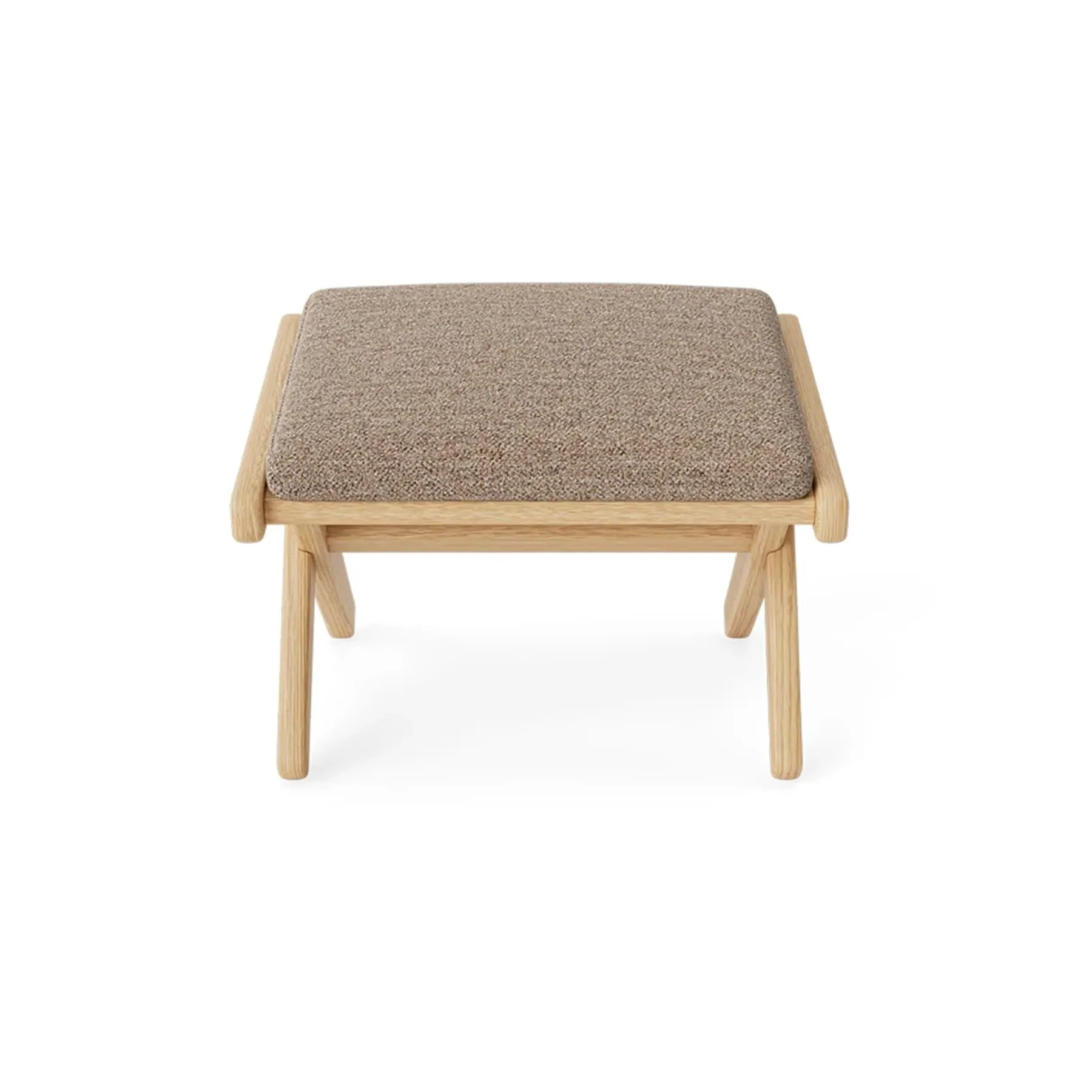 The footstool offers handcrafted Danish construction with its sculptural oak frame, featuring premium boucle upholstery in natural tones. Its natural oak finish provides durability and visual appeal, while the FSC-certified wood construction ensures sustainable sourcing. The boucle fabric delivers comfort and textural interest, and the solid wood base ensures long-lasting stability.