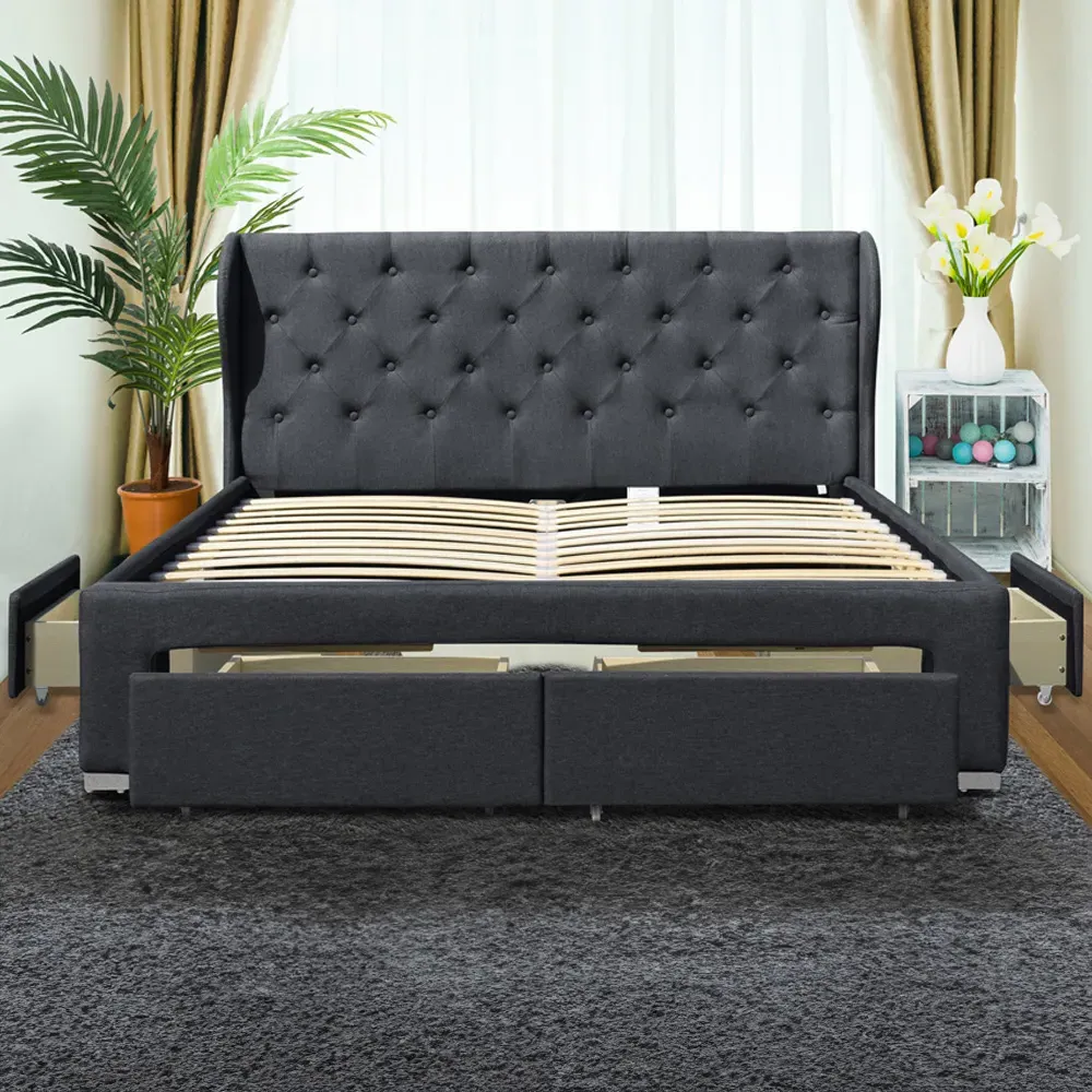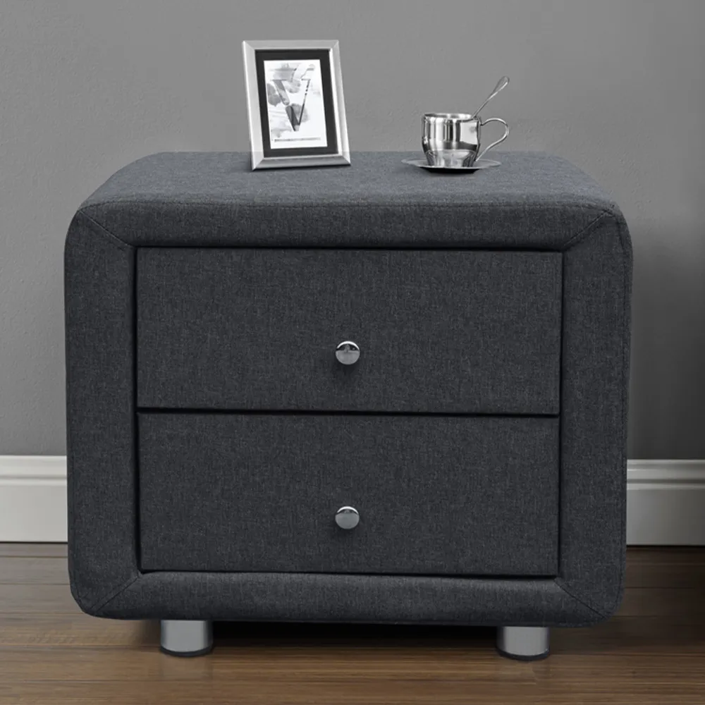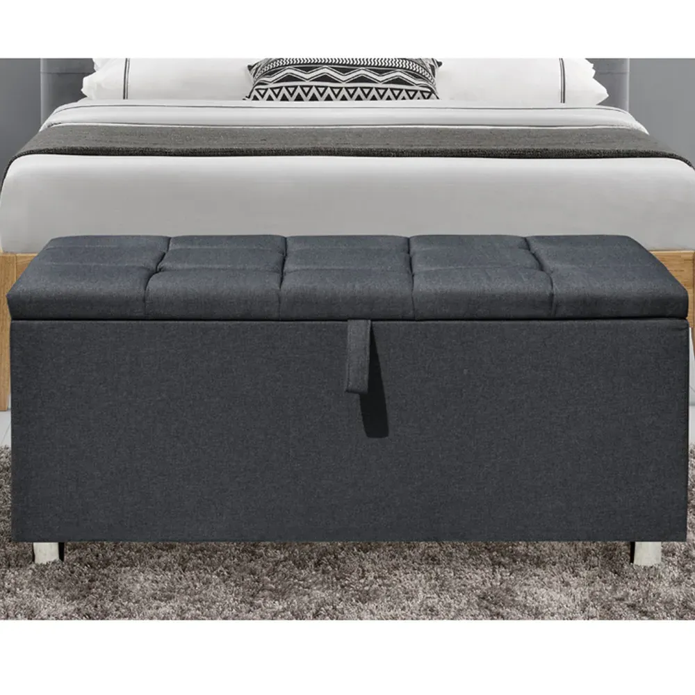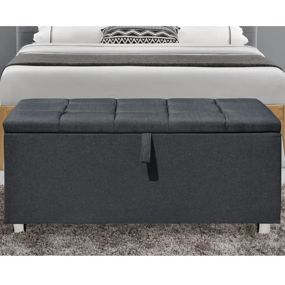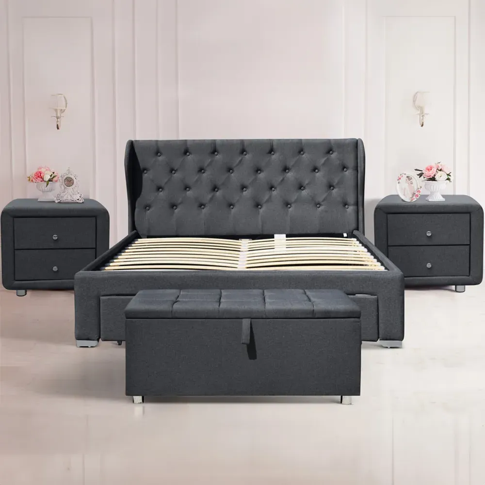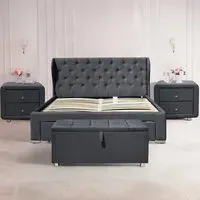 Uplift the look in your bedroom with the stylish Brooklyn double bed beautifully upholstered in a grey linen fabric. It features a deep padded headboard and footboard. It is made from a solid wooden frame and has a sprung slatted base to support the mattress and give you a fully supportive and comfortable night's sleep. The bed is accompanied by 2 matching bedside tables and a blanket box that are upholstered in the same material as the bedframe