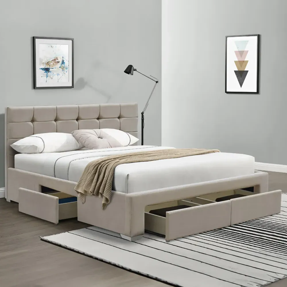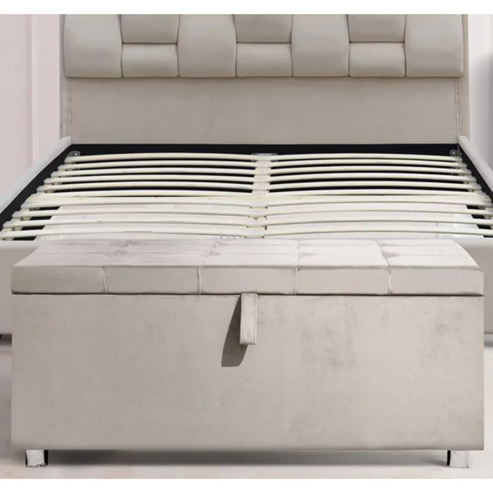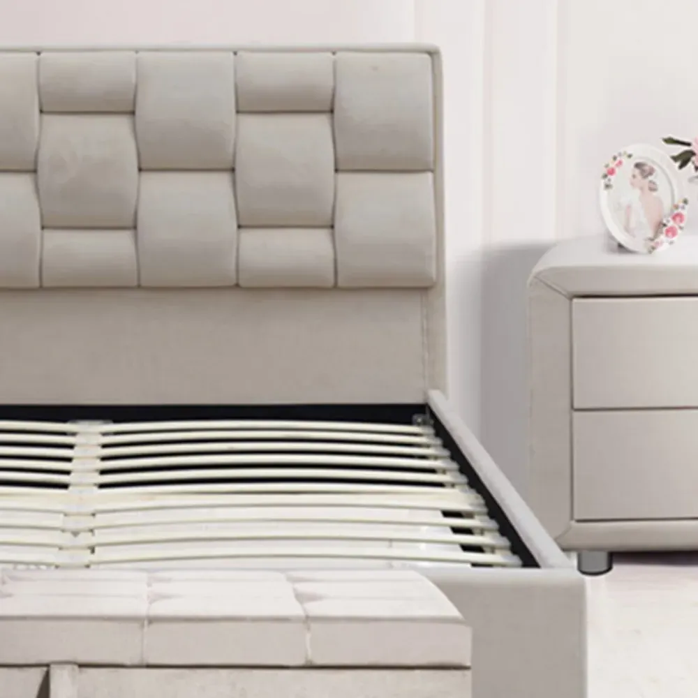 Uplift the look in your bedroom with the Brooklyn king-size stylish 5ft bed beautifully upholstered in a cream plush velvet. It features a unique weaved effect padded headboard. It is made from a solid wooden frame and has a sprung slatted base to give support to the mattress and give you a fully supportive and comfortable night's sleep. The ottoman aspect of this bed frame is operated using a gas lift mechanism that lifts the mattress to reveal ample storage space. This bed frame is accompanied by 2 stunning upholstered bedside tables