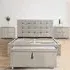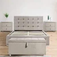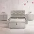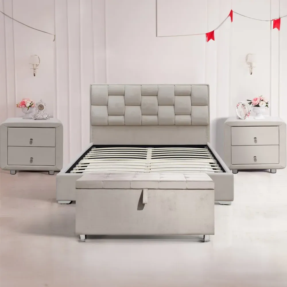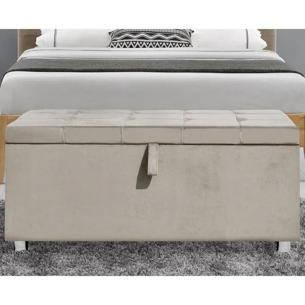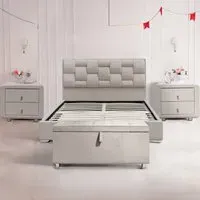 The Brooklyn ottoman bed provides convenient storage access through its gas lift mechanism that lifts the mattress to reveal ample space beneath. Its weaved effect padded headboard is beautifully upholstered in cream plush velvet, while the solid wooden frame ensures lasting stability. The sprung slatted base offers reliable mattress support, and the set includes two matching upholstered bedside tables.