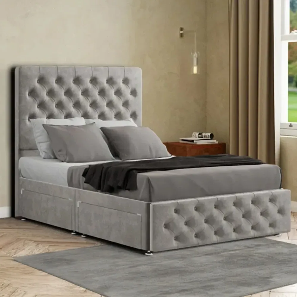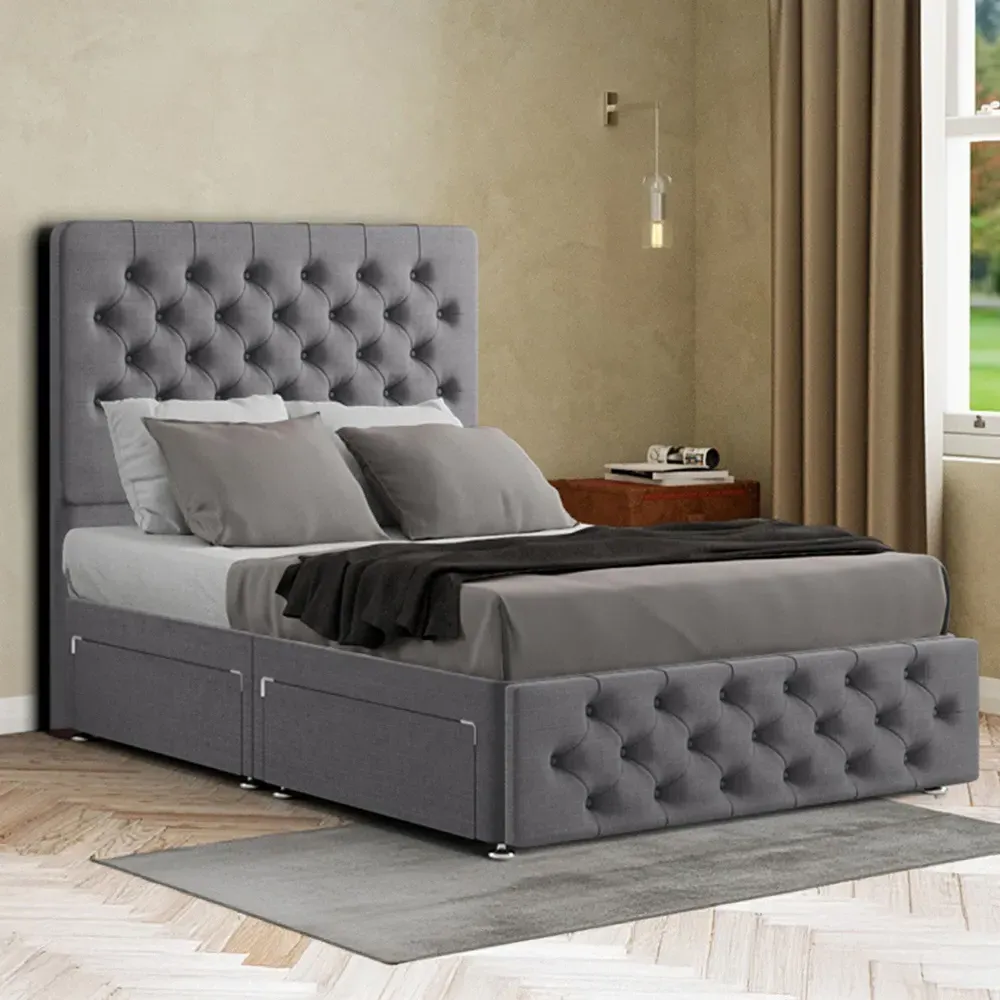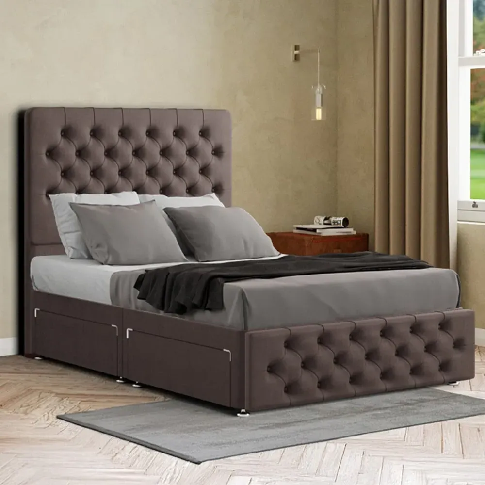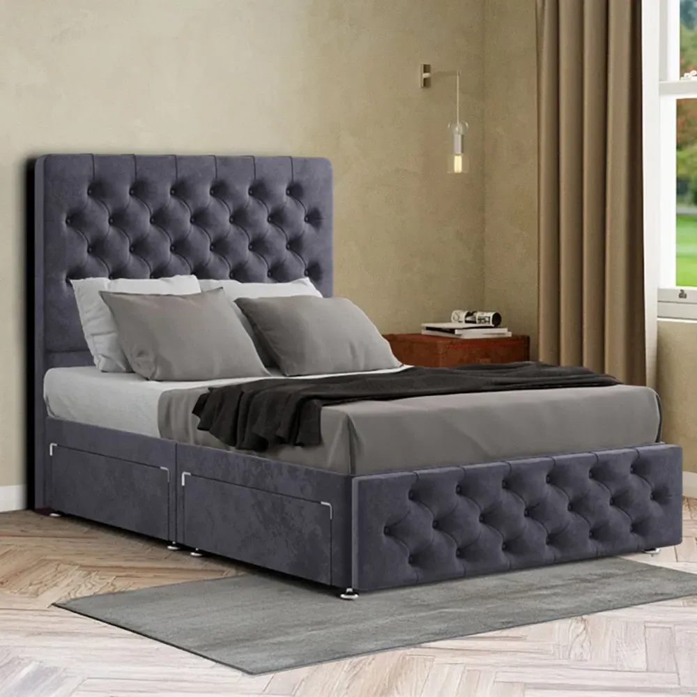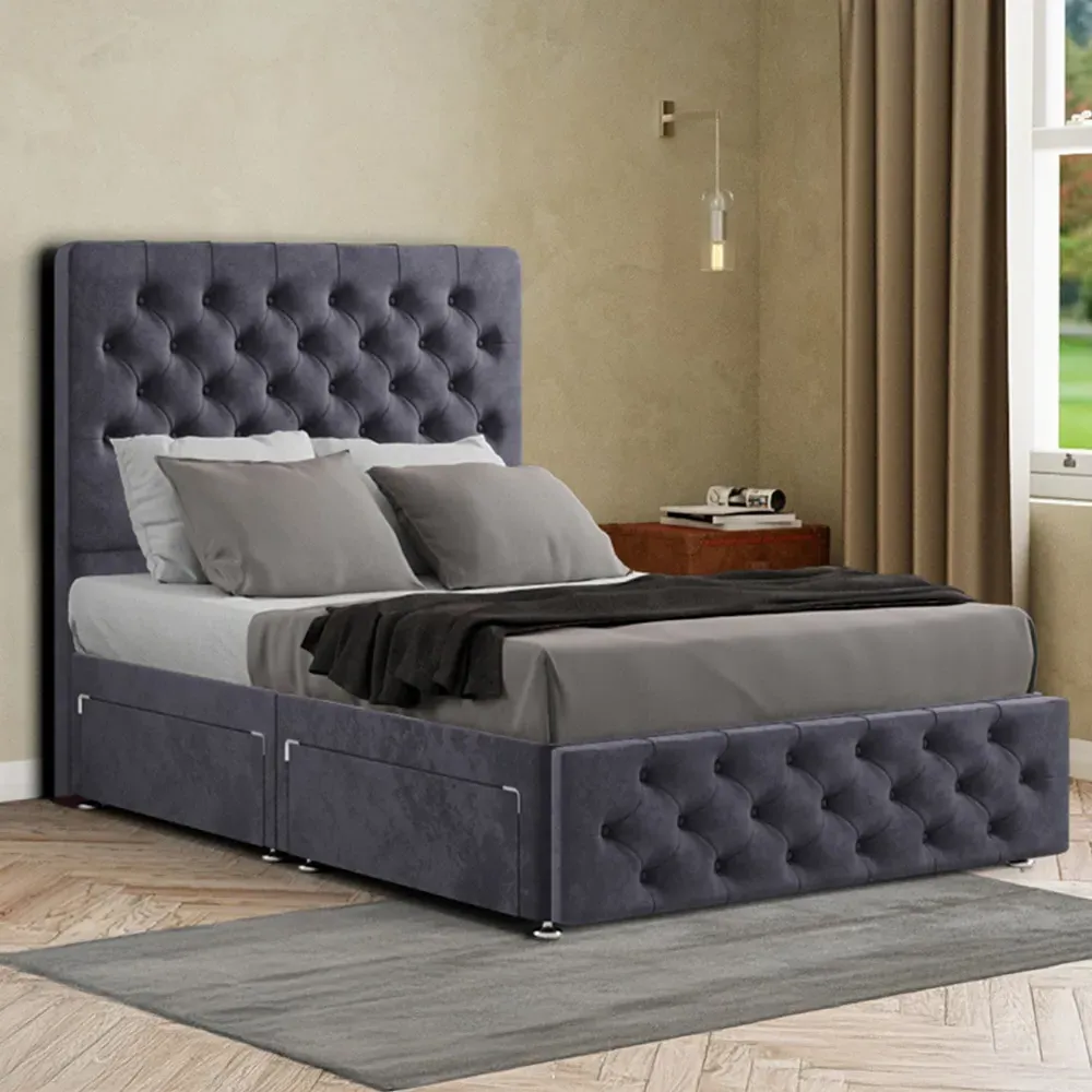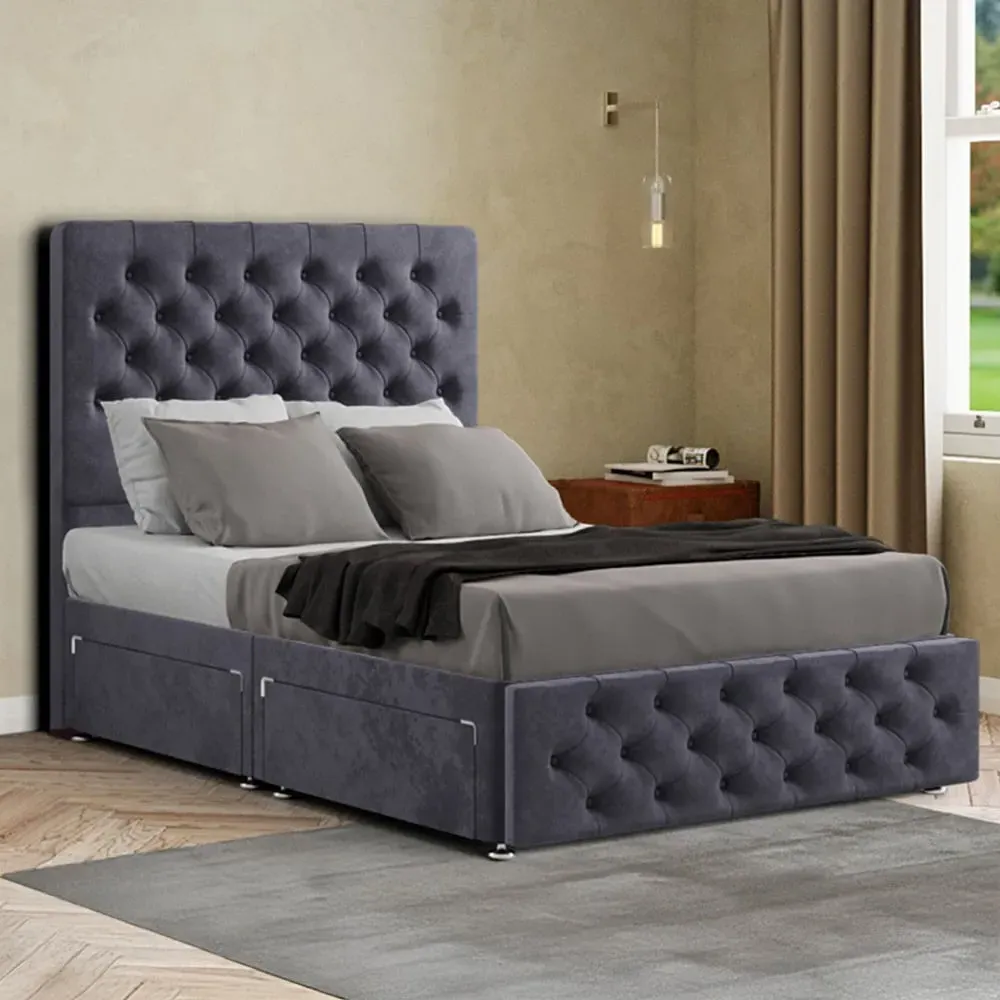 Introducing the Mary Chesterfield Divan Bed with 2 Drawers and a Floor Standing Headboard. Made in the UK with precision and care, the Mary Chesterfield Divan Bed is the epitome of luxury and style for your bedroom. Elevate Your Comfort: This elegant divan base comes equipped with two convenient drawers, providing ample storage space for your essentials while maintaining a sleek, clutter-free appearance. Attention to Detail: The exquisite Chesterfield design is adorned with matching buttons, creating a timeless and sophisticated look that complements any decor. Mattress Not Included: The Mary Chesterfield Divan Bed is ready to pair with your preferred mattress, allowing you to personalize your sleep experience. Premium Quality: Crafted with the utmost care and using high-quality materials, this divan bed is built to last, providing you with years of restful nights and stylish elegance. Upgrade your bedroom with the Mary Chesterfield Divan Bed and experience the epitome of comfort, style, and functionality. Make your bedroom a haven of luxury - order yours today.