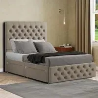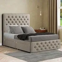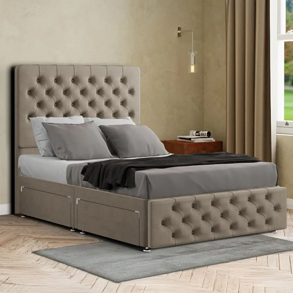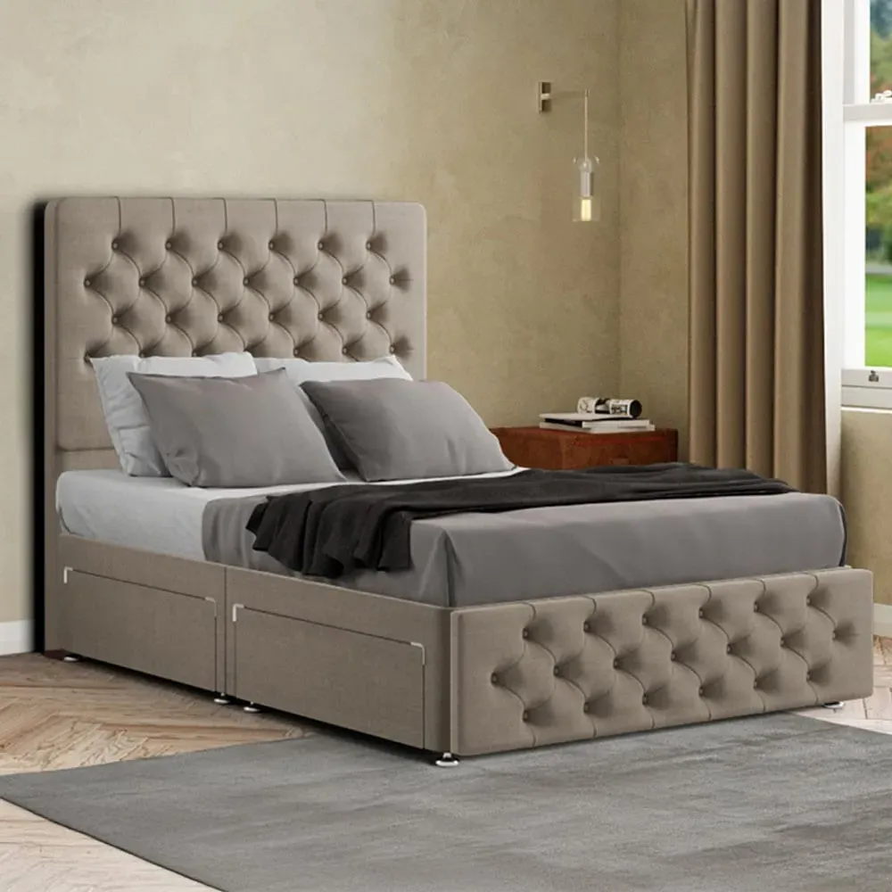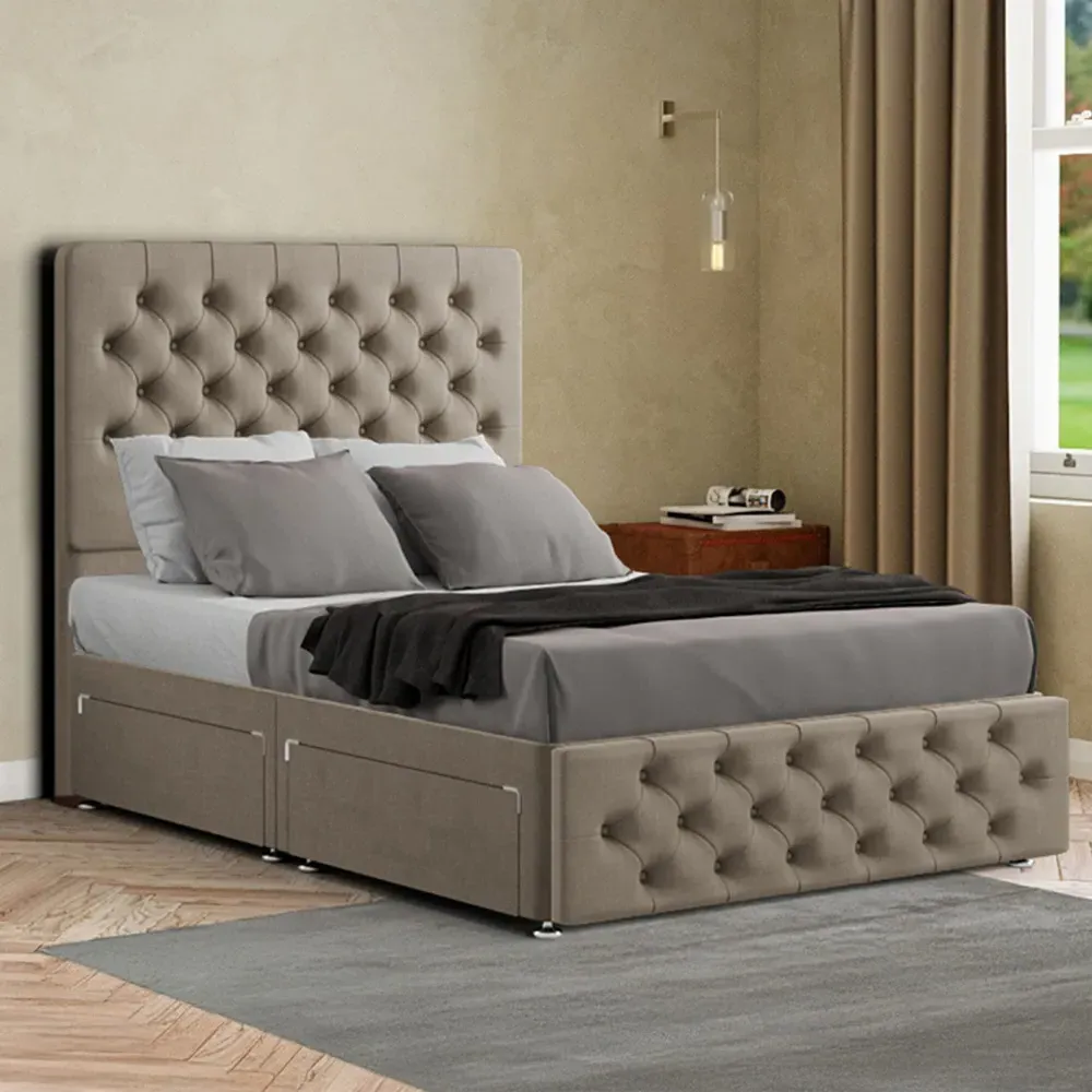 Introducing the Mary Chesterfield Divan Bed with 2 Drawers and a Floor Standing Headboard. Made in the UK with precision and care, the Mary Chesterfield Divan Bed is the epitome of luxury and style for your bedroom. Elevate Your Comfort: This elegant divan base comes equipped with two convenient drawers, providing ample storage space for your essentials while maintaining a sleek, clutter-free appearance. Attention to Detail: The exquisite Chesterfield design is adorned with matching buttons, creating a timeless and sophisticated look that complements any decor. Mattress Not Included: The Mary Chesterfield Divan Bed is ready to pair with your preferred mattress, allowing you to personalize your sleep experience. Premium Quality: Crafted with the utmost care and using high-quality materials, this divan bed is built to last, providing you with years of restful nights and stylish elegance. Upgrade your bedroom with the Mary Chesterfield Divan Bed and experience the epitome of comfort, style, and functionality. Make your bedroom a haven of luxury - order yours today.