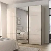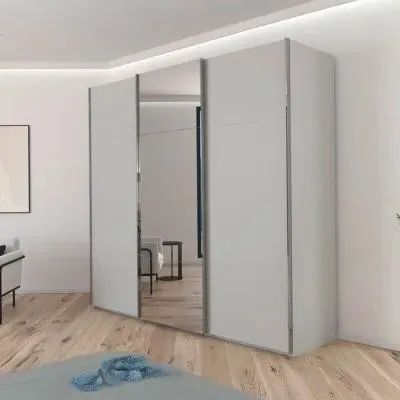 The Contido wardrobe combines spacious storage with sliding mirror doors that enhance room brightness while saving floor space. Its three-door design provides ample hanging and shelving options, while the included extras offer additional organization solutions. The Alpine White finish adds a clean, bright appearance that complements various decor styles. The sliding mechanism operates smoothly and the mirrored panels create an illusion of expanded space.