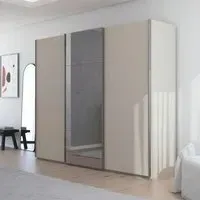 The Contido wardrobe offers generous storage with its 3-door sliding configuration, accented by mirrored surfaces that reflect light throughout the room. Its 271cm width accommodates extensive clothing collections, while the sliding doors operate smoothly without requiring swing space. The silk grey finish provides subtle elegance, and the extras enhance internal organization.