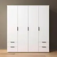The Essea wardrobe offers clean storage solutions with its four-door design and spacious interior compartments. Its Alpine White finish creates a bright, fresh appearance that complements various decor styles. The wide configuration provides ample hanging space for garments, while the sturdy construction ensures reliable daily use.