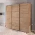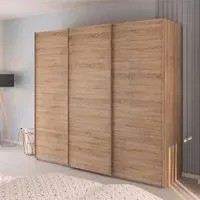 The Evelyn wardrobe offers generous storage capacity with its three sliding door configuration and 242cm width. Its Wild Oak finish provides rich wood grain character, while the sliding mechanism ensures smooth operation and space-efficient access. The internal layout accommodates both hanging garments and folded items with practical organization.