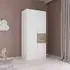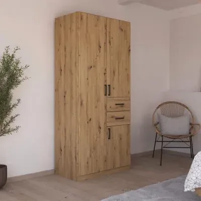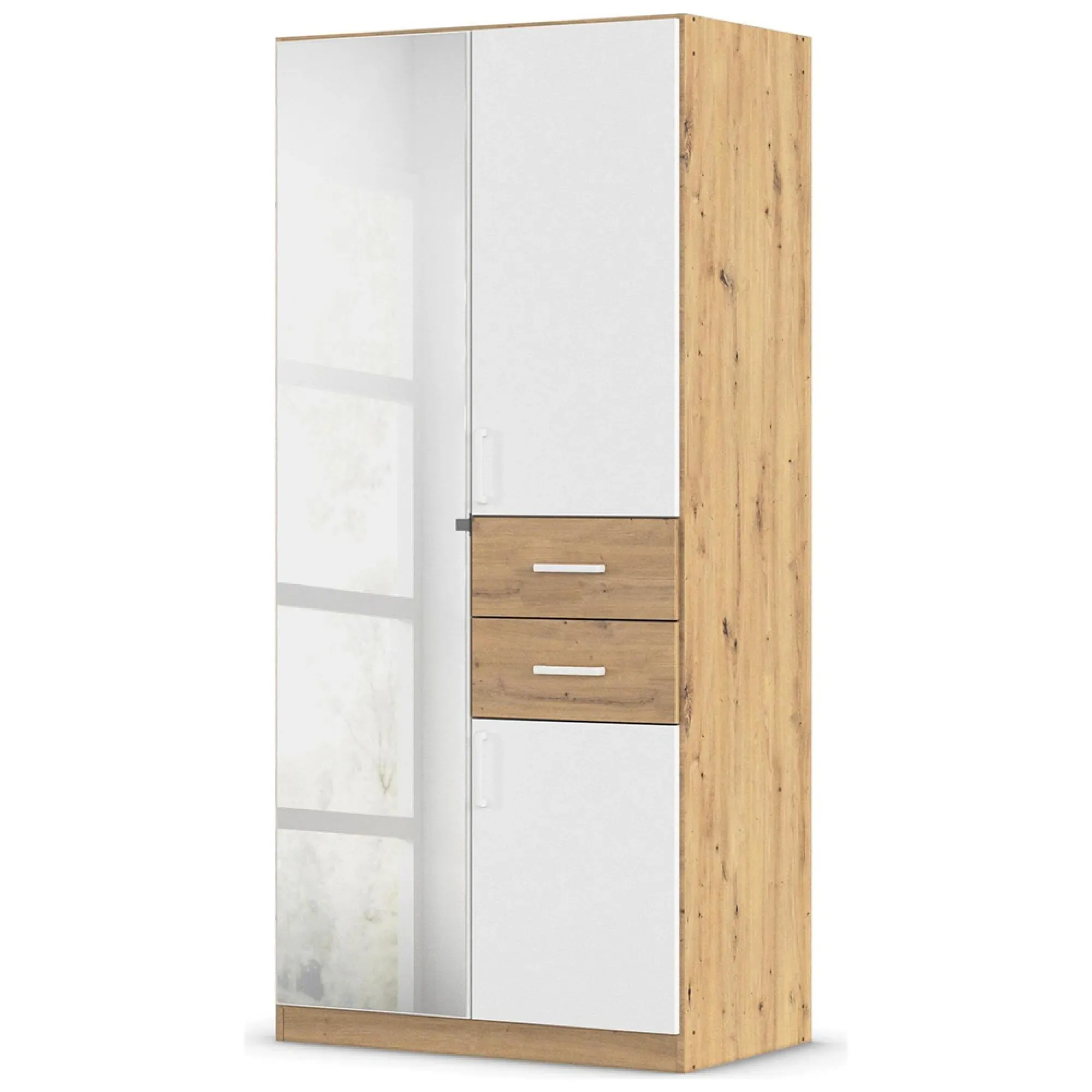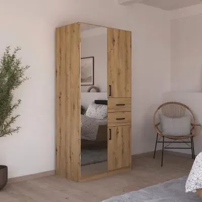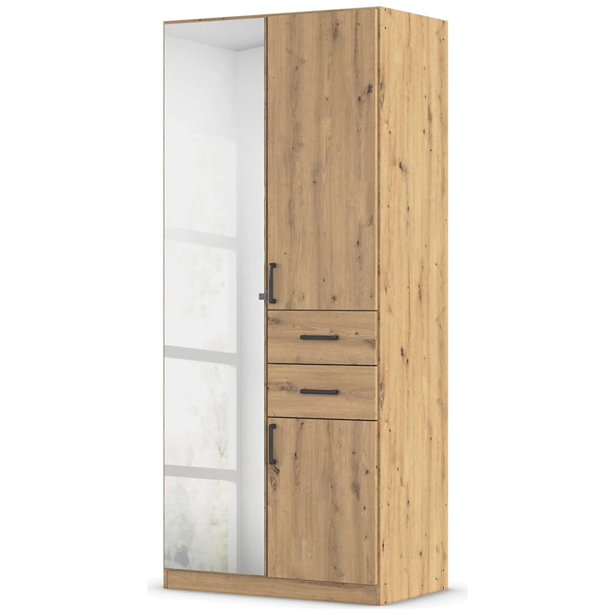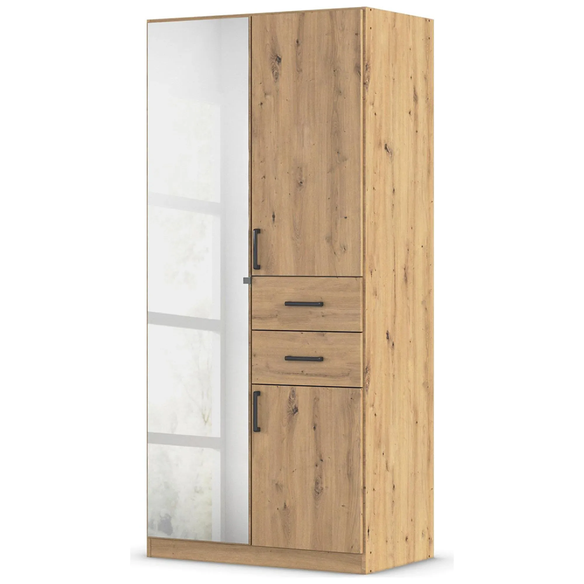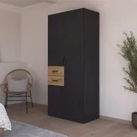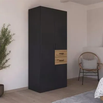 The Maika wardrobe provides comprehensive storage with its three-door structure, showcasing Metallic Dark Grey and Artisan Oak finishes for a striking two-tone effect. Its generous interior accommodates extensive clothing collections, while the natural oak grain adds warmth to the metallic base. The wardrobe delivers both functionality and visual appeal. W91 x H197 cm.