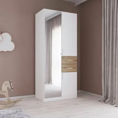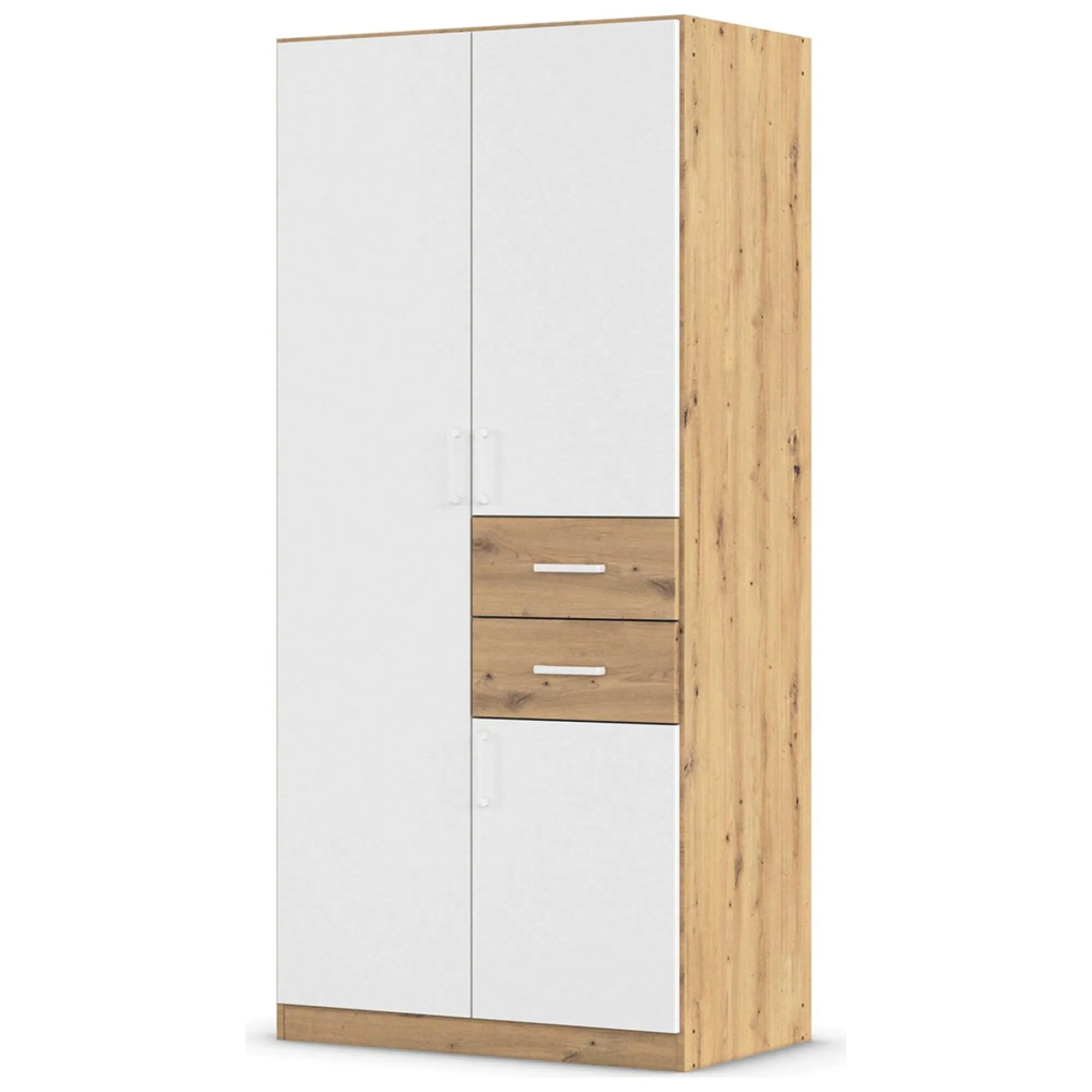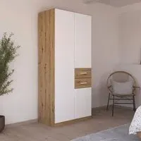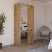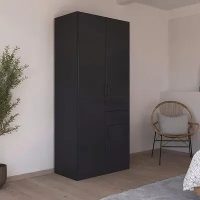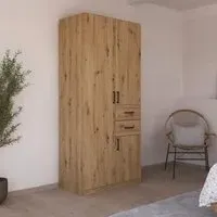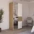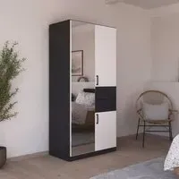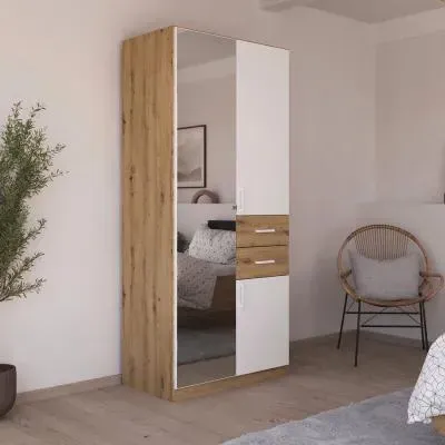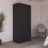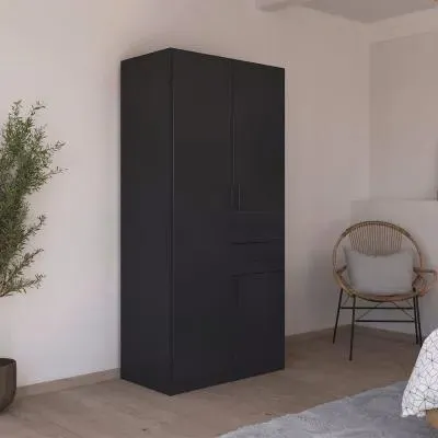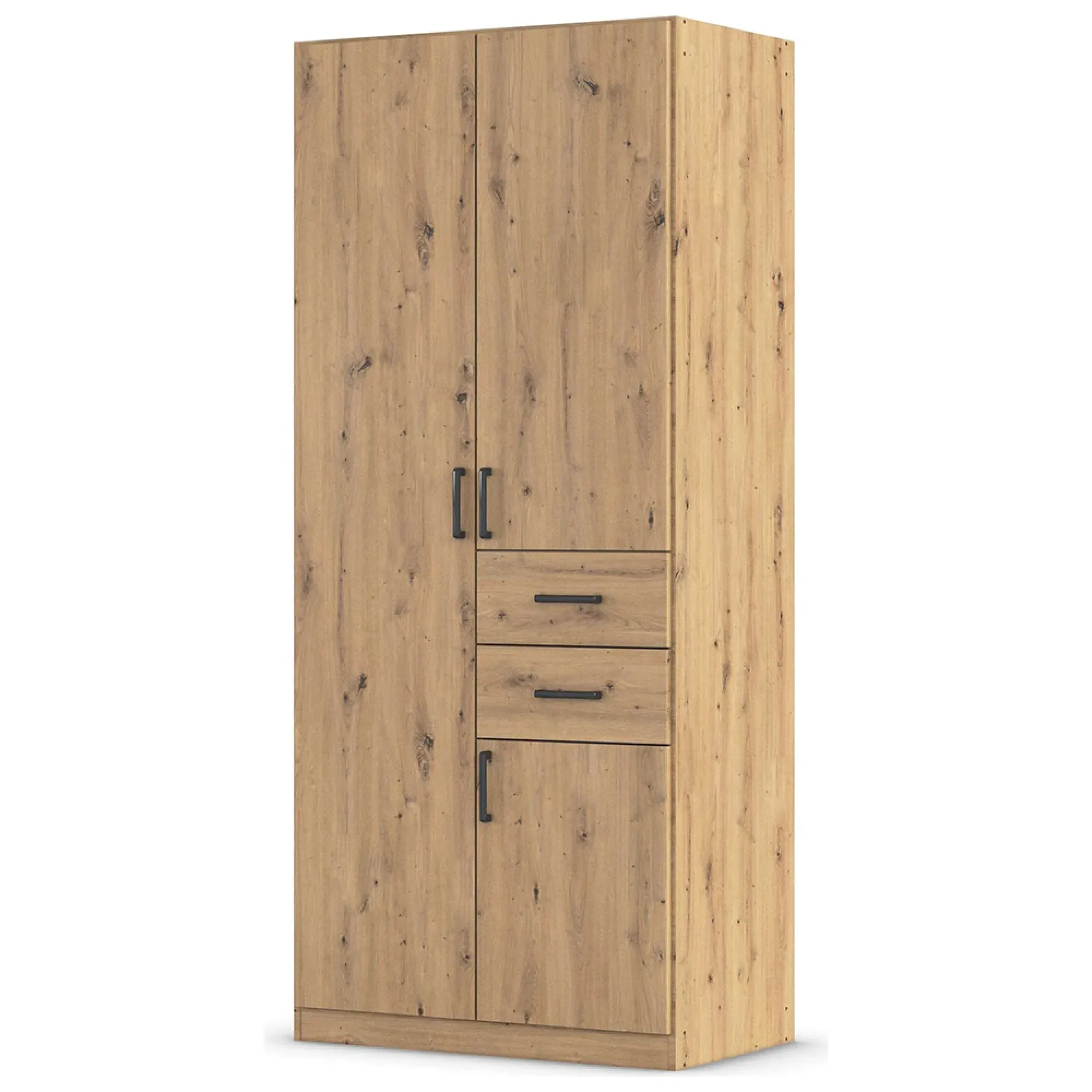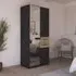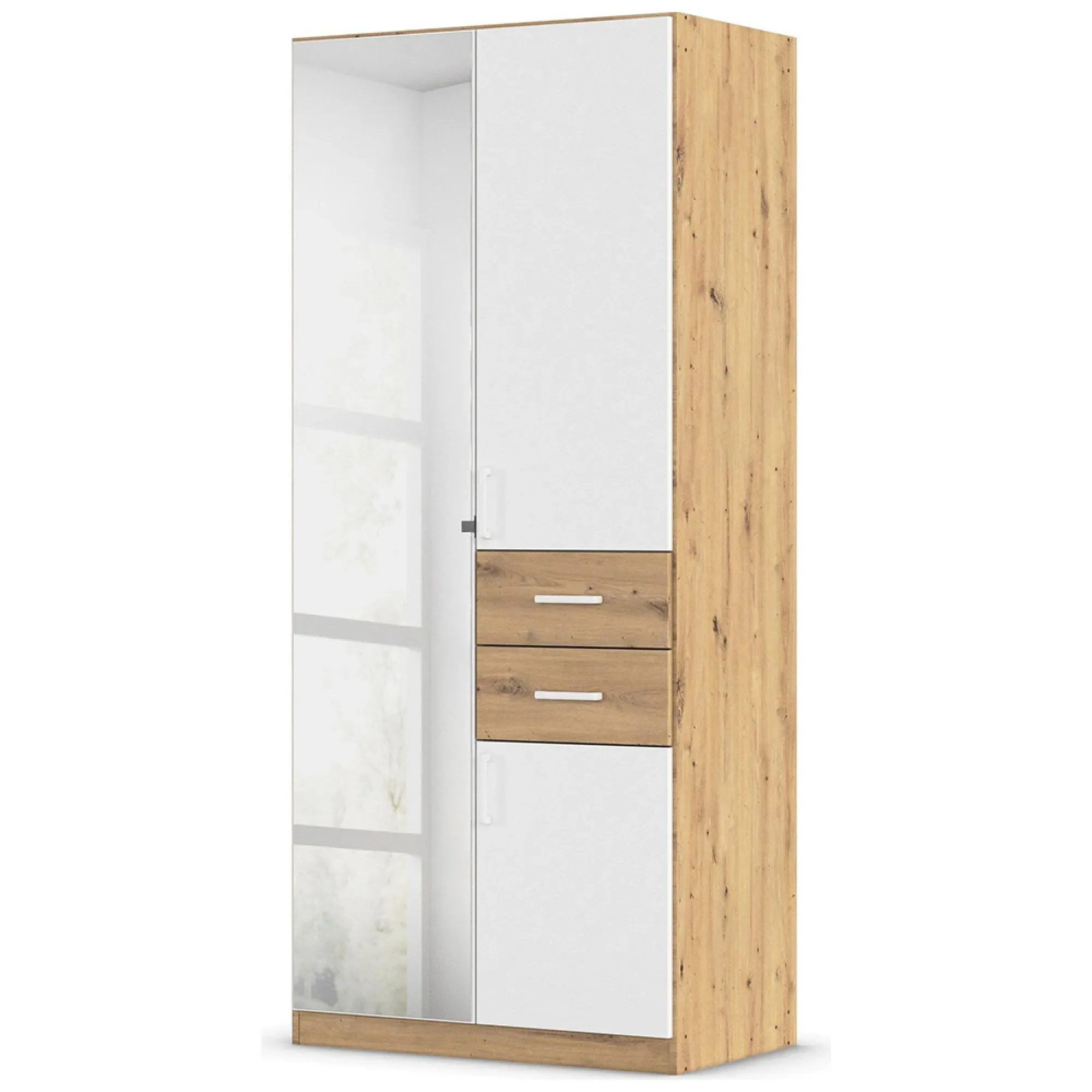 The Maika wardrobe provides comprehensive storage with its three-door structure, showcasing Metallic Dark Grey and Artisan Oak finishes for a striking two-tone effect. Its generous interior accommodates extensive clothing collections, while the natural oak grain adds warmth to the metallic base. The wardrobe delivers both functionality and visual appeal. W91 x H197 cm.
