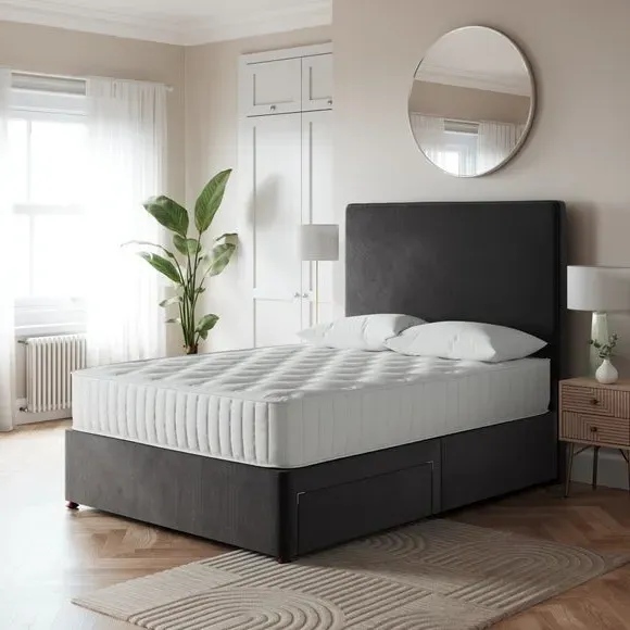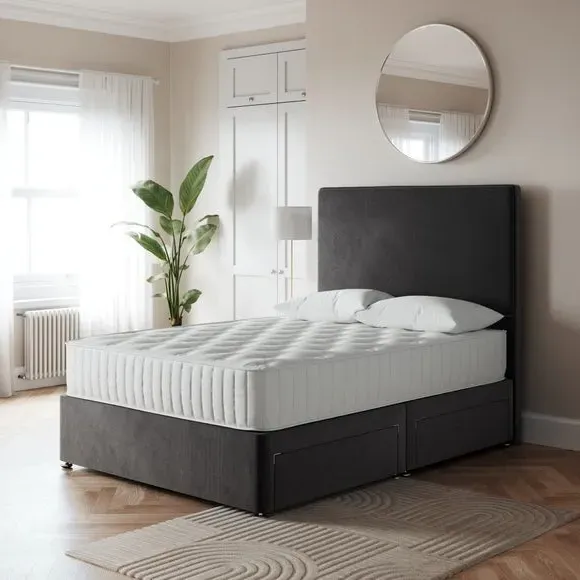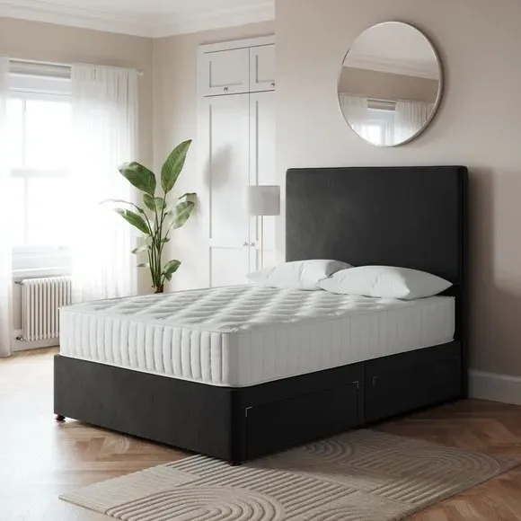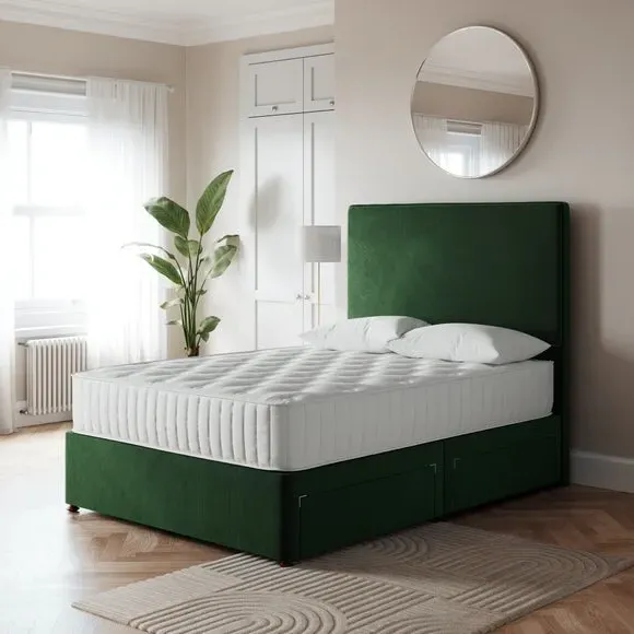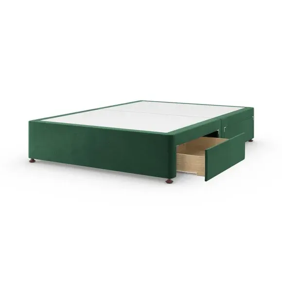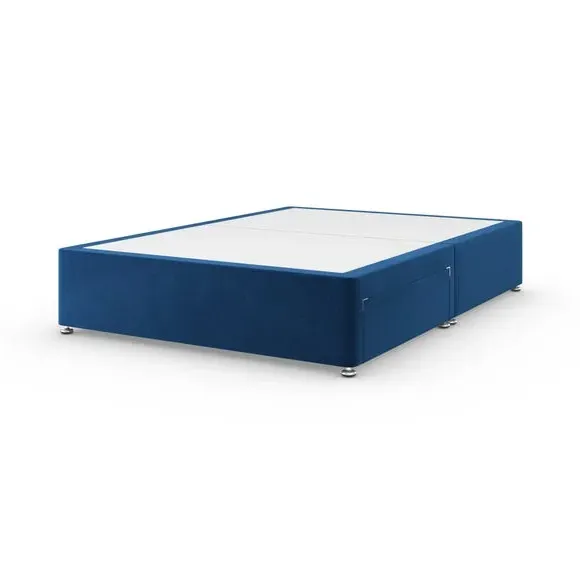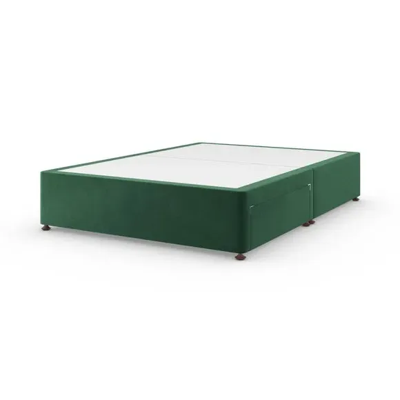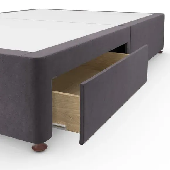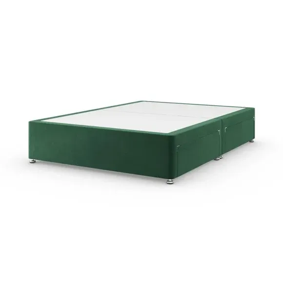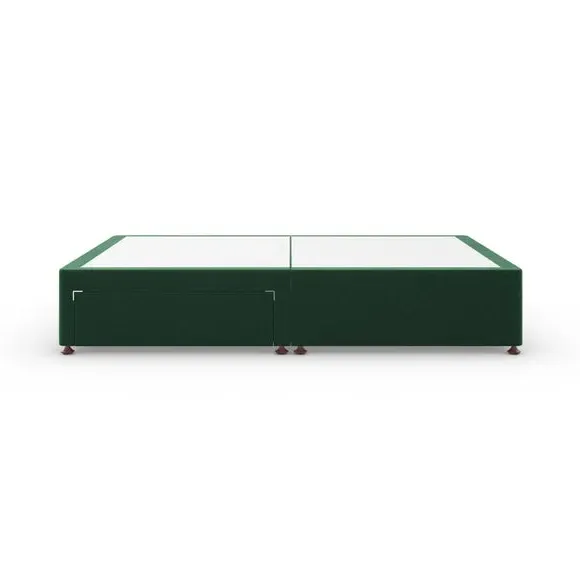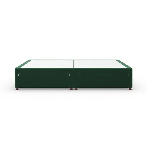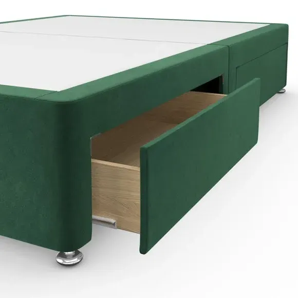 The divan base combines high quality timber construction with a platform top design for enhanced mattress support. Its padded velvet covering provides comfort and durability, while the reinforced frame ensures long-lasting stability. The base features chrome glider feet and accommodates various drawer storage options, making it both functional and stylish.