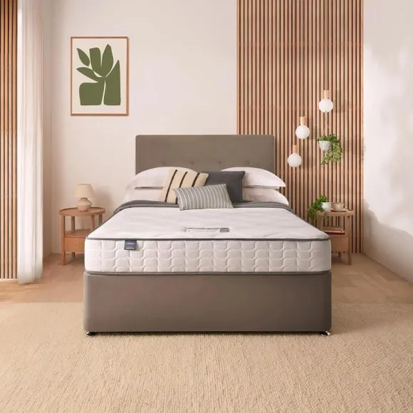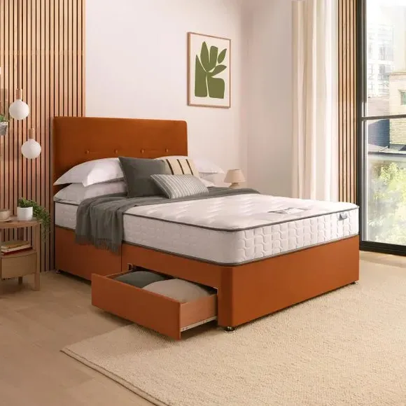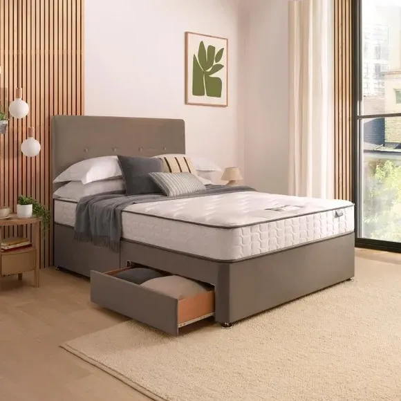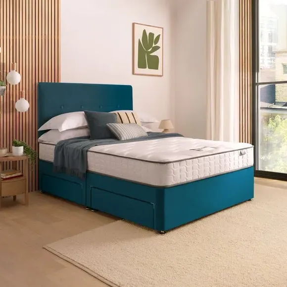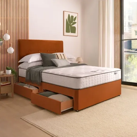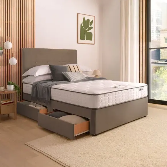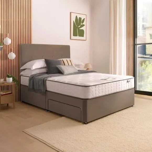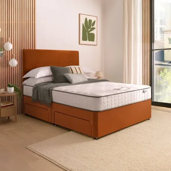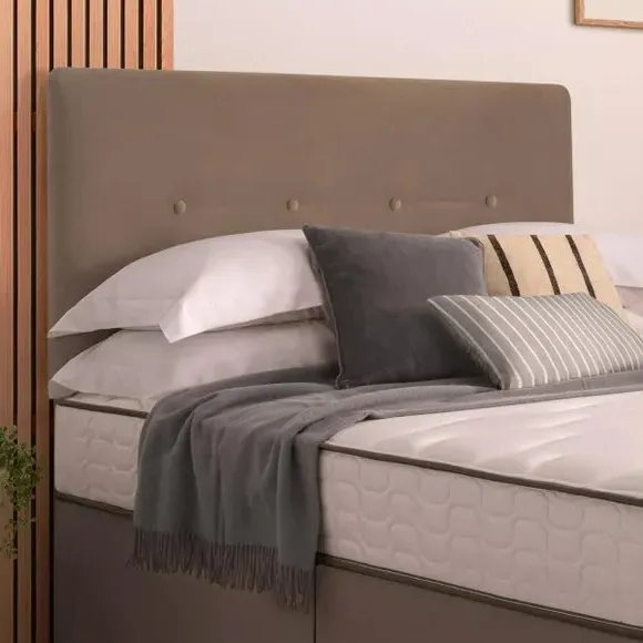 * Divan Bed* Bed Mounted Headboard* Includes Mattress* Trendy and Soft Velvet Upholstery This all-inclusive divan set seamlessly marries functionality and elegance, featuring a refined headboard, and an extraordinary 800 pocket mattress. Silentnight's cutting-edge Mirapocket technology takes centre stage, providing 800 individual pocket springs for unparalleled comfort, support, and pressure relief. The zoned Mirapocket support system ensures even weight distribution, promoting effortless movement and enhancing spinal alignment, while the edge-to-edge support creates a haven for an undisturbed night's sleep. The mattress's responsive pocket springs adapt to your body weight, delivering a luxurious blend of comfort and personalised support. Plump filling layers and a sumptuously soft knitted mattress cover add to the lavishness, with a hypoallergenic finish for peace of mind. The medium-firm comfort rating caters to those who transition between back and side sleeping positions. Please note, the mattress binding colour may differ slightly from image. This does not affect the quality or use of the final product.