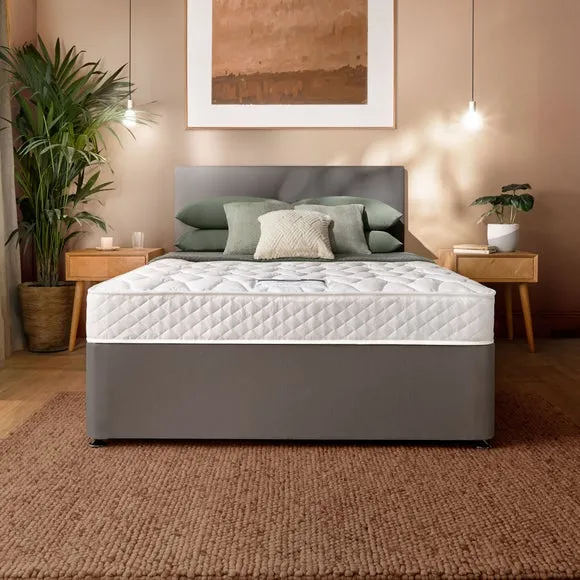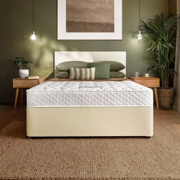 * Mattress and Divan Base set* Open coil sprung mattress* Suitable for back sleepers, with firm comfort* Multiple storage options available* 5 year guarantee The Silentnight everyday mattress and divan set is a complete sleep solution, combining supportive comfort with a stylish and practical base. Featuring 323 open coil springs, the Essentials rolled sprung mattress provides consistent support and minimises motion transfer for a more restful sleep. Its breathable fibers help regulate temperature, ensuring comfort throughout the night. Double-sided for durability, this mattress requires regular turning to maintain its shape and support. The divan base offers a sleek, modern foundation, available in various fabric finishes to complement any bedroom. Choose from options with or without built-in drawers for added storage.
