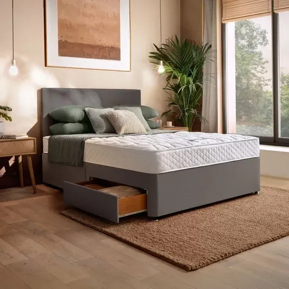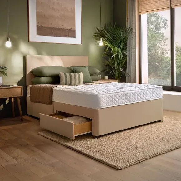 The mattress and divan set combines firm support with practical storage solutions. Its 323 open coil springs provide consistent support and minimise motion transfer, while breathable fibres help regulate temperature throughout the night. The double-sided mattress requires regular turning for durability, and the divan base offers multiple storage options with built-in drawers.
