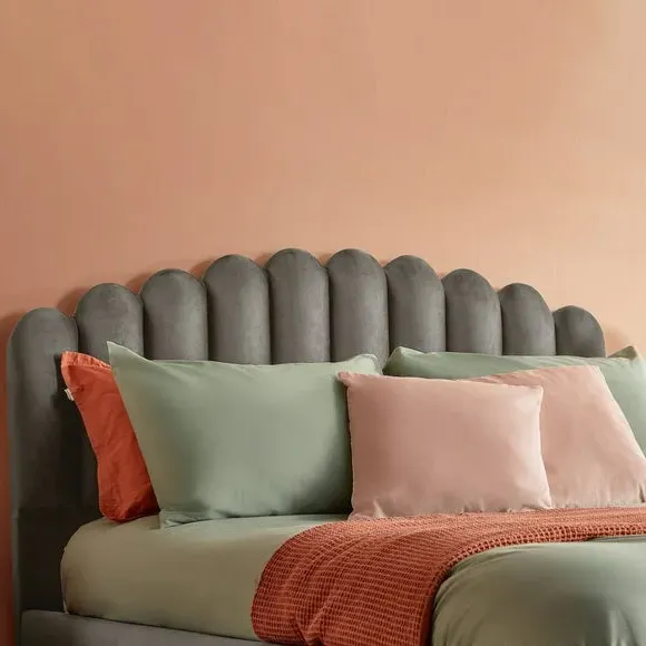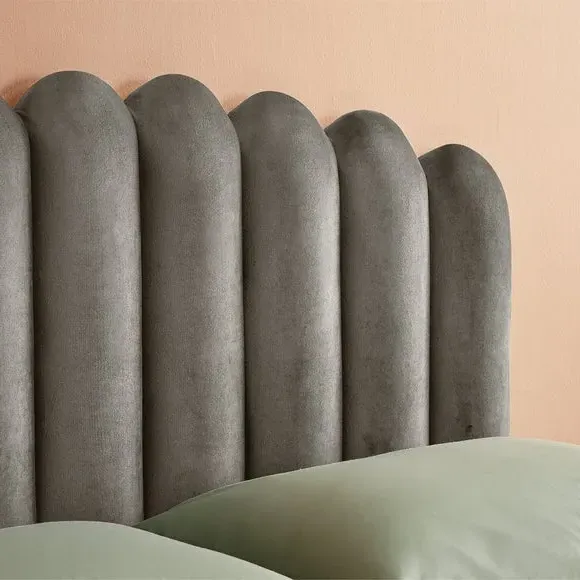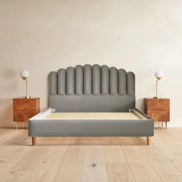 * Glamorous style* Fan shaped headboard* Soft upholstery* Wooden legs* Handcrafted in the UK With its distinctive fan-shaped headboard and sumptuous finish, this trend-setting bed frame sets the tone for the rest of your room. Handcrafted right here in the UK, it boasts an upholstered design in luxurious velvet fabric, available in a range of captivating colours to suit your style. For indulgent comfort, the headboard is generously filled with plush soft cushioning, providing ample support for those lazy mornings. Featuring slanted wooden legs, the Oriana makes a striking statement in any setting.