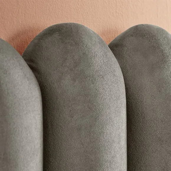 The bed frame combines glamorous style with its distinctive fan-shaped headboard, upholstered in luxurious velvet fabric. Its generously cushioned headboard provides comfortable support, while the handcrafted UK construction ensures quality durability. The soft upholstery adds sumptuous comfort, and the slanted wooden legs create a striking foundation.