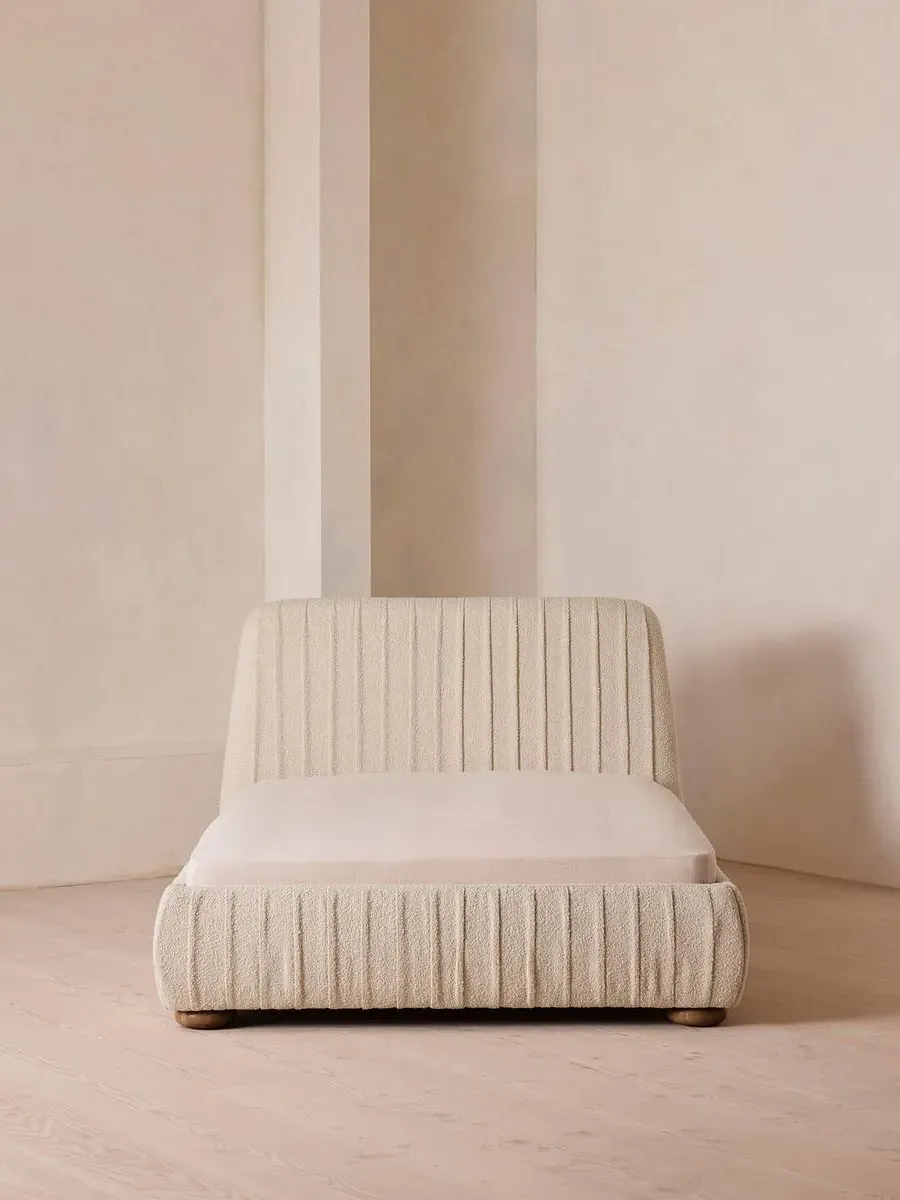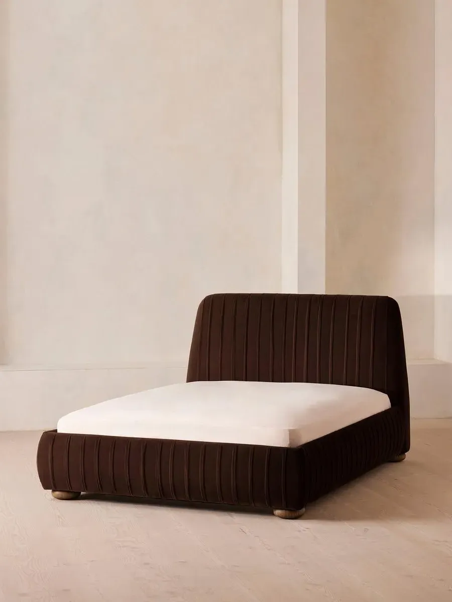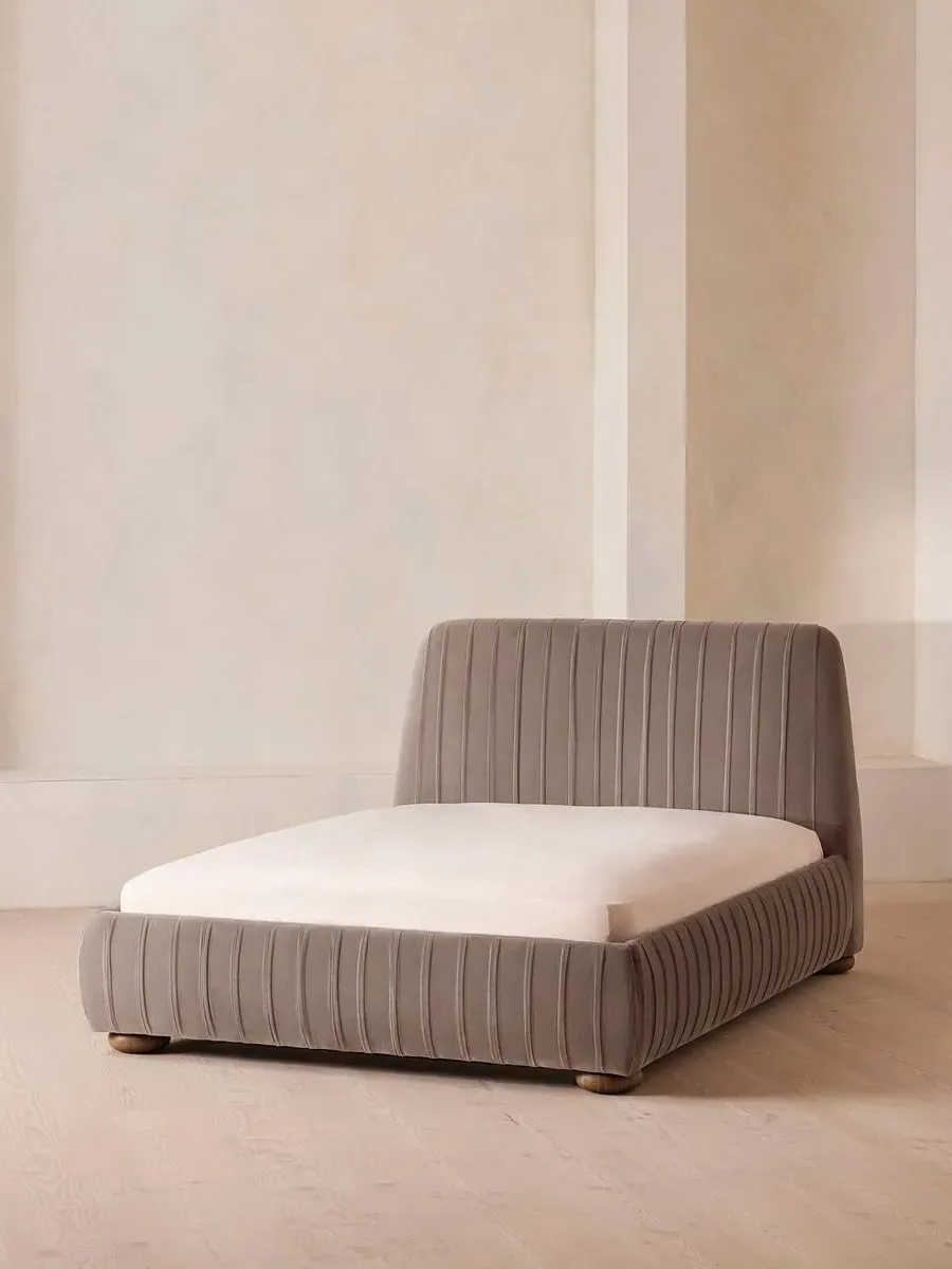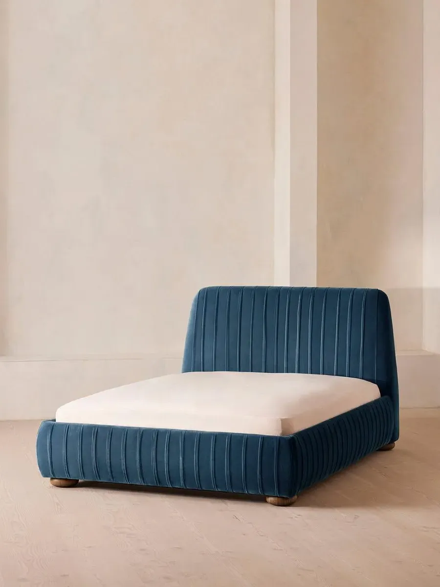 Inspired by our members' favourite Vivienne sofa on the eighth floor of White City House, the Vivienne bed is a reiteration of our House icon with pleated stitch detailing on the headboard as a play on texture. Upholstered in rich velvet, it rests on oversized solid oak bun feet and is designed to be the focal point of your bedroom to build around with other prints and fabrics.