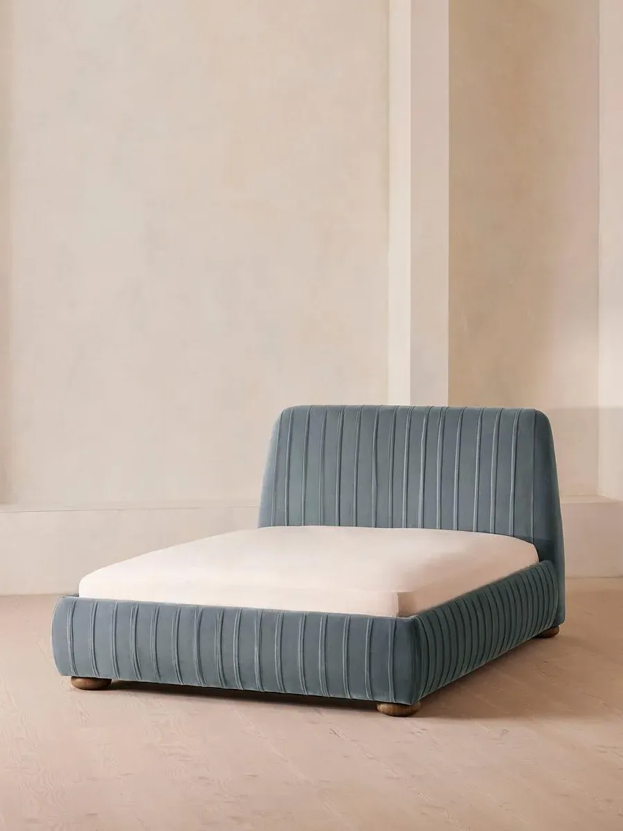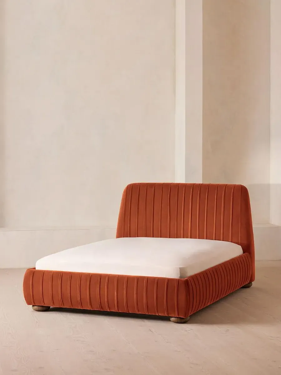 The bed offers luxurious comfort with its rich velvet upholstery, featuring pleated stitch detailing on the headboard for textural appeal. Its oversized solid oak bun feet provide sturdy support, while the plush velvet construction adds warmth and sophistication. The pleated headboard creates visual interest and serves as a striking focal point.