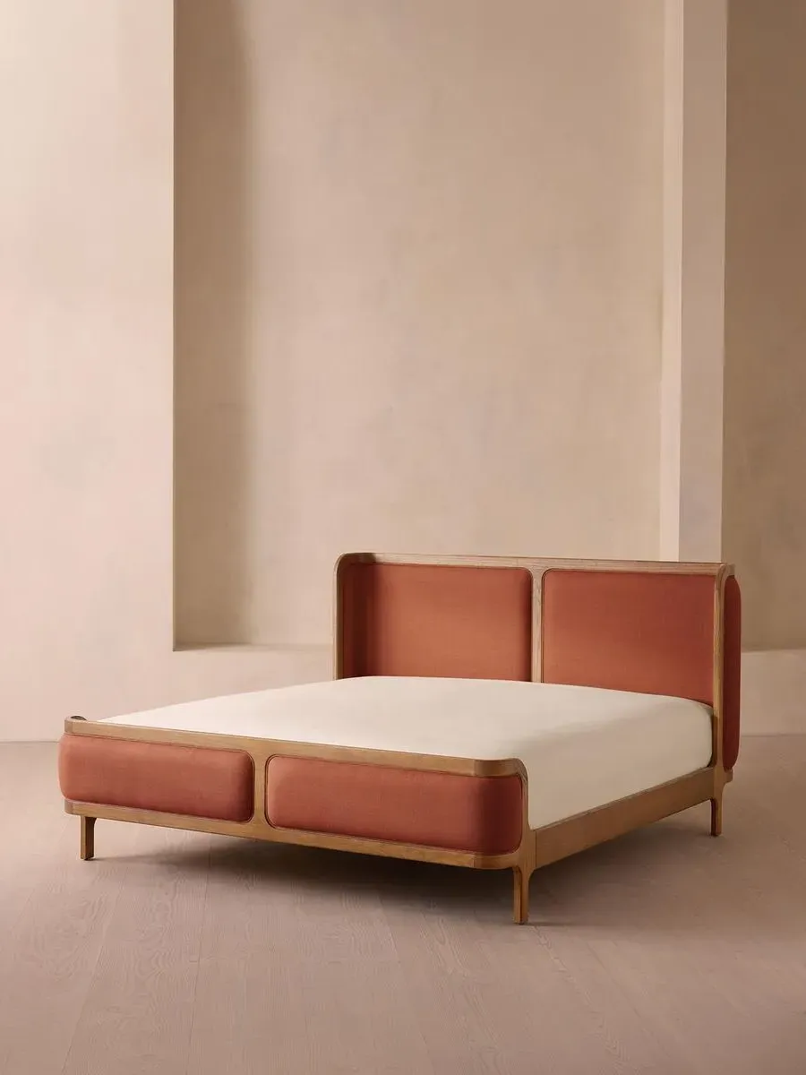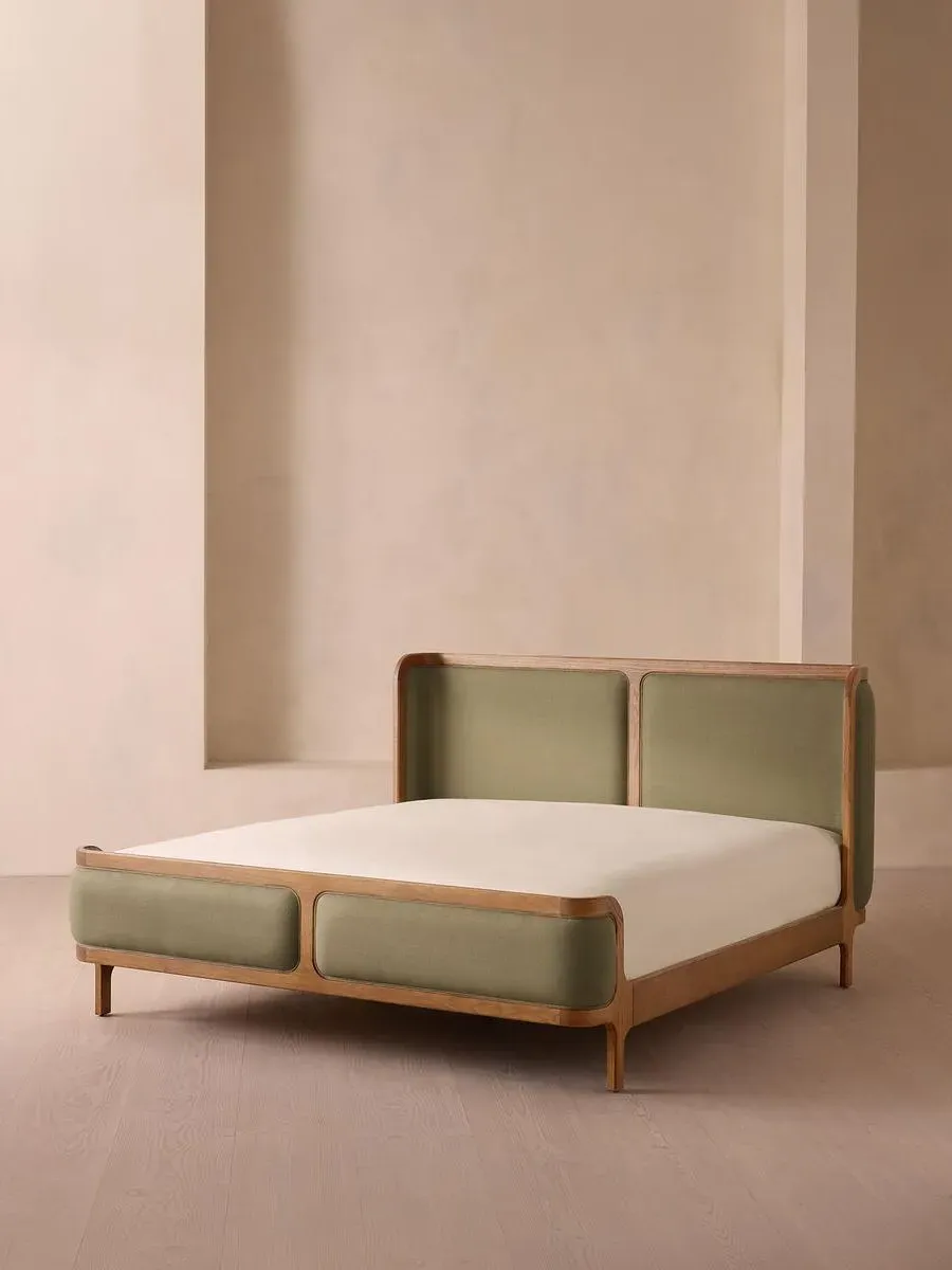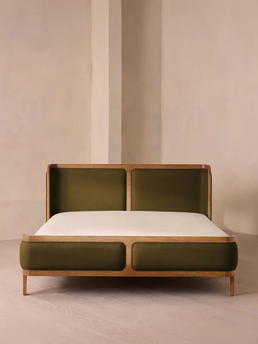 A wraparound headboard and footboard upholstered in velvet create an enveloping silhouette. The solid oak frame of our Belsa bed is softened by a curved headboard and footboard, both wrapped in bespoke shades of velvet upholstery. Taking cues from the beds at White City House, it creates a cosy, inviting set-up with a mix of textiles, like cushions and blankets from the collection.