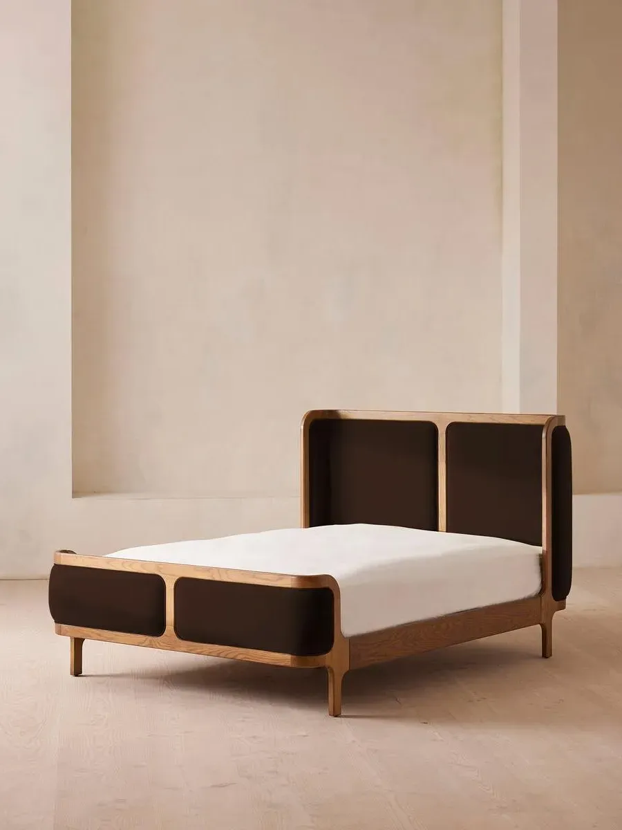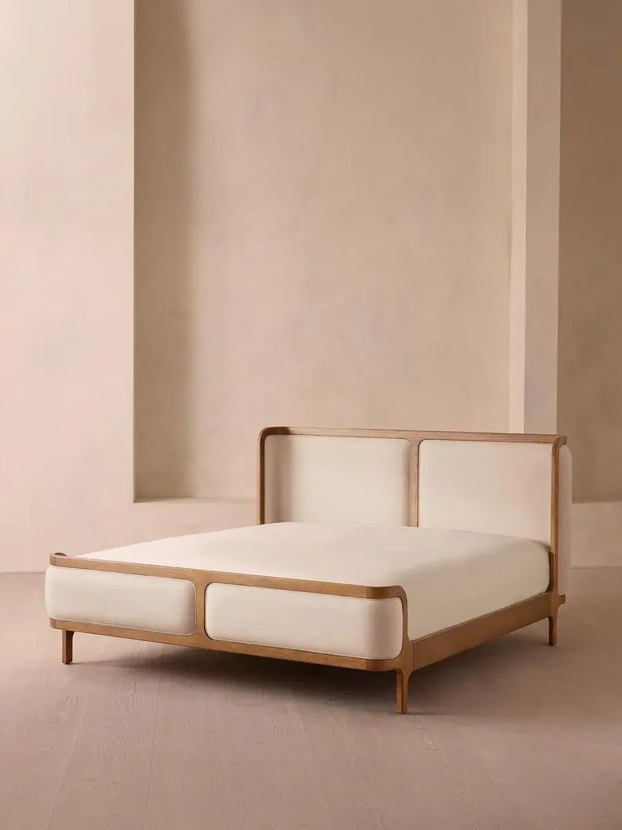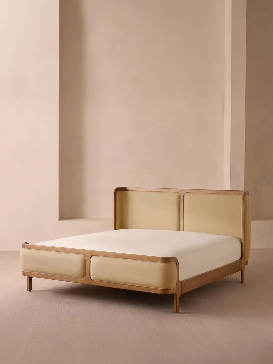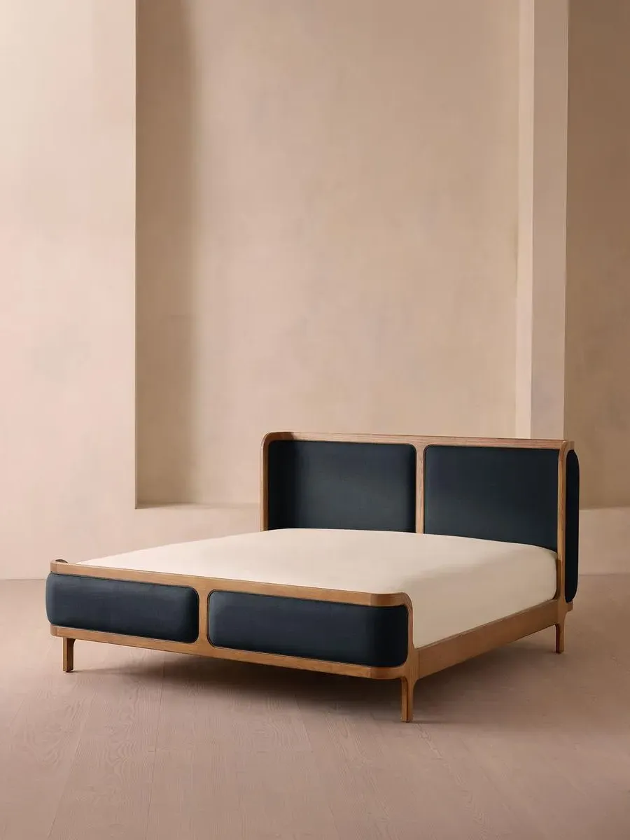 A wraparound headboard and footboard upholstered in velvet create an enveloping silhouette. The solid oak frame of our Belsa bed is softened by a curved headboard and footboard, both wrapped in bespoke shades of velvet upholstery. Taking cues from the beds at White City House, it creates a cosy, inviting set-up with a mix of textiles, like cushions and blankets from the collection.