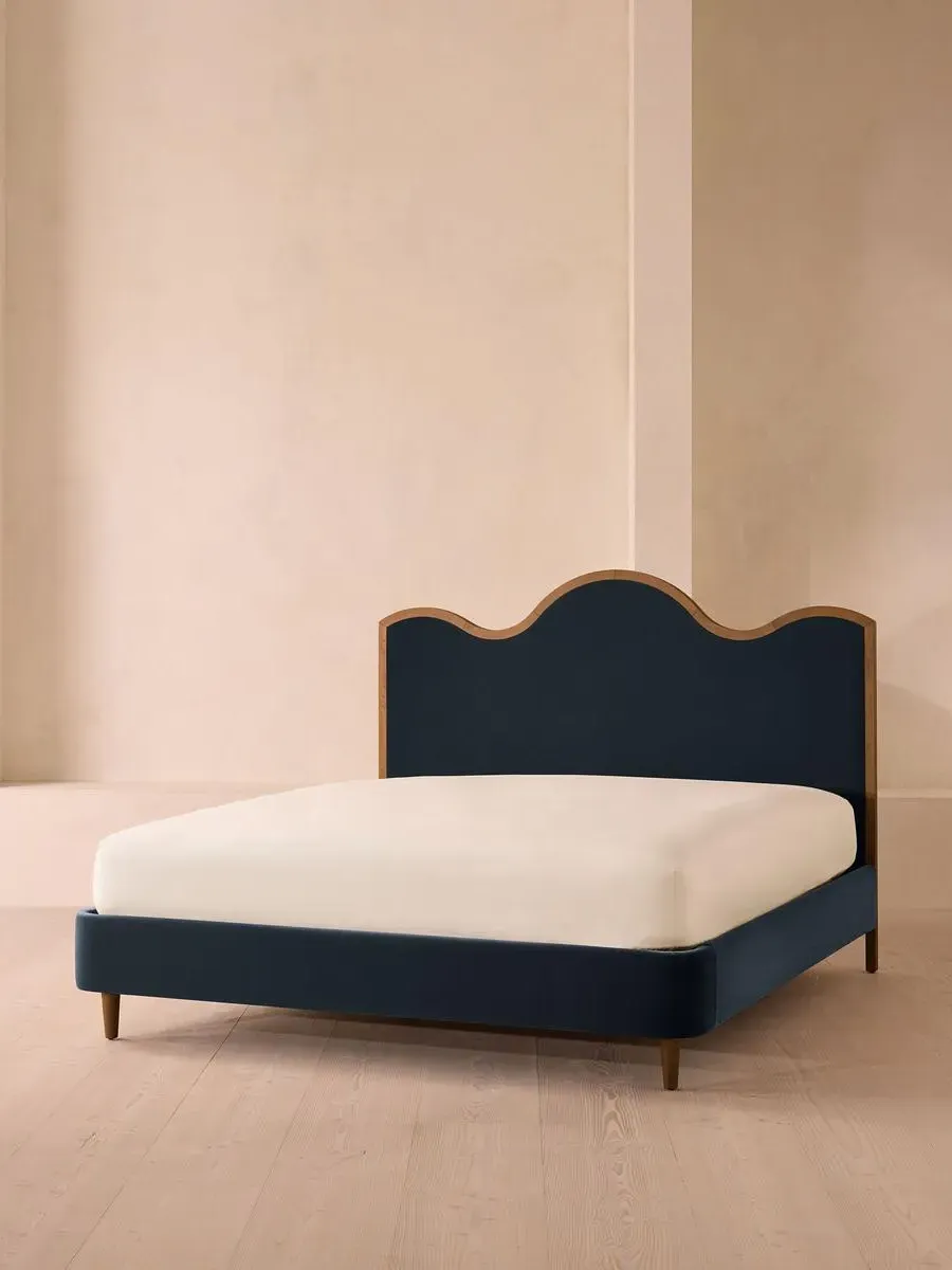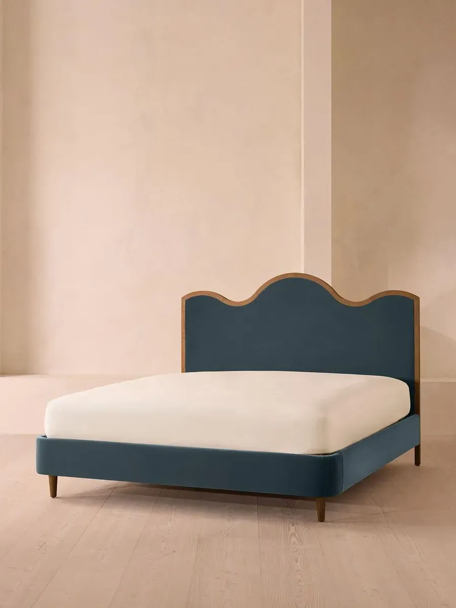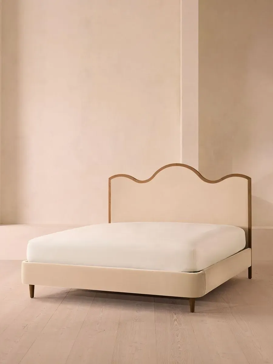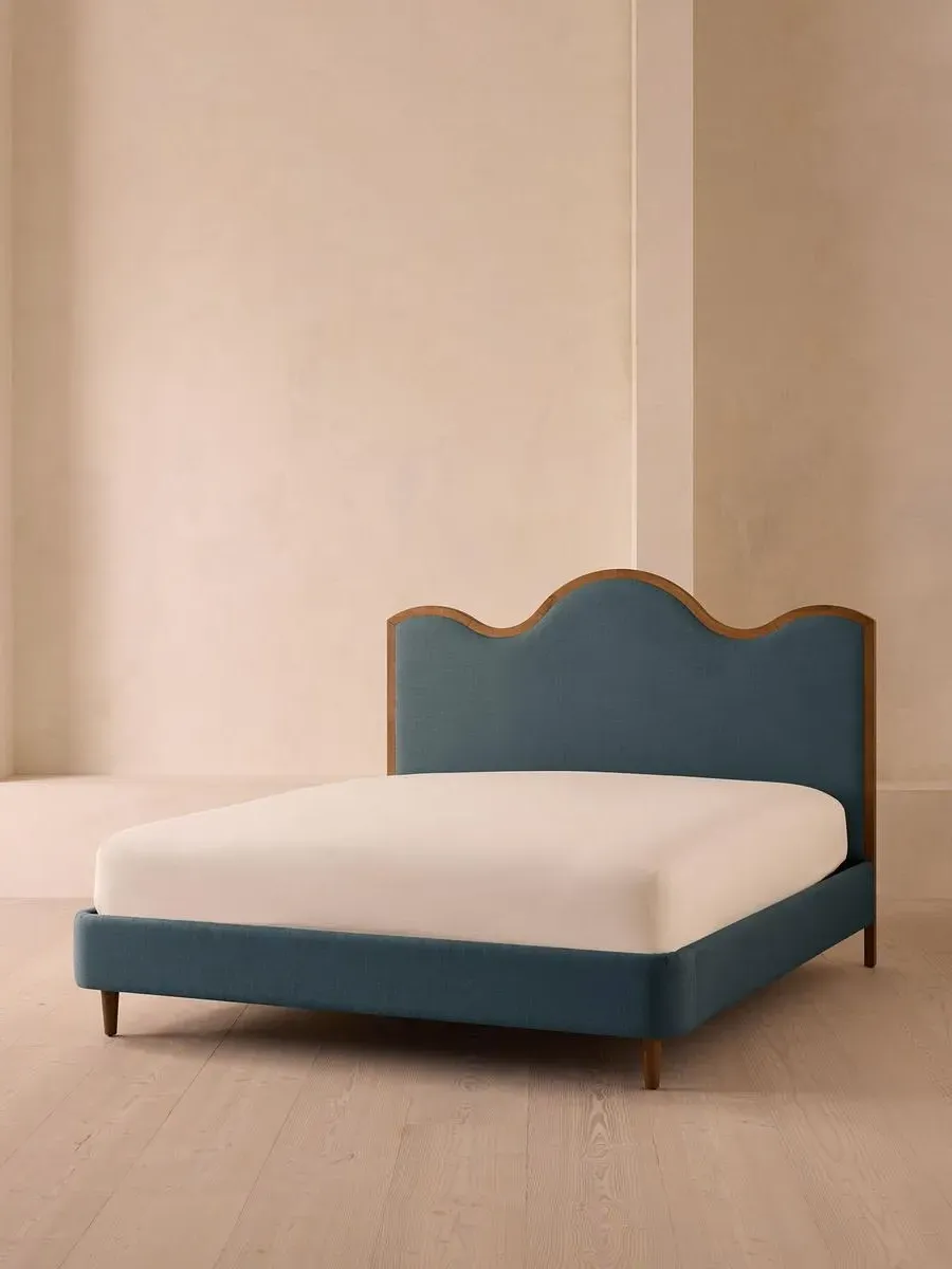 A waved headboard fully upholstered in linen is framed with a solid oak border. The solid oak frame of our Aubrey bed creates a low, relaxed profile perched on tapered wooden legs. Characterised by its eye-catching, waved headboard, this style is upholstered in linen designed to match back to the rest of our collection.
